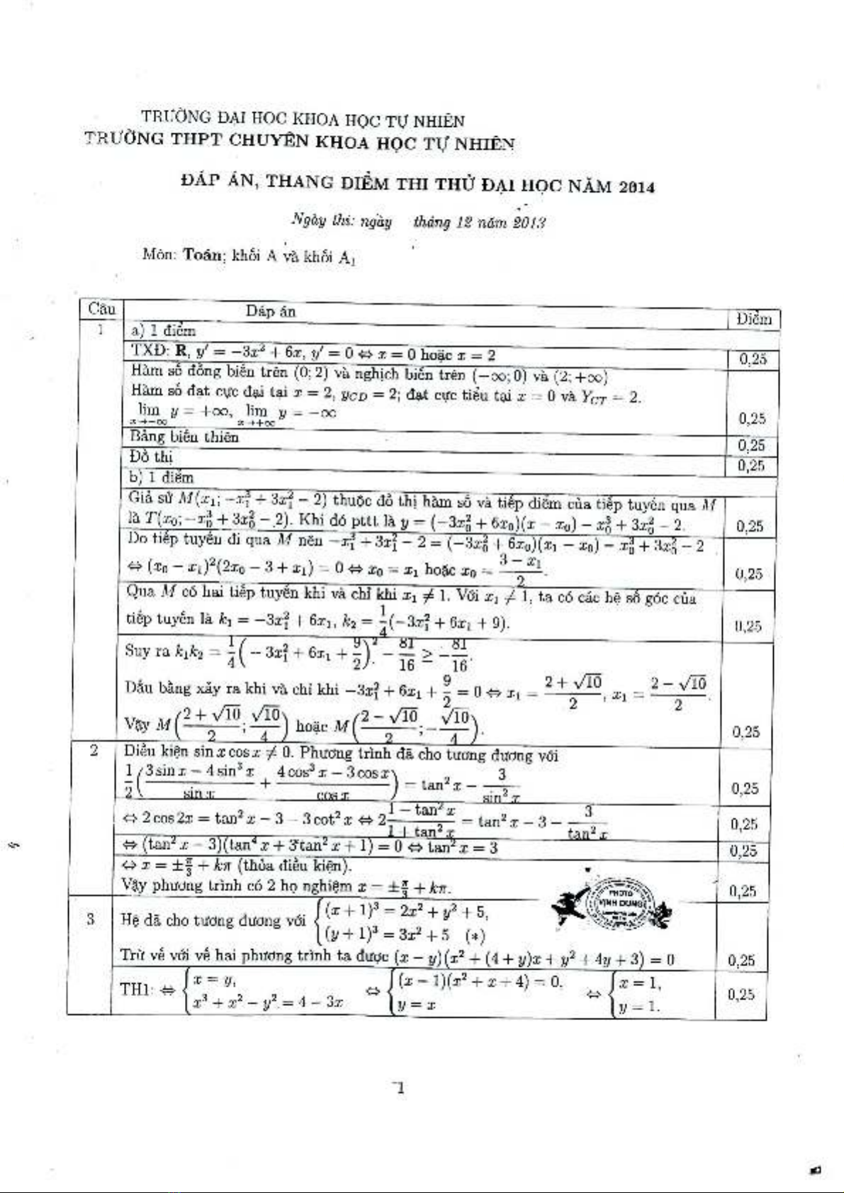 Đề thi thử Đại học môn Toán 2014 khối A,A1 - THPT Chuyên KHTN