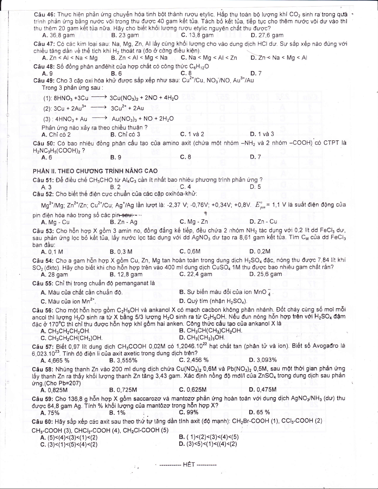 cau 57: Bi6t 0,97 tit dung dich CH3COOH 0,02M c6 1,2046.1022 hat chdt tan (phAn trl vd ion). Bi6t s6 Avogadro ldr
