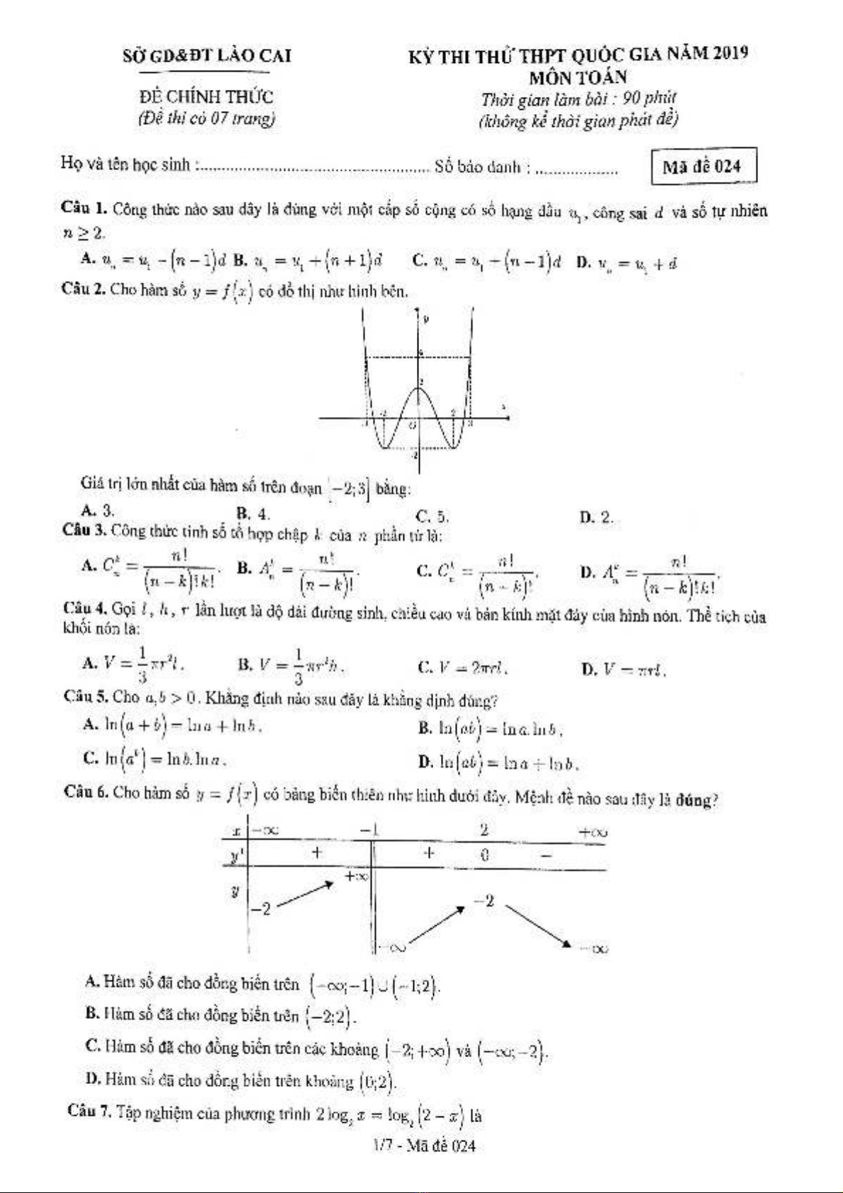 Đề thi thử THPT Quốc gia môn Toán năm 2019 có đáp án - Sở GD&ĐT Lào Cai
