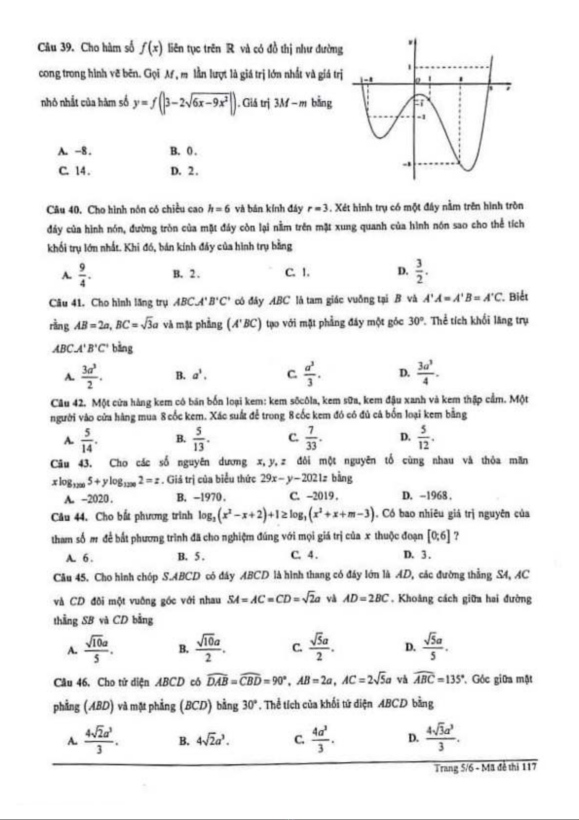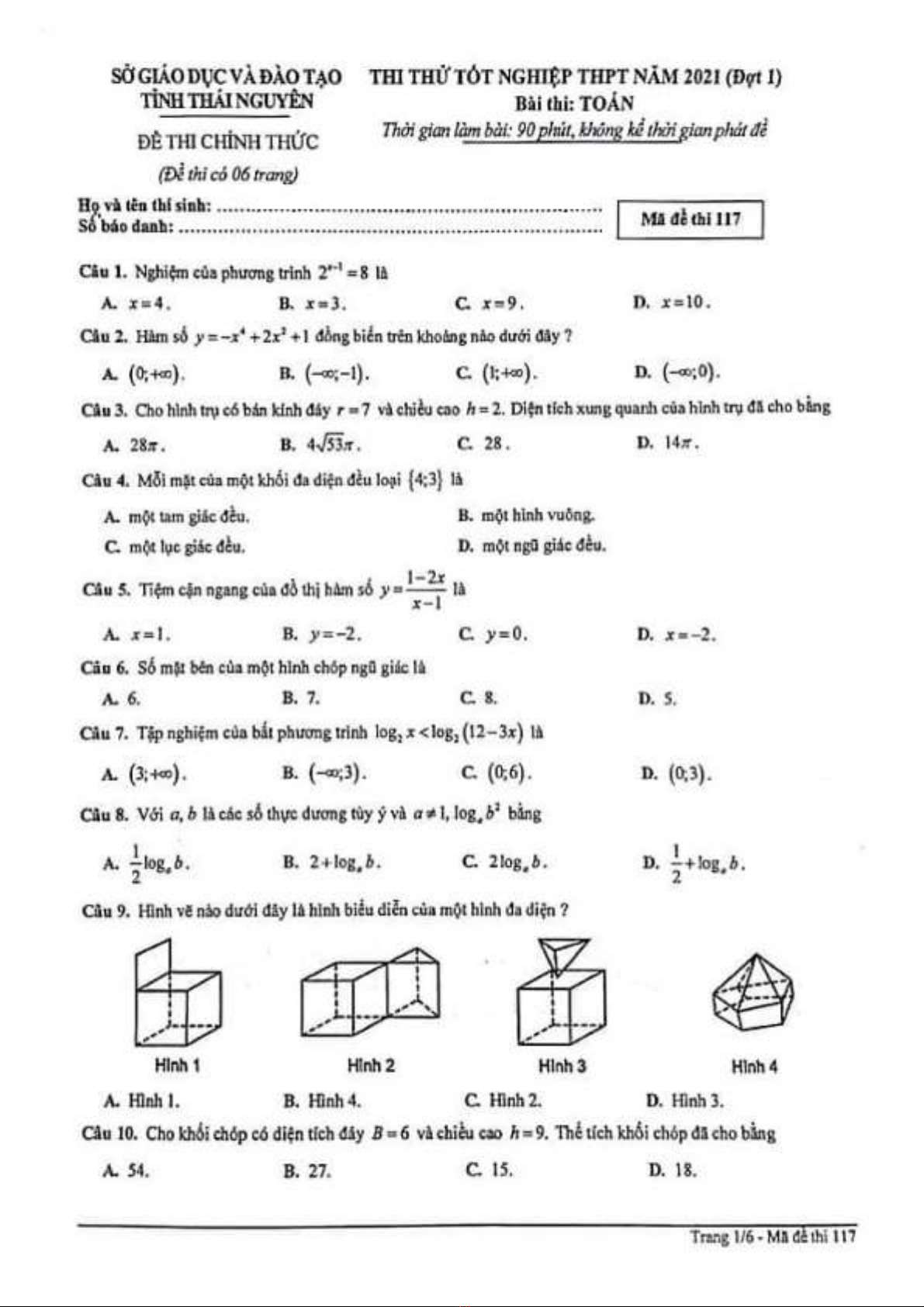 Đề thi thử tốt nghiệp THPT năm 2021 môn Toán - Sở GD&ĐT tỉnh Thái Nguyên (Đợt 1)