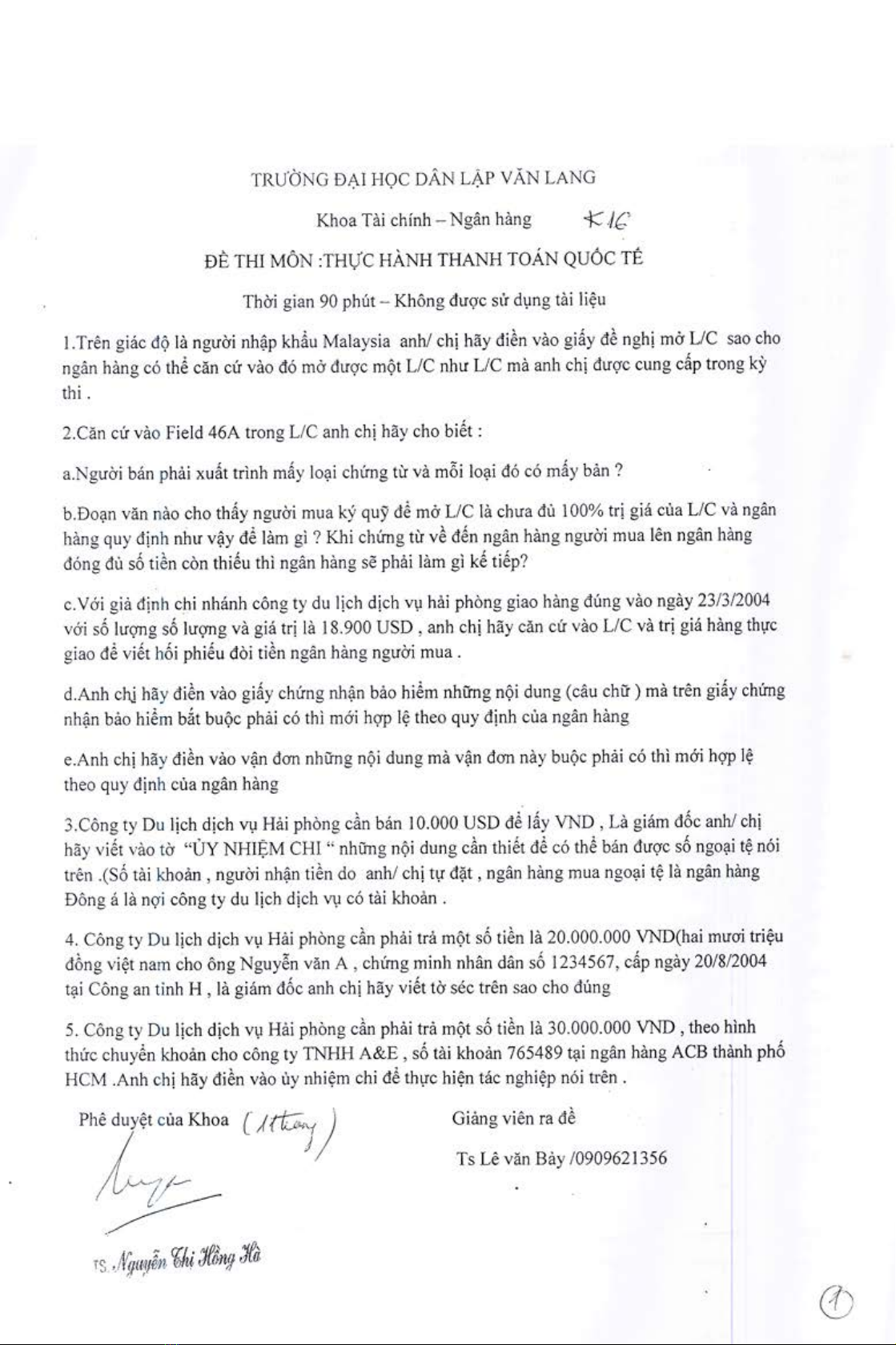 Đề thi môn Thực hành thanh toán quốc tế - ĐH Văn Lang