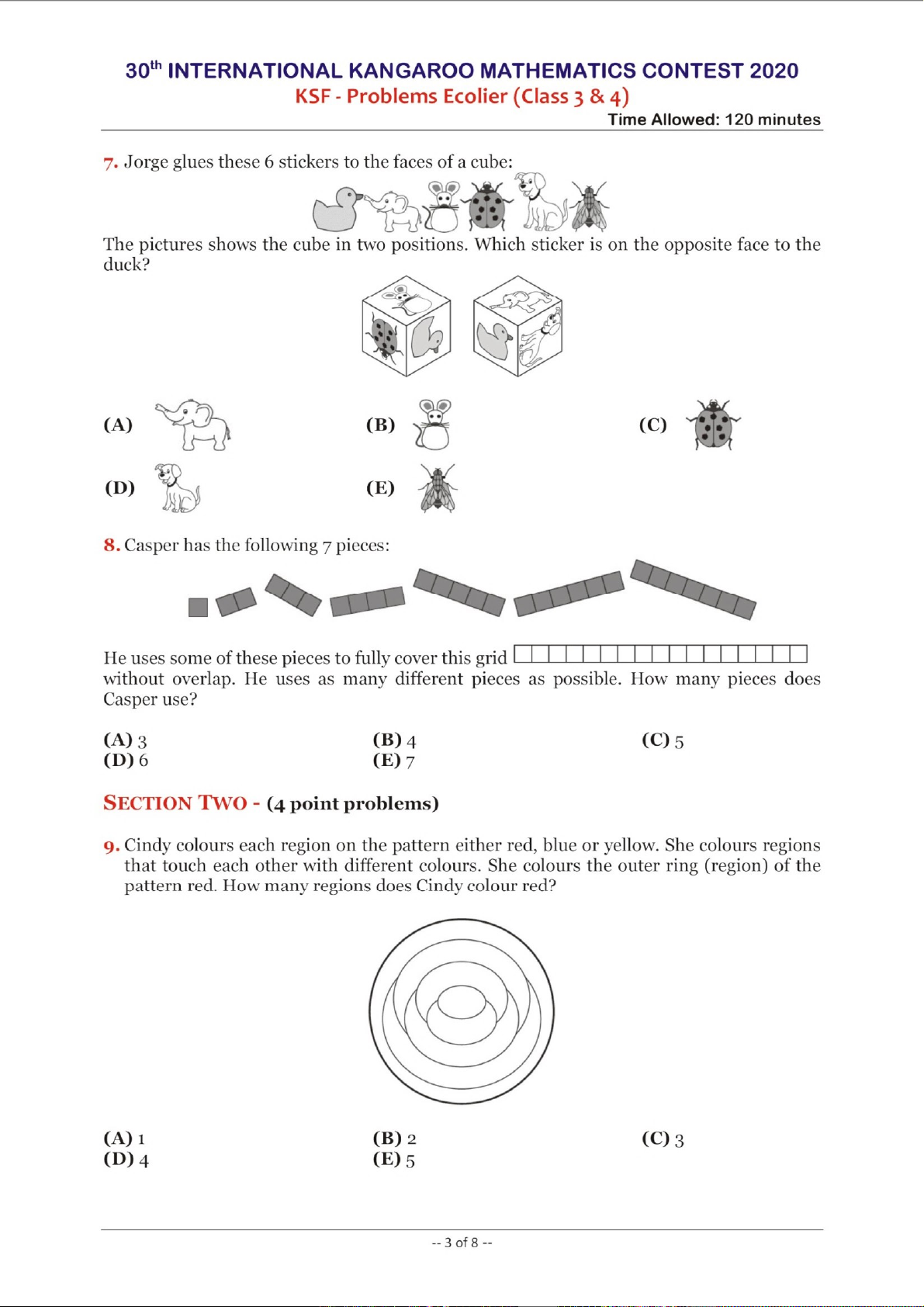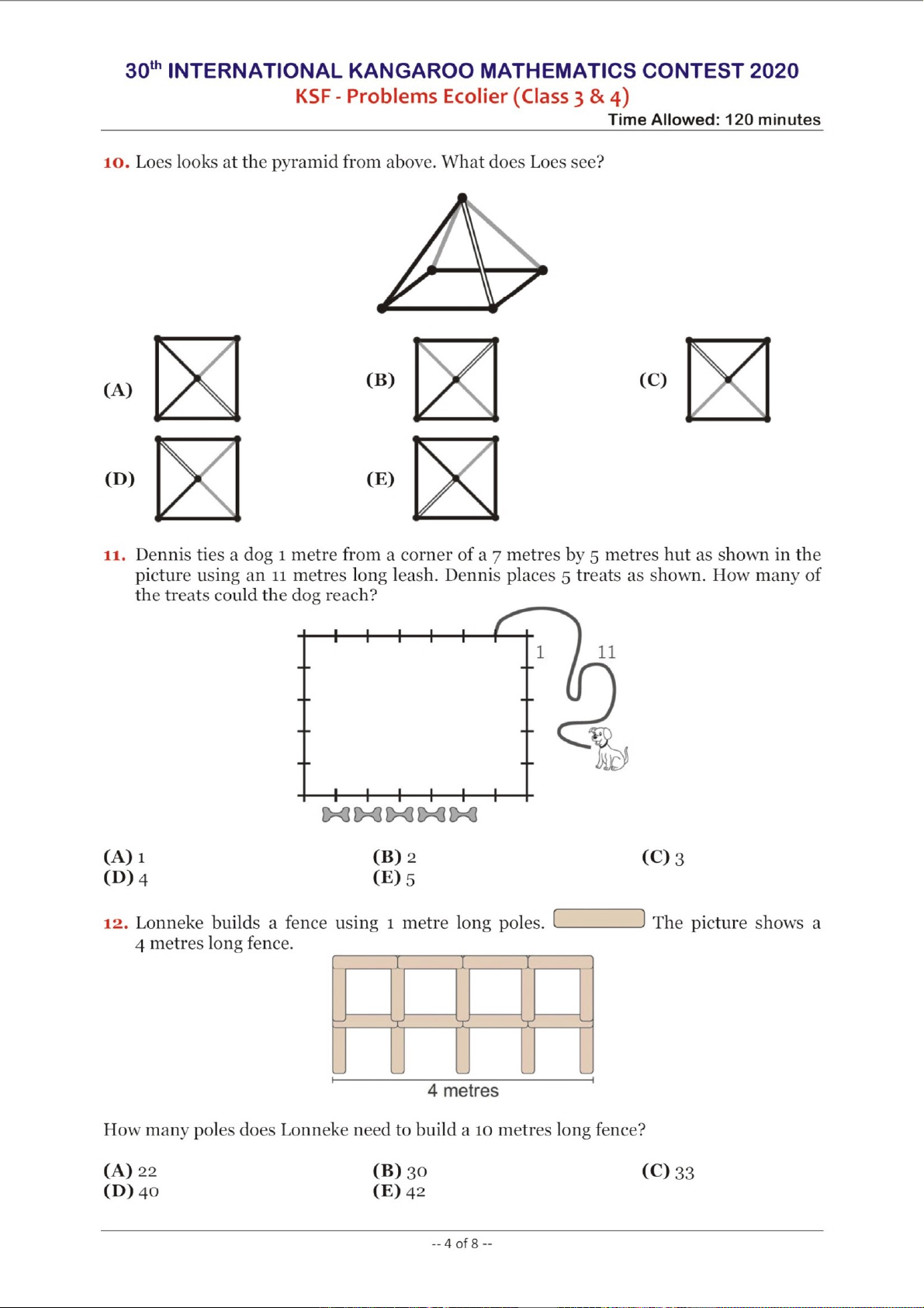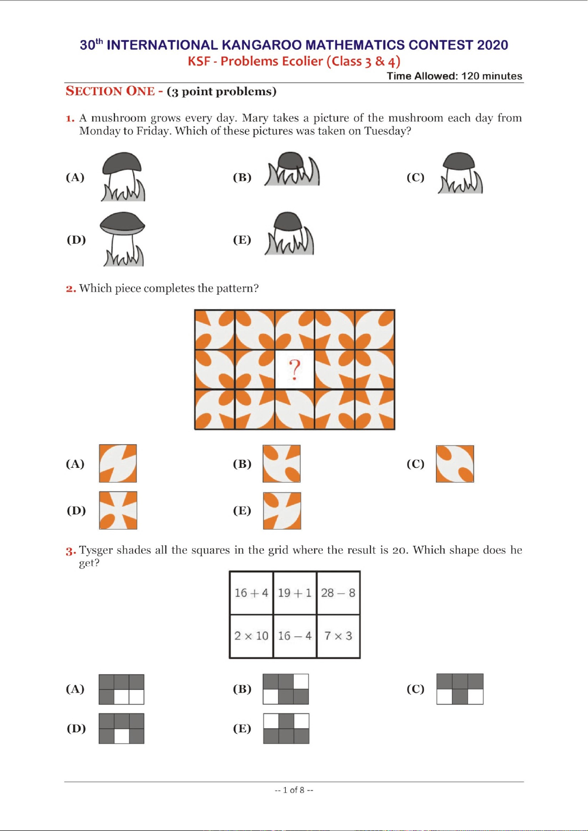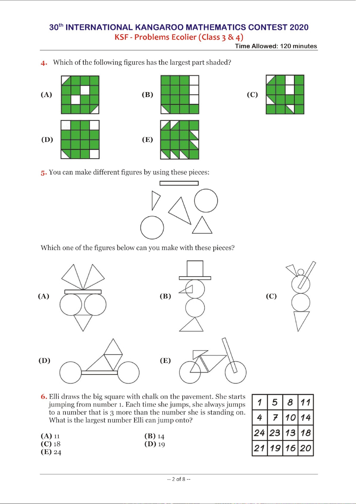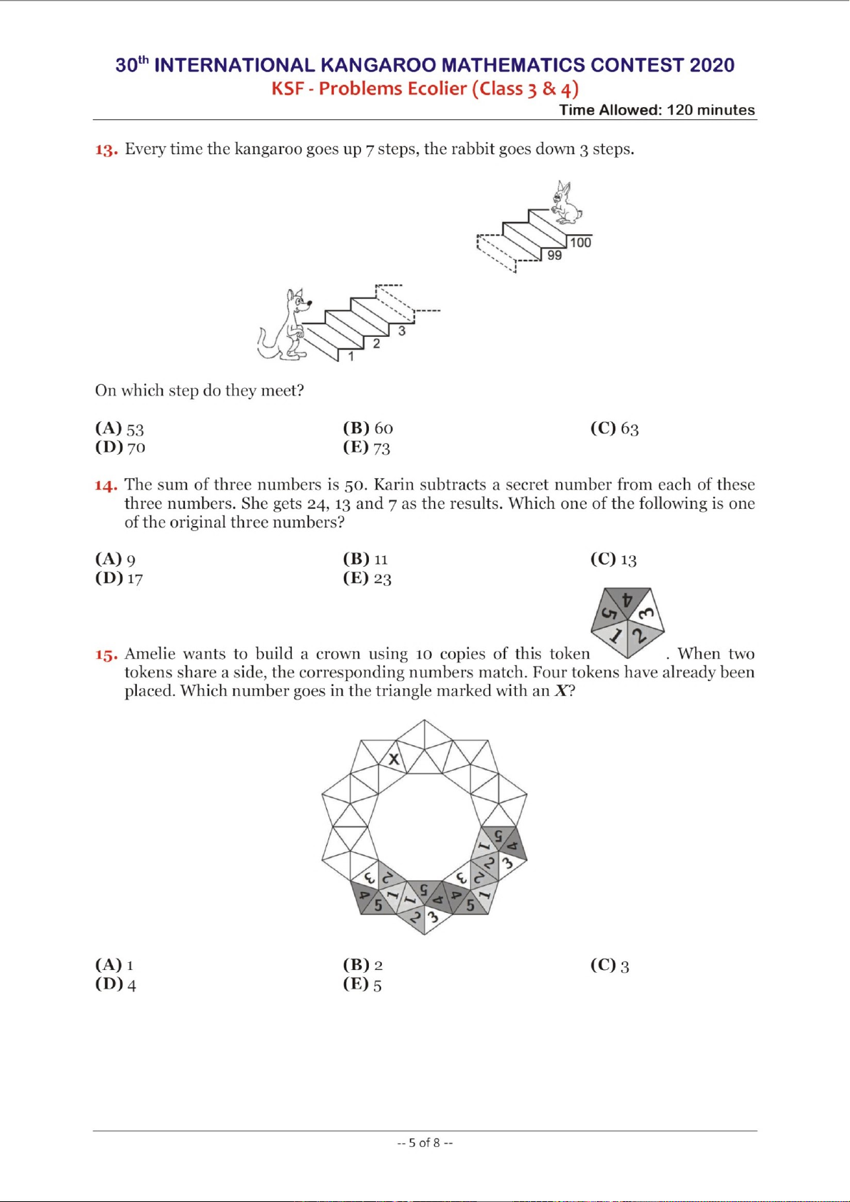 Cuộc thi Toán học Quốc tế Kangaroo (IKMC) là một trong những sự kiện toán học hàng đầu dành cho học sinh trên toàn cầu, nhằm thúc đẩy niềm đam mê toán học và phát triển tư duy logic. Phiên bản năm 2020 của cuộc thi, dành cho cấp độ Ecolier (học sinh lớp 3 và 4), được thiết kế đặc biệt để giới thiệu các khái niệm toán học một cách hấp dẫn và thử thách. Tài liệu này trình bày các vấn đề từ cuộc thi KSF (Kangaroo Sans Frontières), nhấn mạnh tầm quan trọng của việc khuyến khích các kỹ năng giải quyết vấn đề, tư duy phản biện và khả năng ứng dụng toán học vào các tình huống đa dạng ngay từ khi còn nhỏ. Các bài toán không chỉ kiểm tra kiến thức mà còn khuyến khích sự sáng tạo và khả năng suy luận, là nền tảng vững chắc cho sự phát triển học thuật của học sinh.