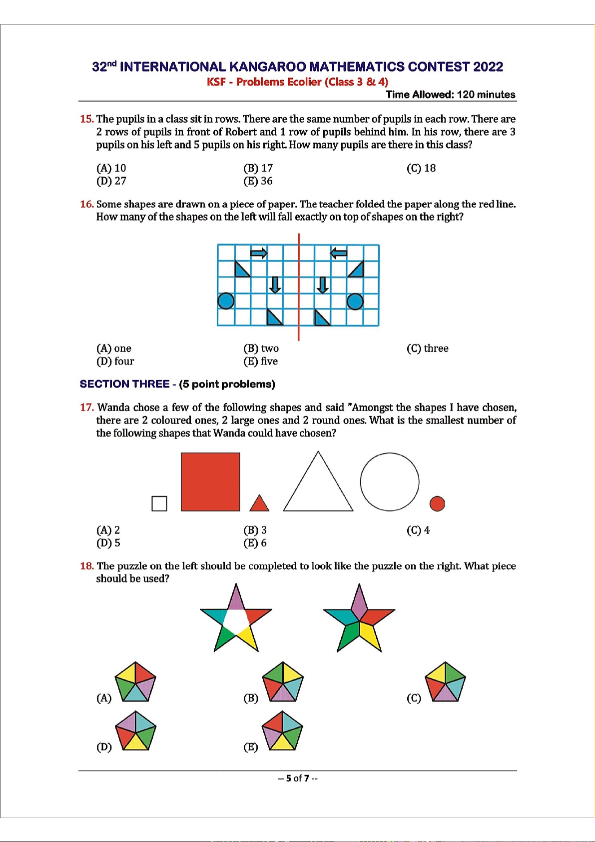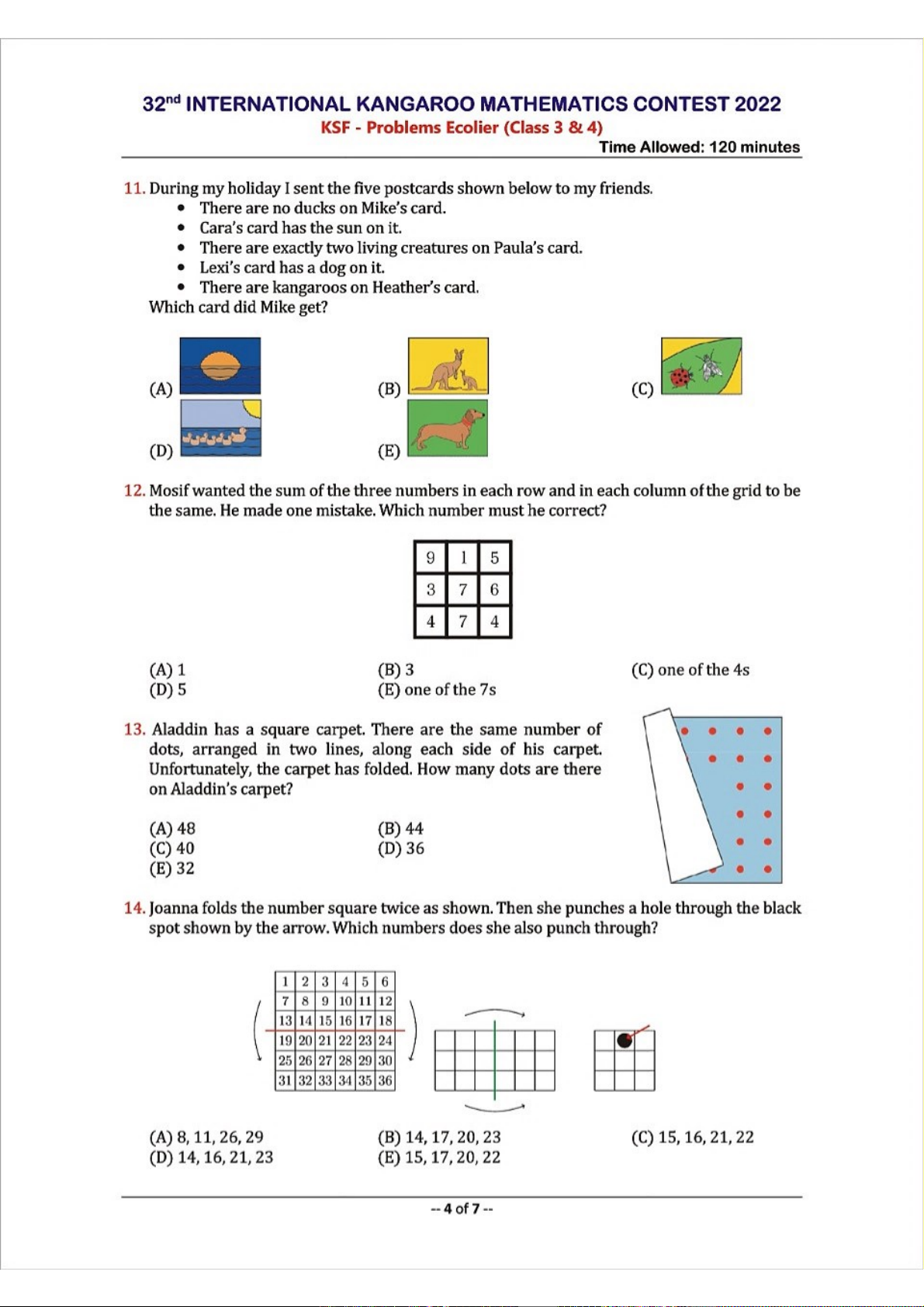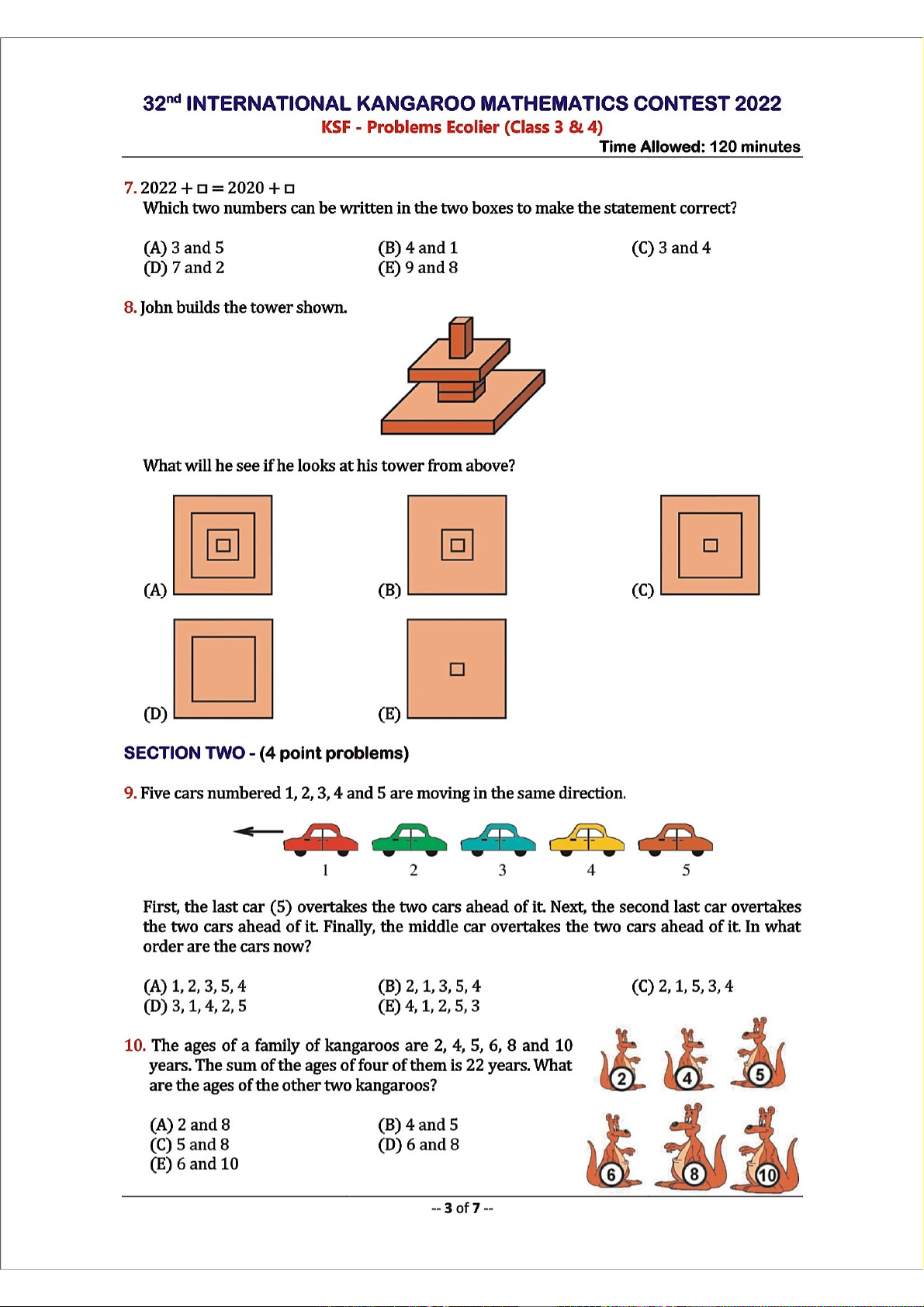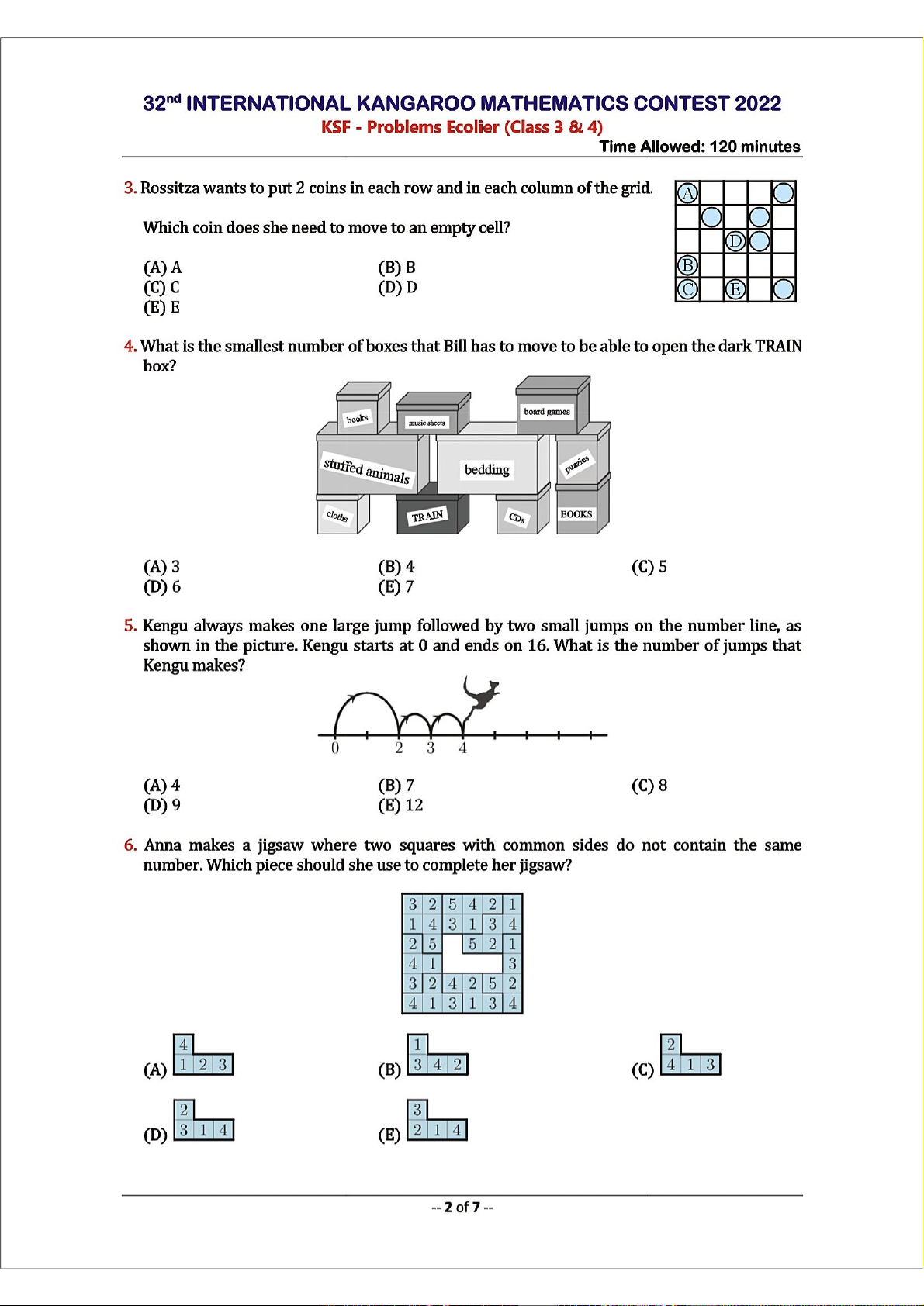 The 32nd International Kangaroo Mathematics Contest 2022 presents a curated collection of mathematical challenges tailored for Ecolier level students (Class 3 & 4). This globally recognized mathematics contest plays a crucial role in cultivating analytical thinking and problem-solving skills among young students. By engaging with a diverse array of questions, participants are encouraged to develop their logical reasoning and creative approaches to mathematical concepts. The objective of this compilation is to provide an accessible yet stimulating platform for students to explore foundational mathematical principles in an engaging and competitive environment, fostering a deeper appreciation for the subject beyond conventional classroom settings.