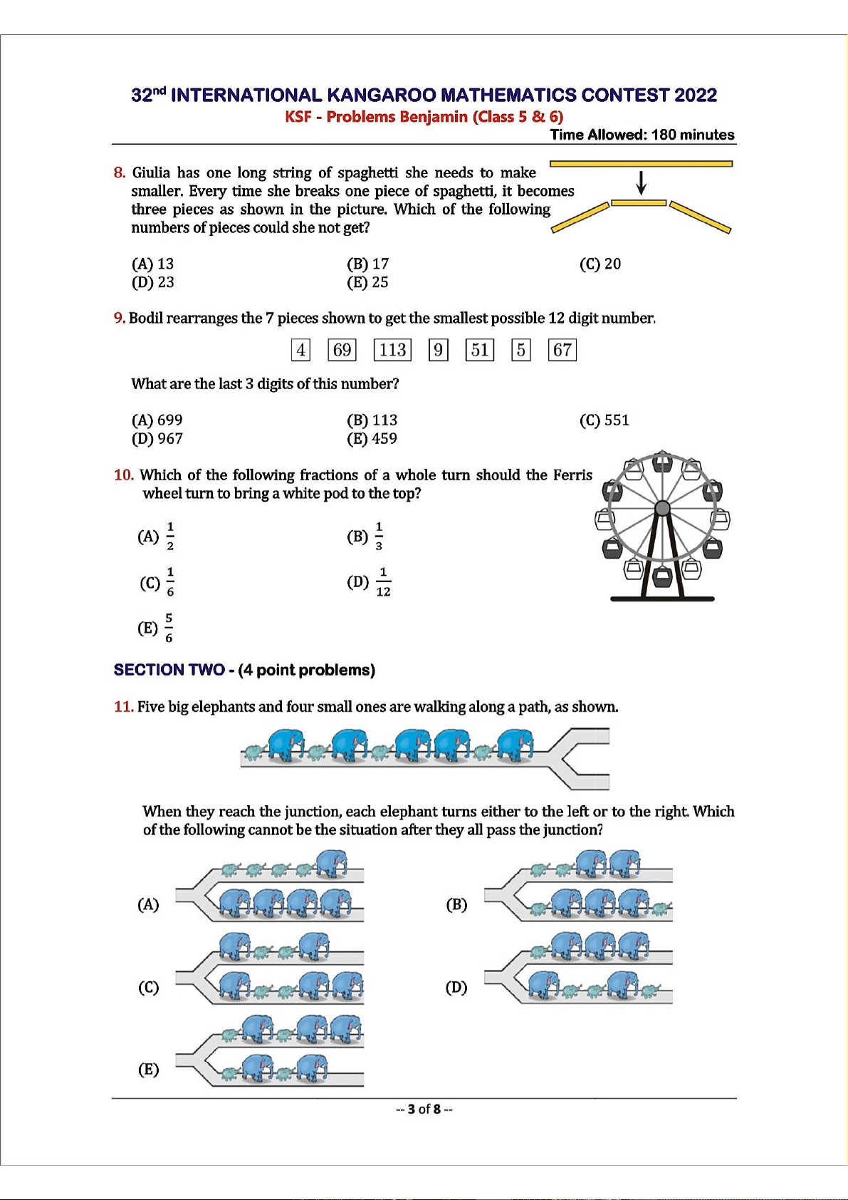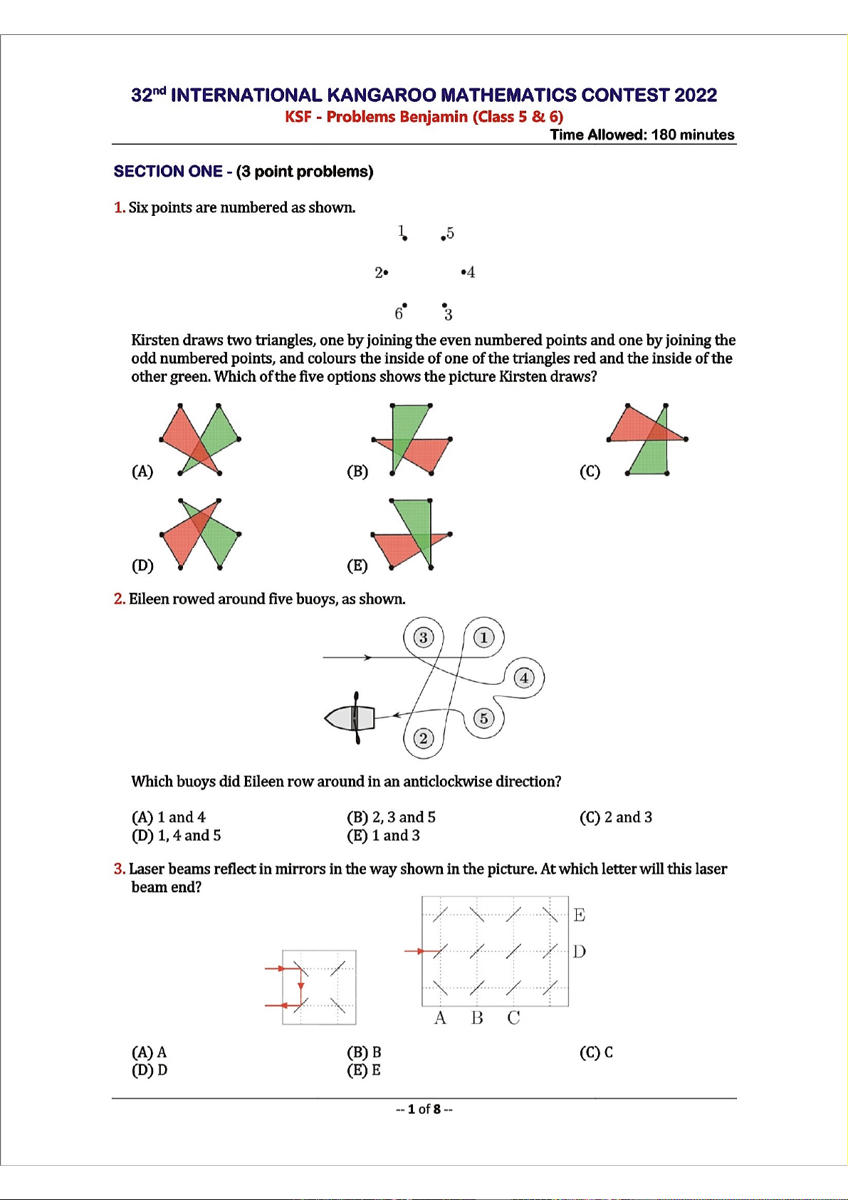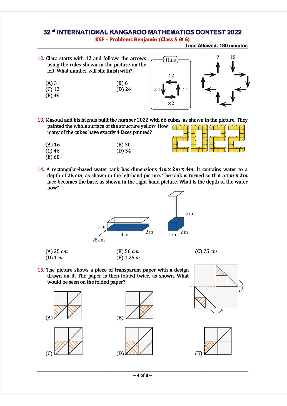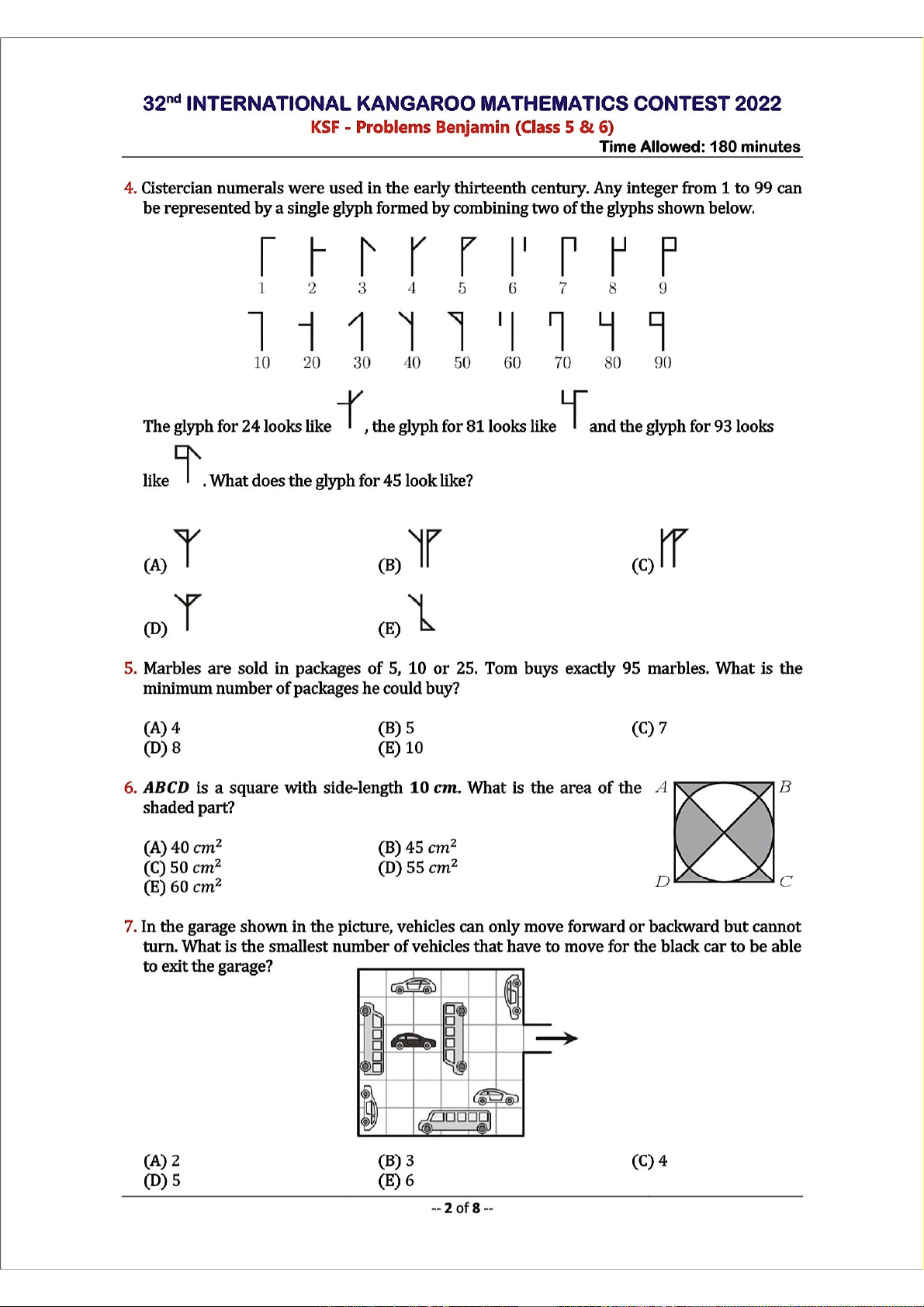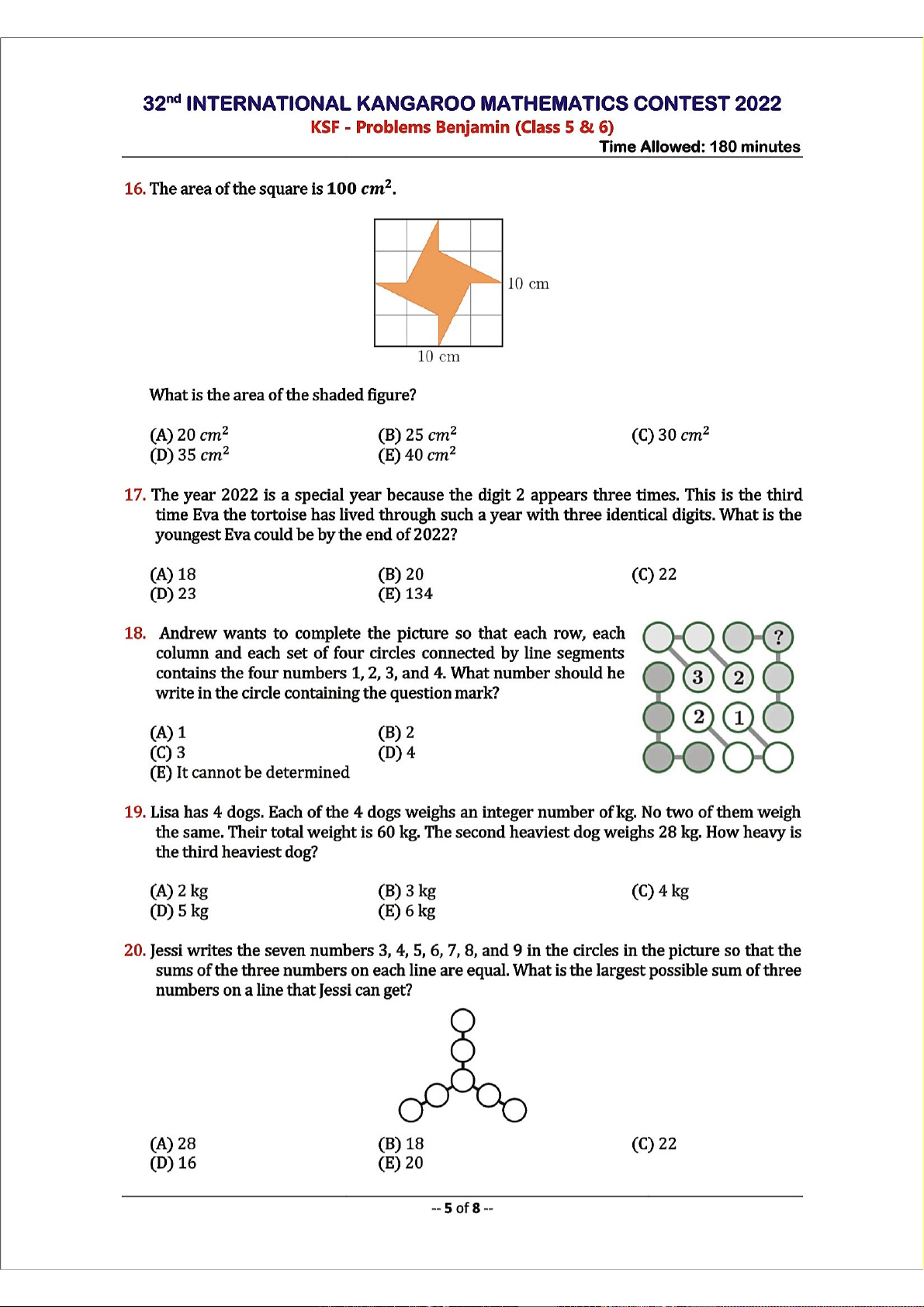 Tài liệu này giới thiệu tuyển tập các bài toán từ Kỳ thi Toán Quốc tế Kangaroo lần thứ 32 năm 2022, dành riêng cho cấp độ Benjamin (Khối lớp 5 và 6). Kỳ thi Toán học Kangaroo nổi tiếng toàn cầu trong việc khơi dậy niềm đam mê toán học và khuyến khích tư duy phản biện ở học sinh tiểu học. Các bài toán được thiết kế để không chỉ kiểm tra kiến thức toán học cơ bản mà còn thúc đẩy kỹ năng giải quyết vấn đề, suy luận logic và khả năng phân tích. Chúng đóng vai trò quan trọng trong việc nuôi dưỡng thế hệ các nhà tư tưởng và nhà khoa học tương lai, đồng thời làm nổi bật tầm quan trọng của giáo dục STEM từ giai đoạn đầu.