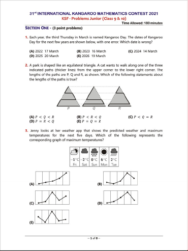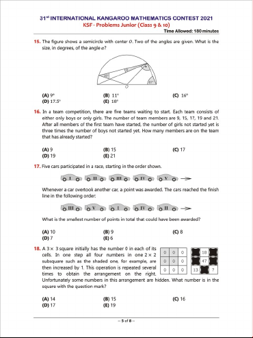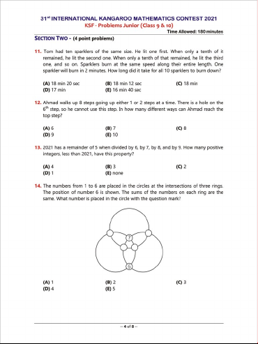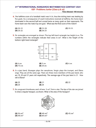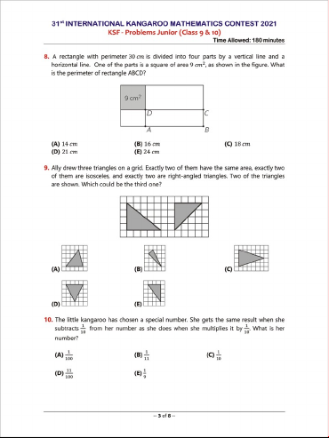 Tài liệu này giới thiệu đề thi chính thức của Kỳ thi Toán Kangaroo Quốc tế lần thứ 31 năm 2021, dành riêng cho cấp độ Junior (Lớp 9 & 10). Cuộc thi này được thiết kế nhằm khuyến khích và phát triển tư duy logic cùng kỹ năng giải toán cho học sinh trên toàn thế giới. Các bài toán trong đề thi không chỉ kiểm tra kiến thức nền tảng mà còn đòi hỏi khả năng áp dụng linh hoạt các nguyên tắc toán học vào nhiều tình huống đa dạng. Việc nghiên cứu tài liệu này mang ý nghĩa quan trọng trong việc đánh giá năng lực toán học ở lứa tuổi trung học cơ sở và chuẩn bị hiệu quả cho các cuộc thi học thuật, từ đó góp phần khơi dậy niềm yêu thích đối với môn học này.