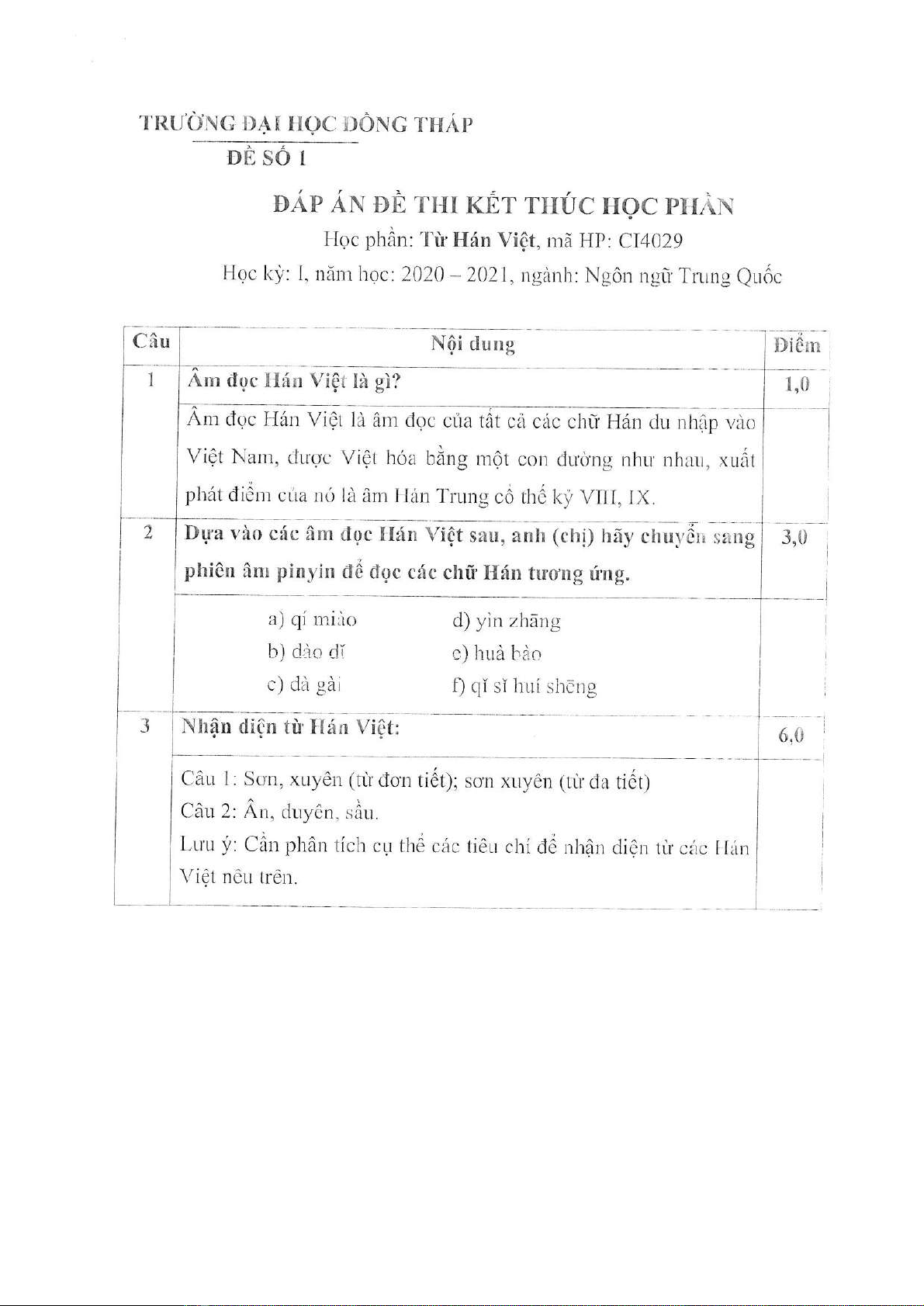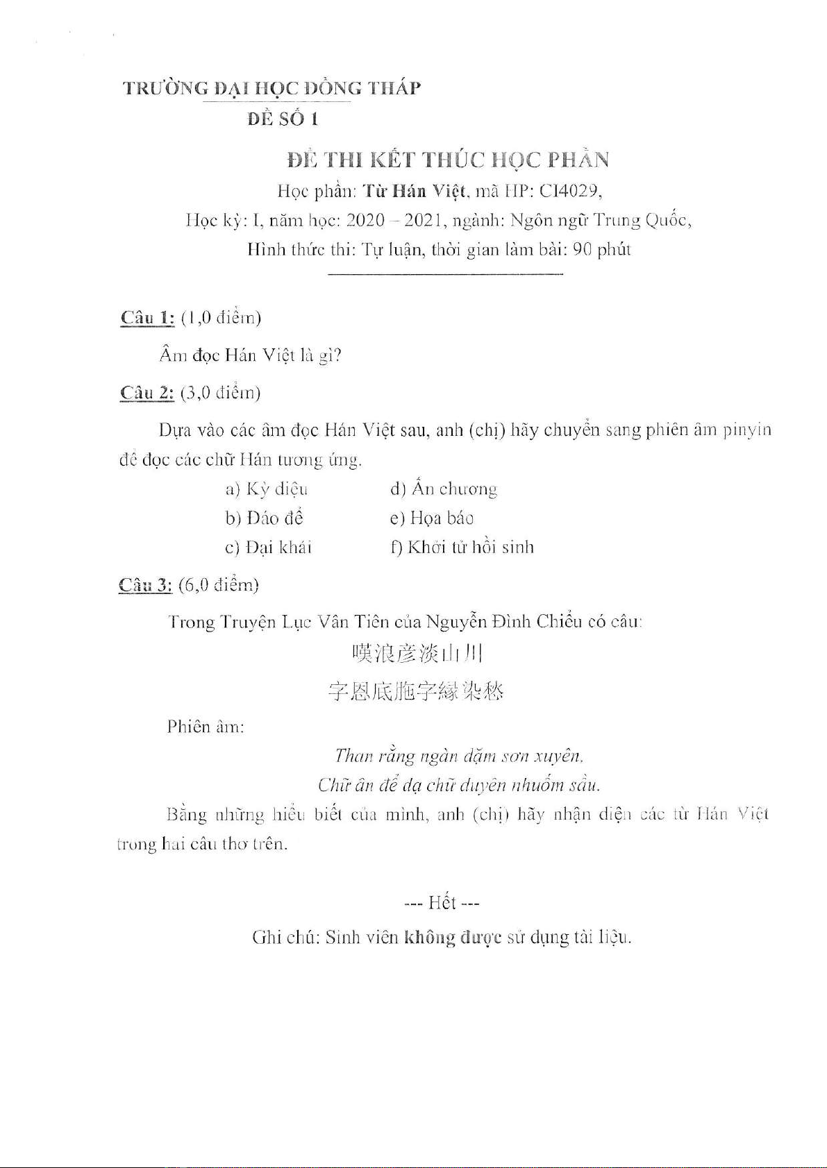 Đề thi kết thúc học phần học kì 1 môn Từ Hán Việt năm 2020-2021 có đáp án - Trường ĐH Đồng Tháp