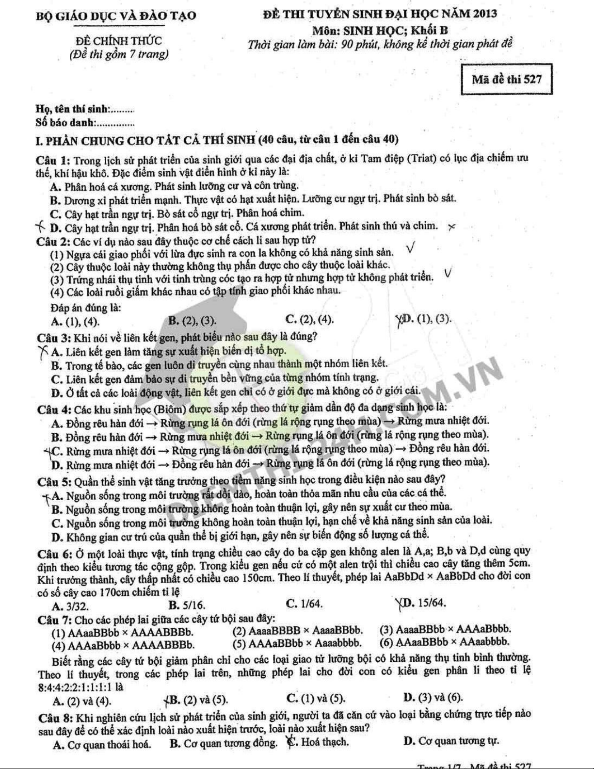 Đề thi tuyển sinh Đại học năm 2013 môn Sinh khối B - mã đề 527, đề thi chính thức của Bộ Giáo dục và Đào tạo. Chúc các bạn đạt kết quả cao trong kỳ thi tuyển sinh Cao đẳng, Đại học sắp tới.