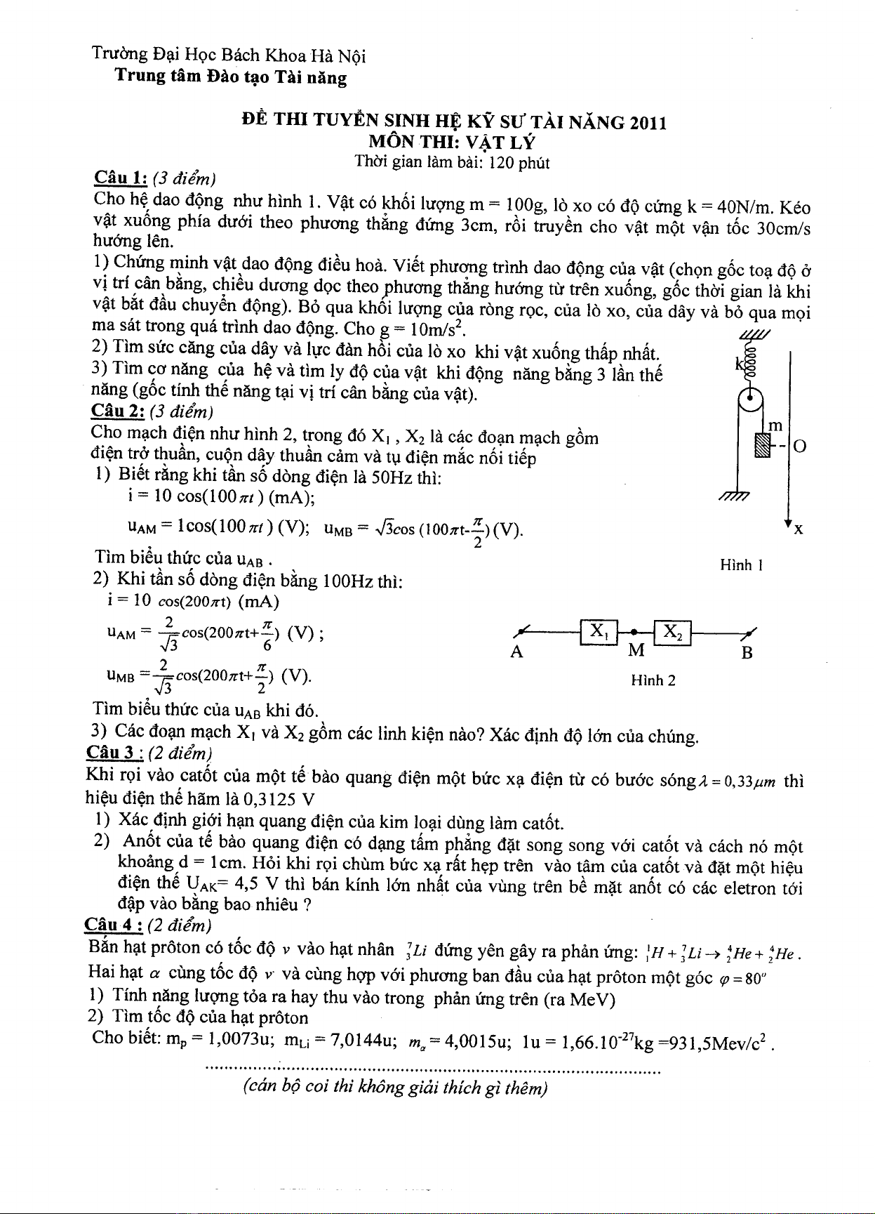 Đề thi tuyển sinh hệ Kỹ sư tài năng 2011 môn Vật lý, Toán