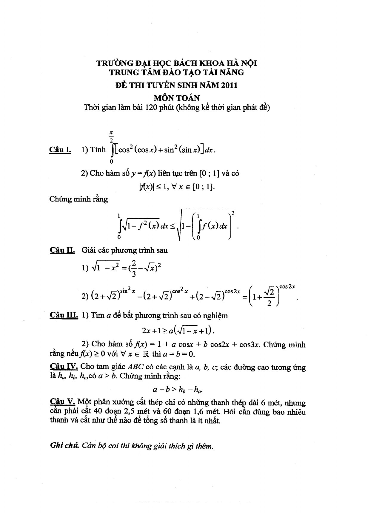 Đề thi tuyển sinh hệ Kỹ sư tài năng 2011 môn Vật lý, Toán bao gồm đề thi tuyển sinh hệ Kỹ sư tài năng 2011 môn Toán và đề thi tuyển sinh hệ Kỹ sư tài năng môn Vật Lý của ĐH Bách Khoa Hà Nội. Đây là tài liệu tham khảo bổ ích dành cho các bạn sinh viên ôn tập và kiểm tra kiến thức để đỗ vào hệ Kỹ sư chất lượng cao.
