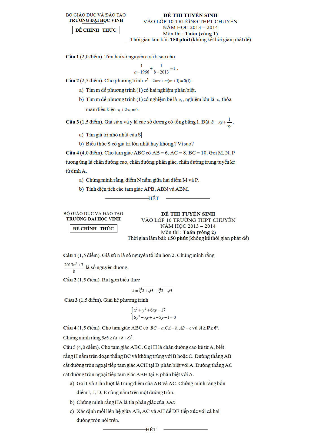 Các bạn học sinh và quý thầy cô tham khảo miễn phí Đề thi tuyển sinh vào lớp 10 trường THPT chuyên môn Toán trường Đại học Vinh để hệ thống kiến thức học tập cũng như trau dồi kinh nghiệm ra đề thi
