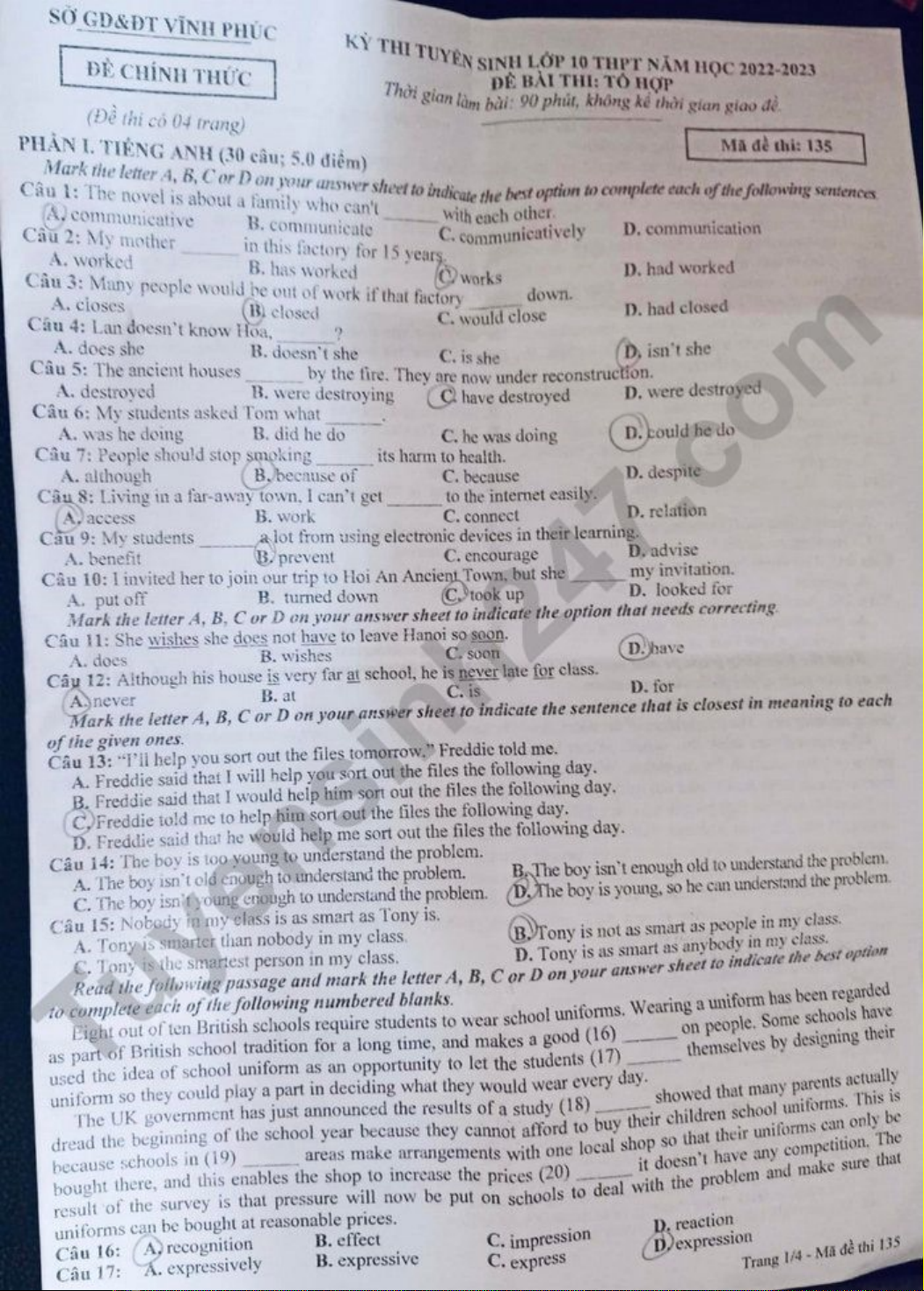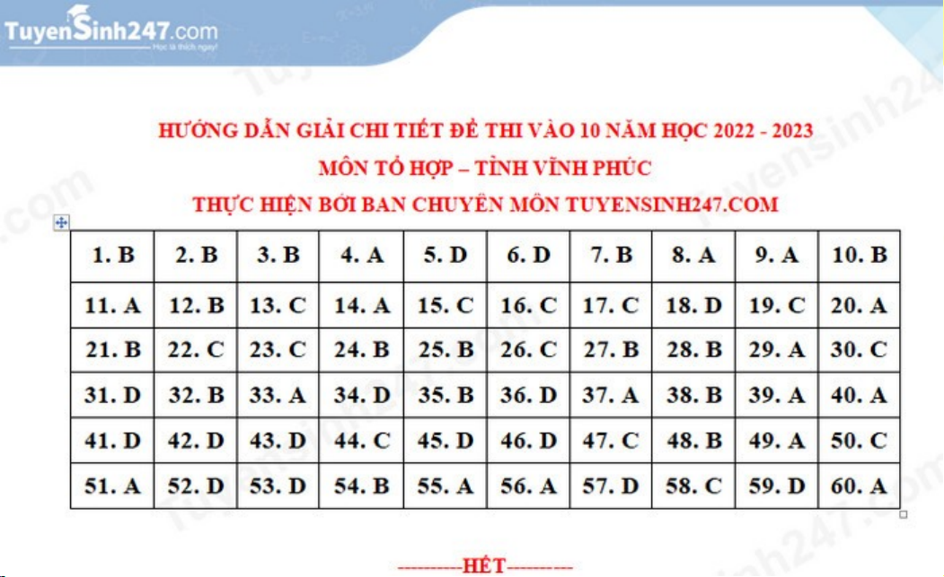 Đề thi tuyển sinh vào lớp 10 môn Tổ hợp năm 2022-2023 có đáp án - Sở GD&ĐT Vĩnh Phúc
