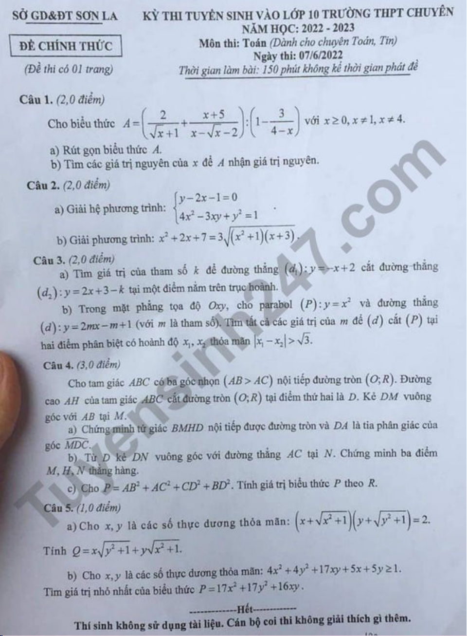Đề thi tuyển sinh vào lớp 10 THPT chuyên môn Toán năm 2022-2023 - Sở GD&ĐT Sơn La