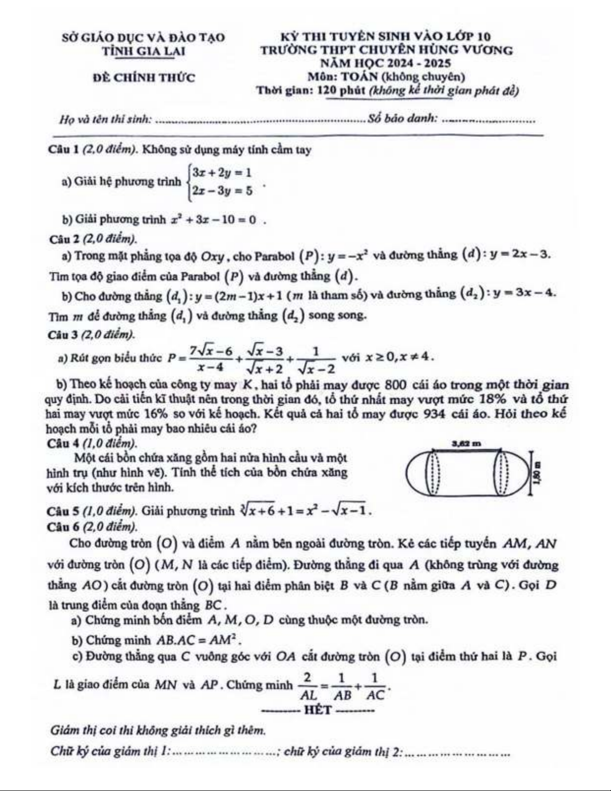 cCâu .4 (1 điểm). Một cái bồn chứa xăng gồm hai nửa hình cầu và một hình trụ (như hình vẽ).