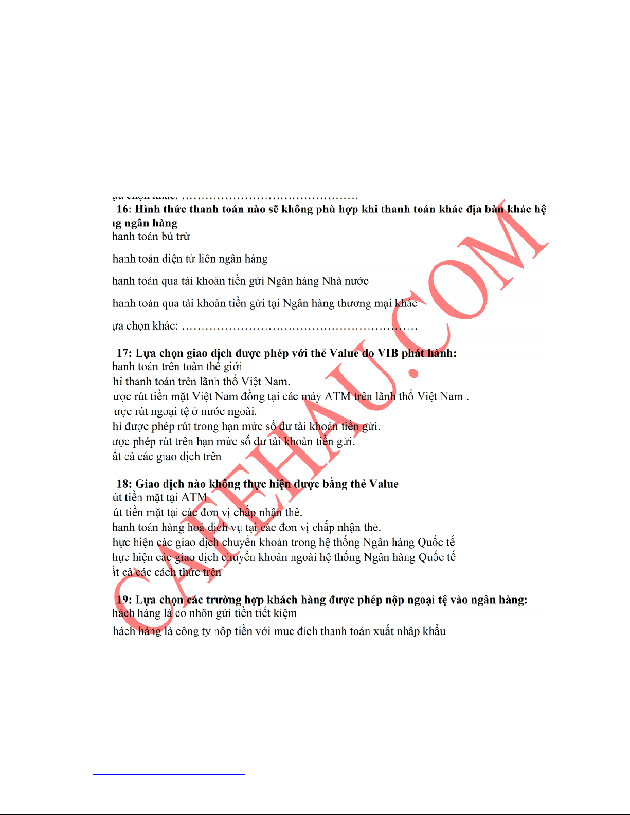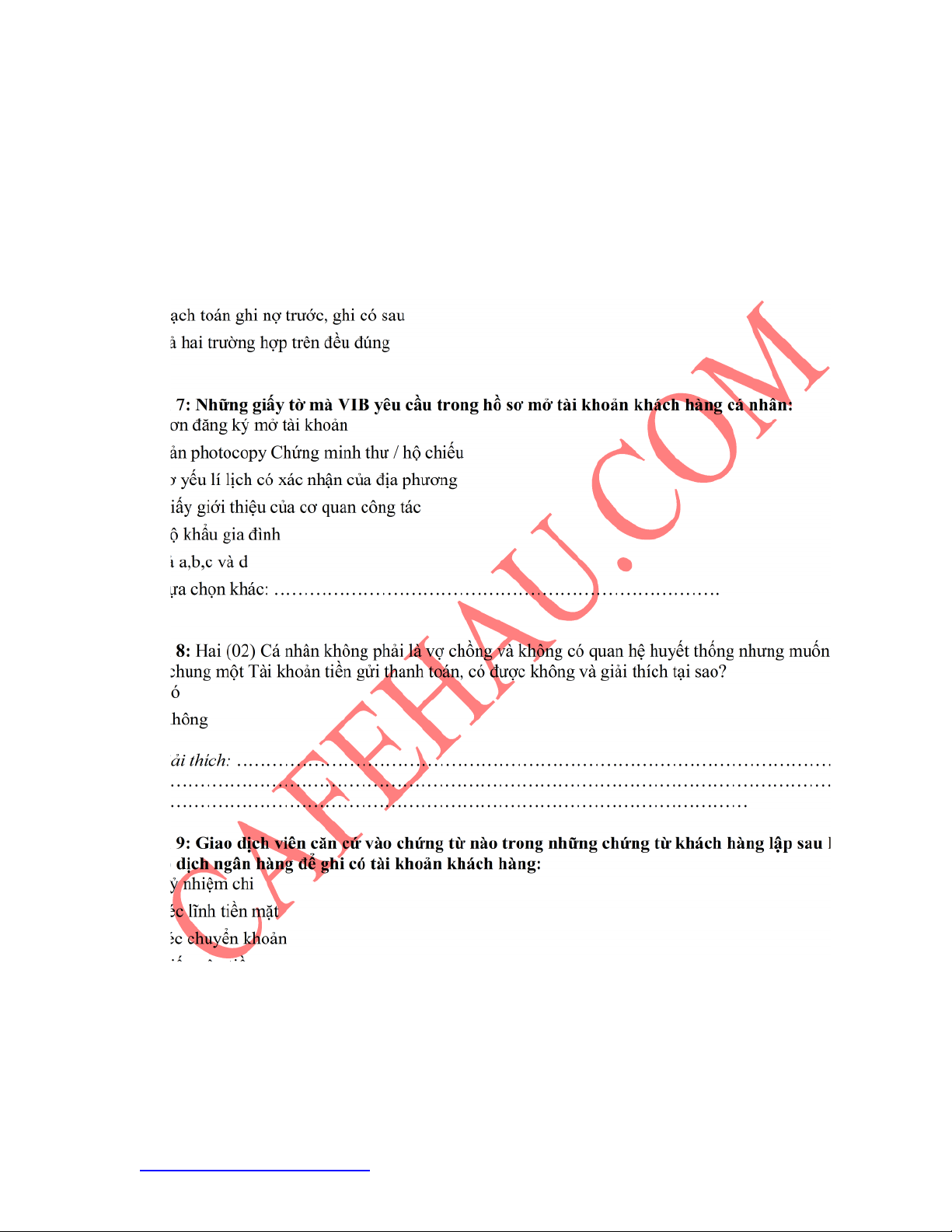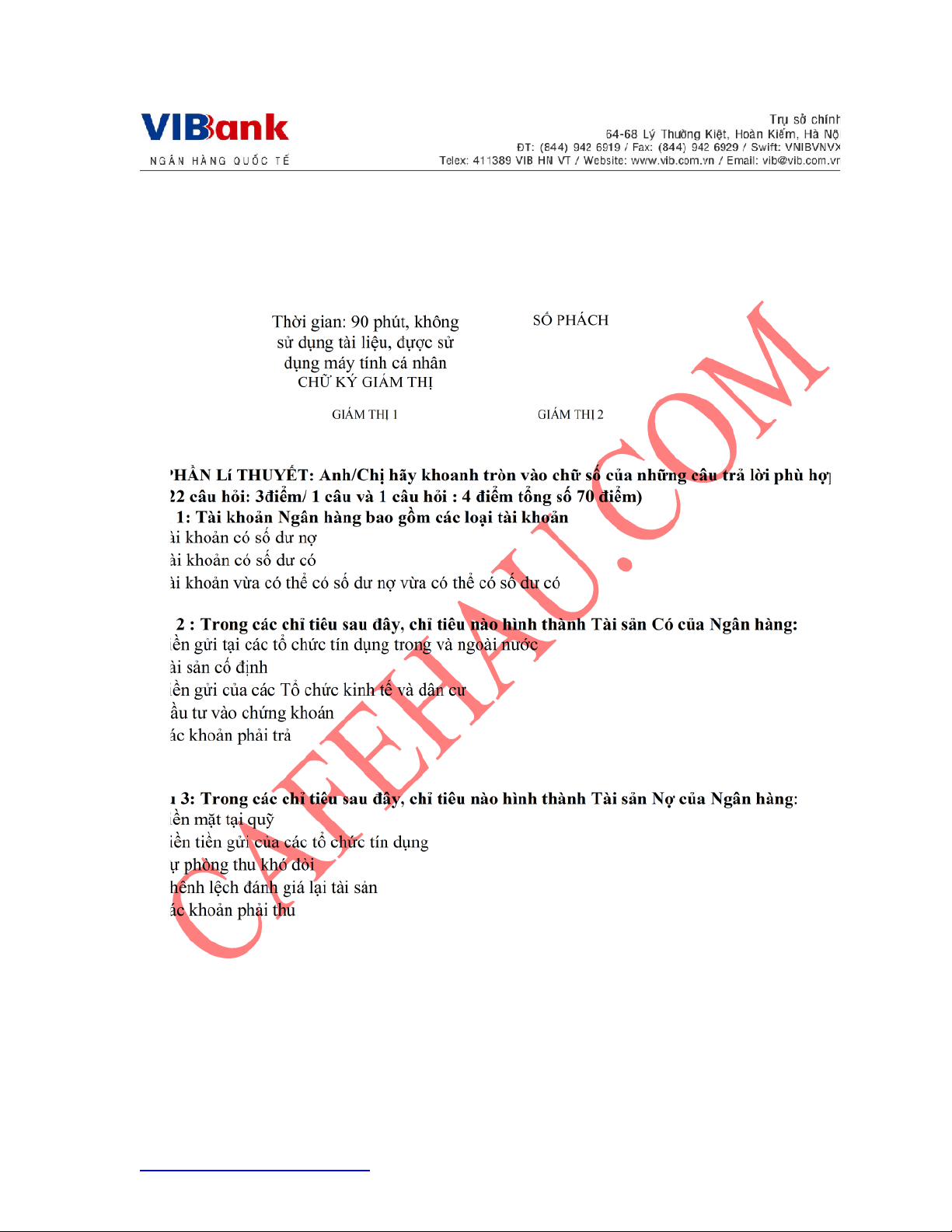 Môn thi: Nghiệp vụ, tuyển vị trí: Giao dịch viên VIB , kỳ thi: Tháng …20…..