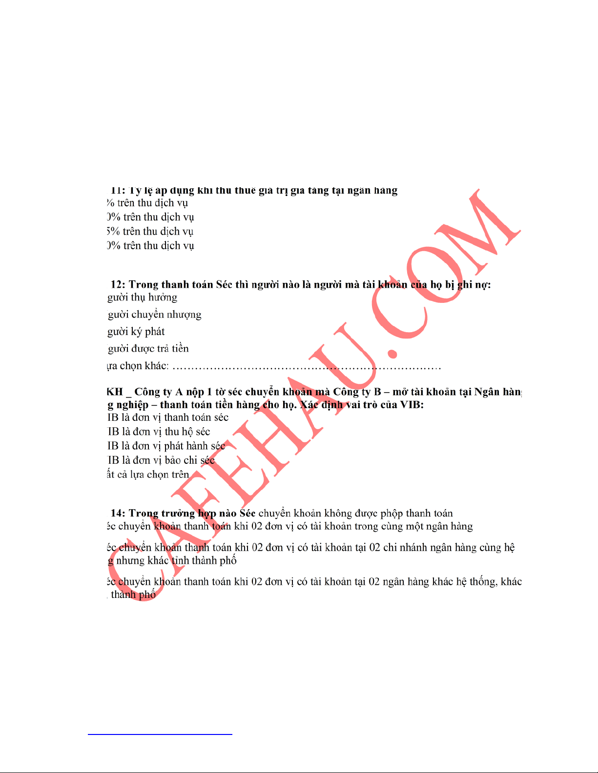 Câu 11: Tỷ lệ áp dụng khi thu thuế giá trị gia tăng tại ngân hàng