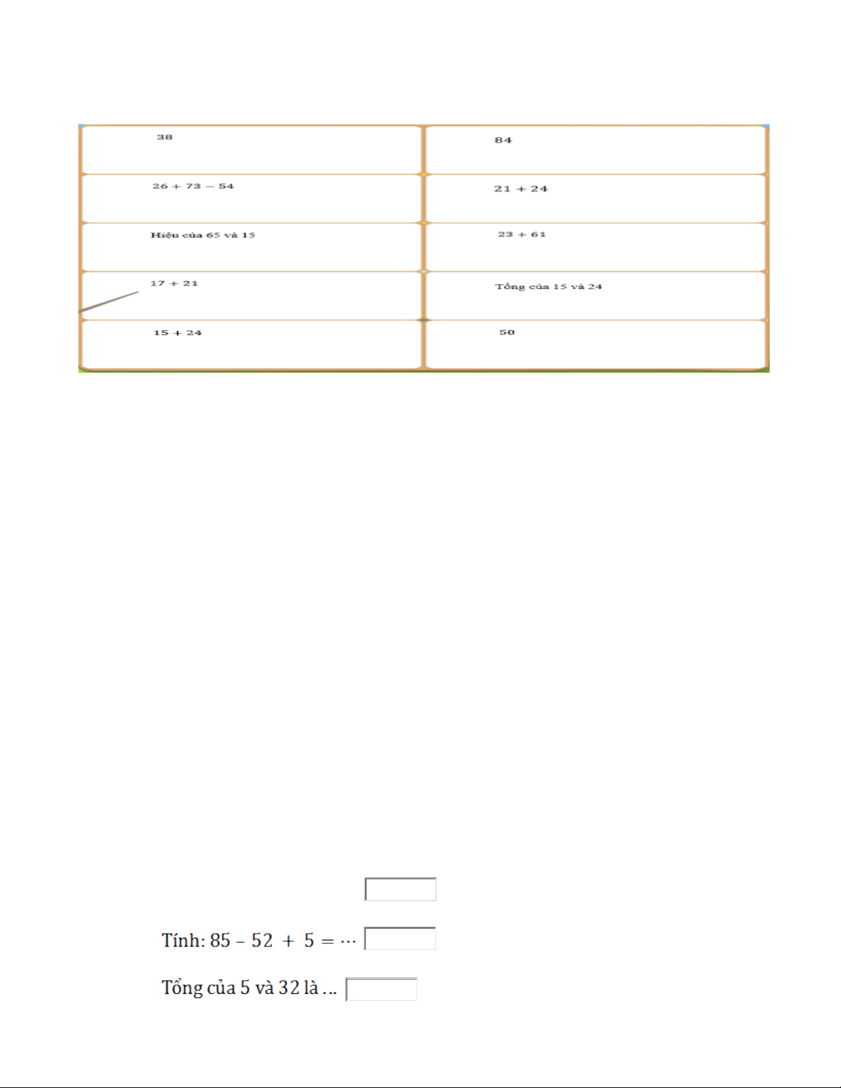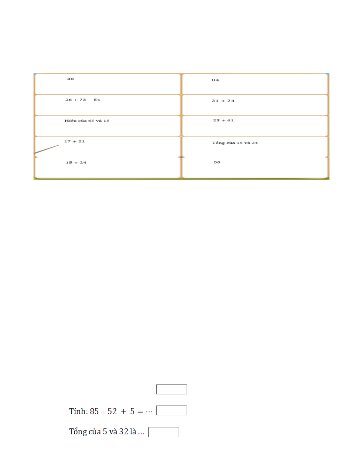 Câu 2: Tính: 54 + 24 = …... (78)