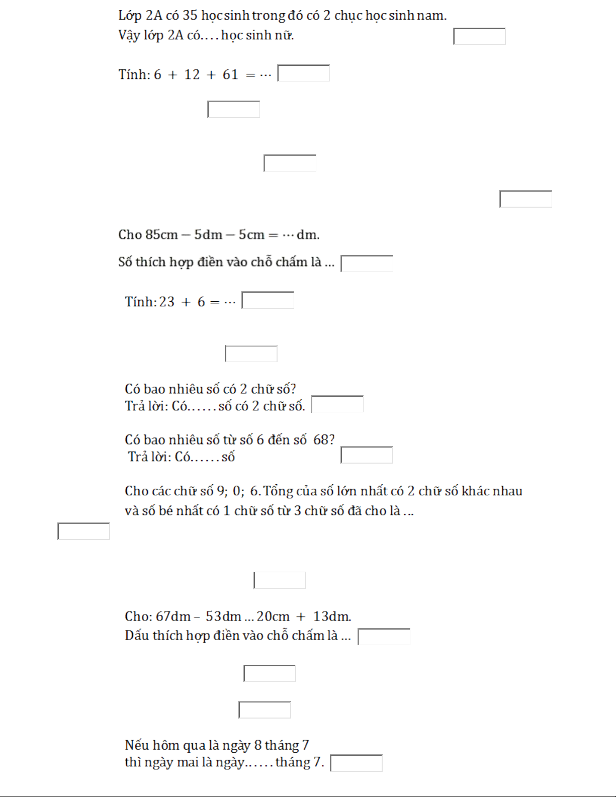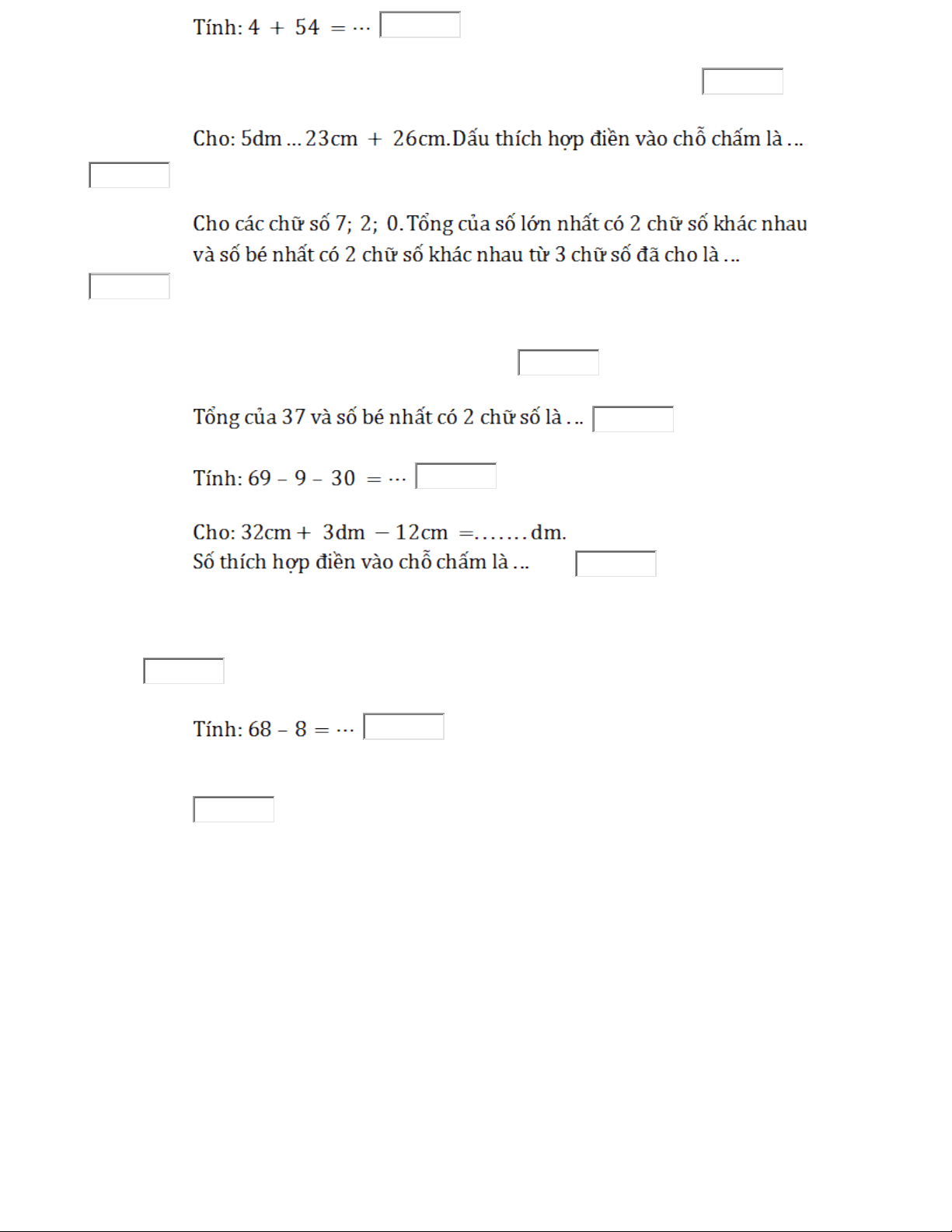 Câu số 8: Cho: 7dm - 30cm = ..... cm + 3dm .S thích h p đi n vào ch ch m là ố ợ ề ỗ ấ