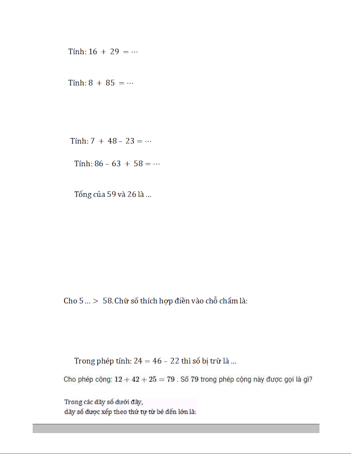 Câu 22: Trong phép tính: 53 = 76 – 23 thì s tr là ……... ố ừ