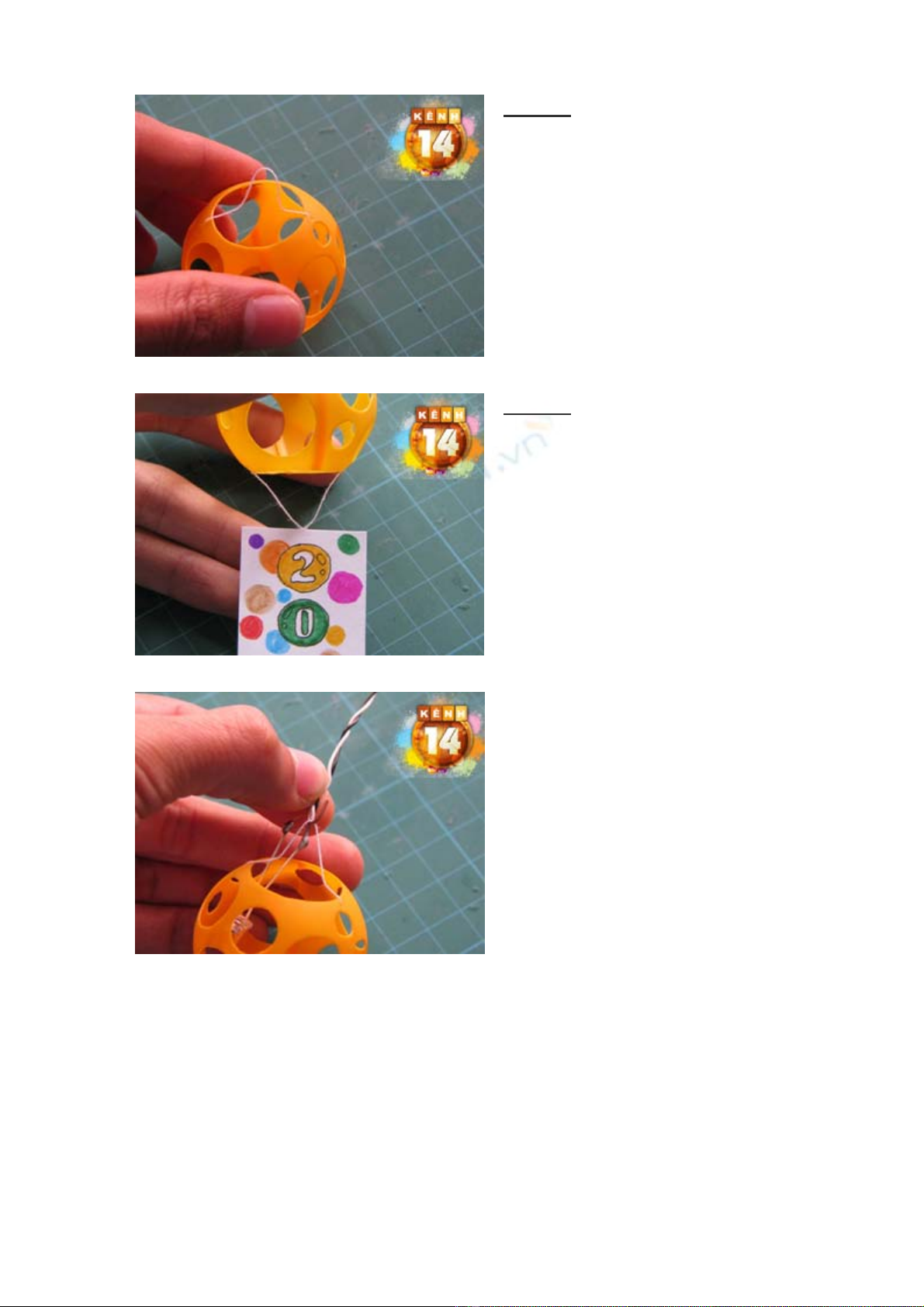 - Đính 2 sợi chỉ treo quả bóng bàn vừa