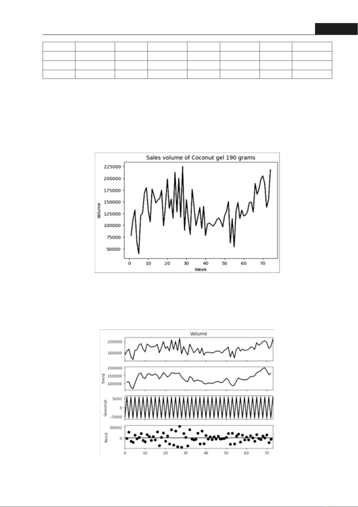 86Hong Bang Internaonal University Journal of ScienceISSN: 2615 - 9686Hong Bang Internaonal University Journal of Science - Vol.5 - 12/2023: 85-92ensemble techniques offer rich potenal to enhance predicve power even in turbulent markets. As the FMCG landscape grows more complex each year, harnessing both stascal and machine learning will only increase in necessity to keep up with the pace of change.2. CASE STUDYThe researched product is pre-packaged, and historical market demand data has been collected from January 2022 to May 2023. The current demand forecast is generated annually, using a one-month me bucket. Consequently, the company has encountered issues related to an excess of finished goods, resulng in overcapacity in the warehouse. These problems have adversely affected supply chain efficiency and financial flow. Days Inventory Outstanding (DIO) is among the key performance indicators used to evaluate the operaonal efficiency of the company. DIO stands for Days Inventory Outstanding and measures the average number of days that a company's inventory is held before it is sold or used up. This metric provides valuable insights into the efficiency of a company's inventory turnover and helps evaluate the effecveness of the supply chain and inventory management process. In fact, the company has encountered a high DIO, around 50 days, with the target of reducing it to about 20 days. DIO is comprised of many factors, one of which is having accurate demand forecasts to ensure on-hand inventory is kept at appropriate levels. Therefore, a comprehensive analysis of demand forecasng is necessary to develop a new forecasng model with the purpose of improving the forecast accuracy for the company. To conduct this analysis, the first step will be data preparaon and cleaning to ensure the demand data is accurate and consistent over the given me period. Stascal analysis such as trend, seasonality and residual decomposion will then be performed to understand the demand paerns. Potenal forecasng methods to explore further include me series models like ARIMA models or advanced forecasng technique, including LSTM or the combined model. The parameters and fit of each model will be evaluated to select the one that opmizes error metrics like MAPE, MSE, MAD. Once an appropriate model is selected, it will be tested by forecasng by using the historical demand data. By improving demand planning, the company can beer align producon, inventory and distribuon plans. This will increase supply chain agility, reduce waste, enable cost savings and ulmately provide beer customer service. The overall goal is an integrated and intelligent demand forecasng approach customized for the business based on stascal best pracces.2.1. Data processingData has been collected from January 2022 to May 2023, in a weekly basis (74 observaons). The data then being pre-processed to eliminate error and N/A values. (Detail in Table 1). Table 1. Demand from January 2022 to May 2023Period Demand Period Demand Period Demand Period Demand 1 78102 20 198599 39 140682 58 114350 2 112797 21 135898 40 78210 59 132432 3 132570 22 155856 41 102881 60 119826 4 65469 23 115008 42 104850 61 121932 5 39270 24 212886 43 101356 62 129282 6 120738 25 128238 44 98298 63 148685 7 126173 26 200184 45 103759 64 149196 8 169288 27 117263 46 112511 65 127824 9 180010 28 225381 47 115666 66 189222 10 131364 29 89120 48 108126 67 165828 11 107148 30 154791 49 96533 68 177150 12 177275 31 111870 50 120708 69 198114 13 163092 32 80339 51 129684 70 205284 14 147462 33 176513 52 150497 71 189090 15 154049 34 138088 53 62202 72 138092