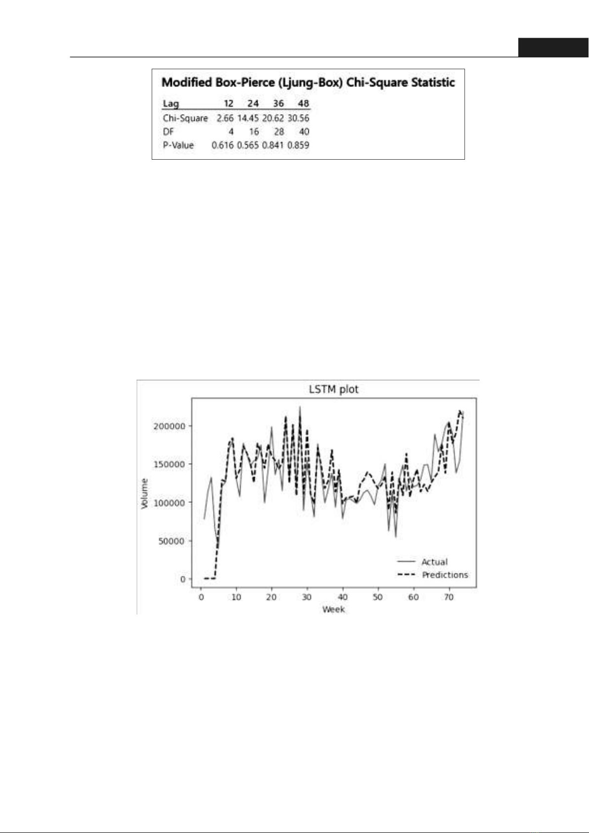 88Hong Bang Internaonal University Journal of ScienceISSN: 2615 - 9686Hong Bang Internaonal University Journal of Science - Vol.5 - 12/2023: 85-922.2. Model selecon and evaluaonThere are many methods that can be used to work well with the me series that has slight trend and seasonality with a strong irregular paer. ARIMA and LSTM models have been widely applied for me series forecasng tasks across domains. For instance, Williams et al [5] have developed seasonal ARIMA models to forecast traffic flow. The models outperformed historical average benchmarks. Ediger et al [6] have applied ARIMA forecast primary energy demand in Turkey by fuel type. The models were able to accurately forecast primary energy demand for each fuel type one to five years ahead, with lower errors than alternave extrapolaon methods. On the other hand, LSTM also being applied in many research. Abbasimehr et al [7] have proposed an opmized LSTM model for product demand forecasng and compare performance against stascal methods. The opmized LSTM model significantly outperforms the stascal methods across all forecast horizons, while the ARIMA and SARIMA performance degrades significantly for longer horizon forecasts. In finance, Jiang et al [8] have developed a LSTM model to predict the stock market. The result states that the LSTM model outperformed the ARIMA model in forecasng stock prices in term of RMSE and MAPE metrics. However, some researches have provided the superiority of a combined LSTM-ARIMA model. G. Peter Zhang [9] has built a hybrid model combining ARIMA and neural networks for me series forecasng. The hybrid ARIMA-NN model significantly outperforms both individual models across all forecast horizons on the two datasets. Similarly, Dave et al [10] have developed a hybrid ARIMA-LSTM model to forecast Indonesia's monthly export values and compare performance to individual models. The ARIMA-LSTM hybrid model provides the most accurate forecasts with lowest MAPE and RMSE scores across all horizons. It improves on individual models by 3-10%. By referring these researches, ARIMA, LSTM and a hybrid ARIMA-LSTM model is selected for this paper.2.2.1. ARIMA modelThe ARIMA model relies on three fundamental parameters-p, d, and q-each represenng a crucial aspect of the forecasng process. The variable “p” corresponds to the count of autoregressive terms (AR), indicang the reliance on past observaons for predicng future values while “d” signifies the number of nonseasonal differences incorporated into the model, capturing the extent of data transformaon needed to achieve staonarity. Lastly, “q” denotes the quanty of lagged forecast errors (MA), reflecng the influence of past errors on the current predicon. By analyzing ACF and PACF plots, opmal parameters are chosen based on the informaon criteria (AIC), so the most suitable model is the ARIMA (4,0,4) [11].The ACF of residuals (Figure 3) shows that there is no lag value that fall outside the significant limits. Furthermore, the p-value (Figure 4) for lag 12, 24, 36, and 48 all greater than 0.05. Therefore, there is not enough evidence to reject the null hypothesis of no autocorrelaon in the residuals, which can conclude that errors are random.Figure 3. The ACF plot of ARIMA's residuals