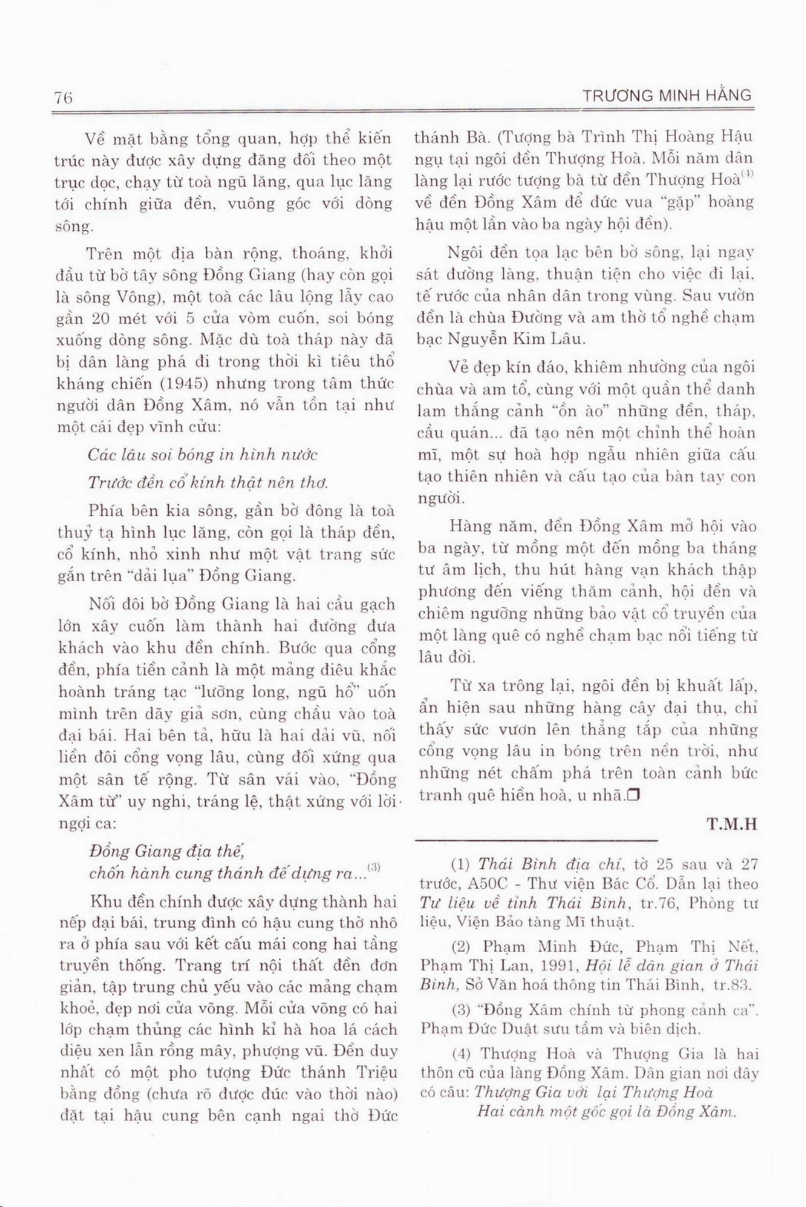 Đền Đồng Xâm có một lịch sử lâu đời, với kiến trúc độc đáo và các lễ hội sôi động. Nó đã trở thành một điểm tham quan nổi tiếng cho du khách. Trong bài viết, được phân tán các lĩnh vực sau: lịch sử đền đã từng chứng kiến nhiều thay đổi trên thời gian; kiến trúc đồng xâm được xây dựng theo một kế hoạch đắc địa với các tòa thuộc ngôi đền phân loại theo nhóm; các lễ hội diễn ra tại Đền Đồng Xâm, trong đó người dân tham gia để tưởng niệm các vị thần và yêu thương đến Thánh mẫu Liễu Hạnh; sự kết nối giữa tín ngưỡng và văn hóa trong bối cảnh hiện đại.