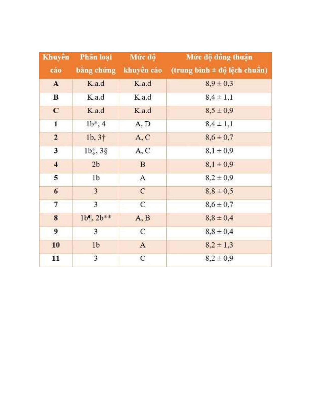 Bằng chứng, mức độ của khuyến cáo và mức độ đồng thuận cho mỗi khuyến cáo