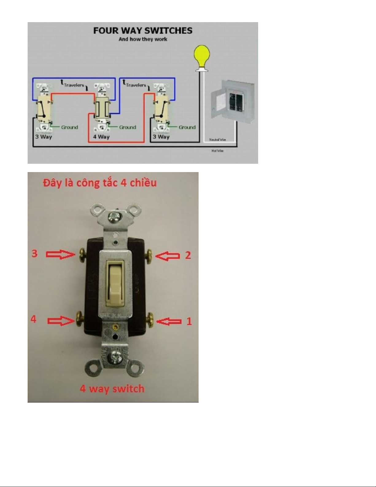 Mạch điện gồm có:+ 1 Cầu chì + 2 Công tắc 3 chấu + 1 Công tắc 4 chấu + 1 Bóng đèn