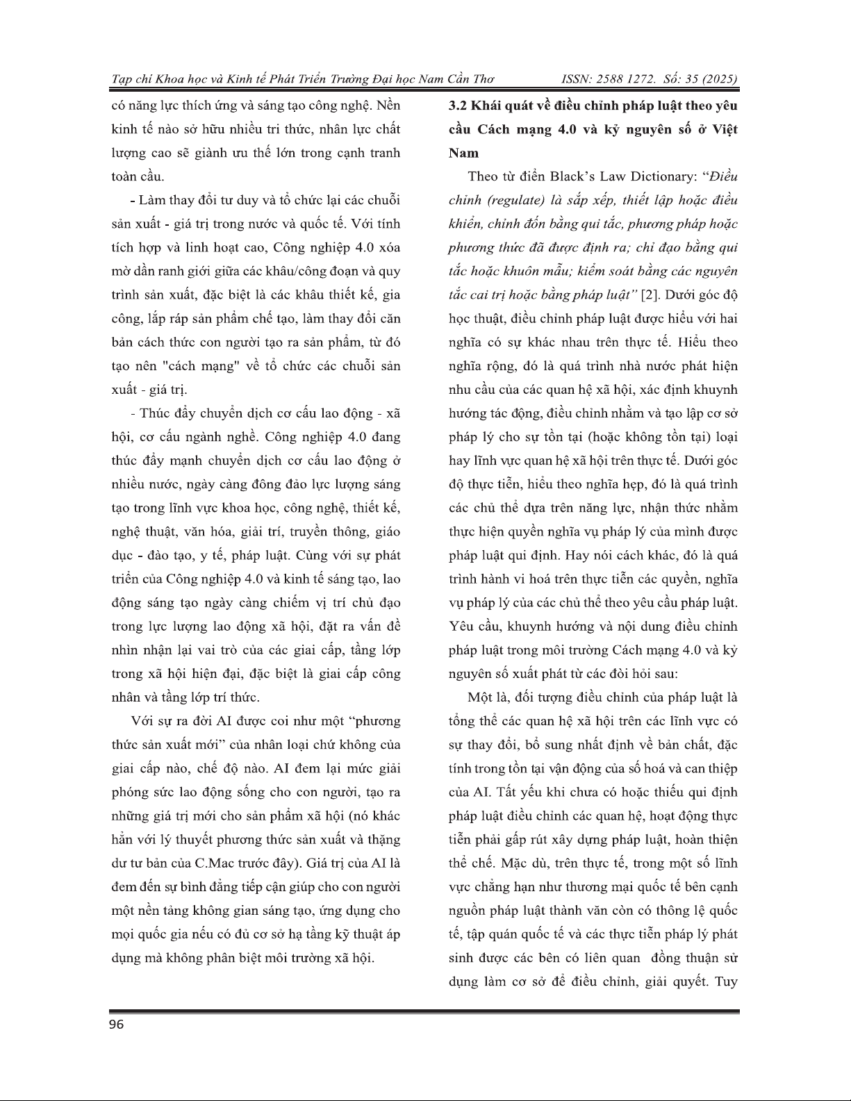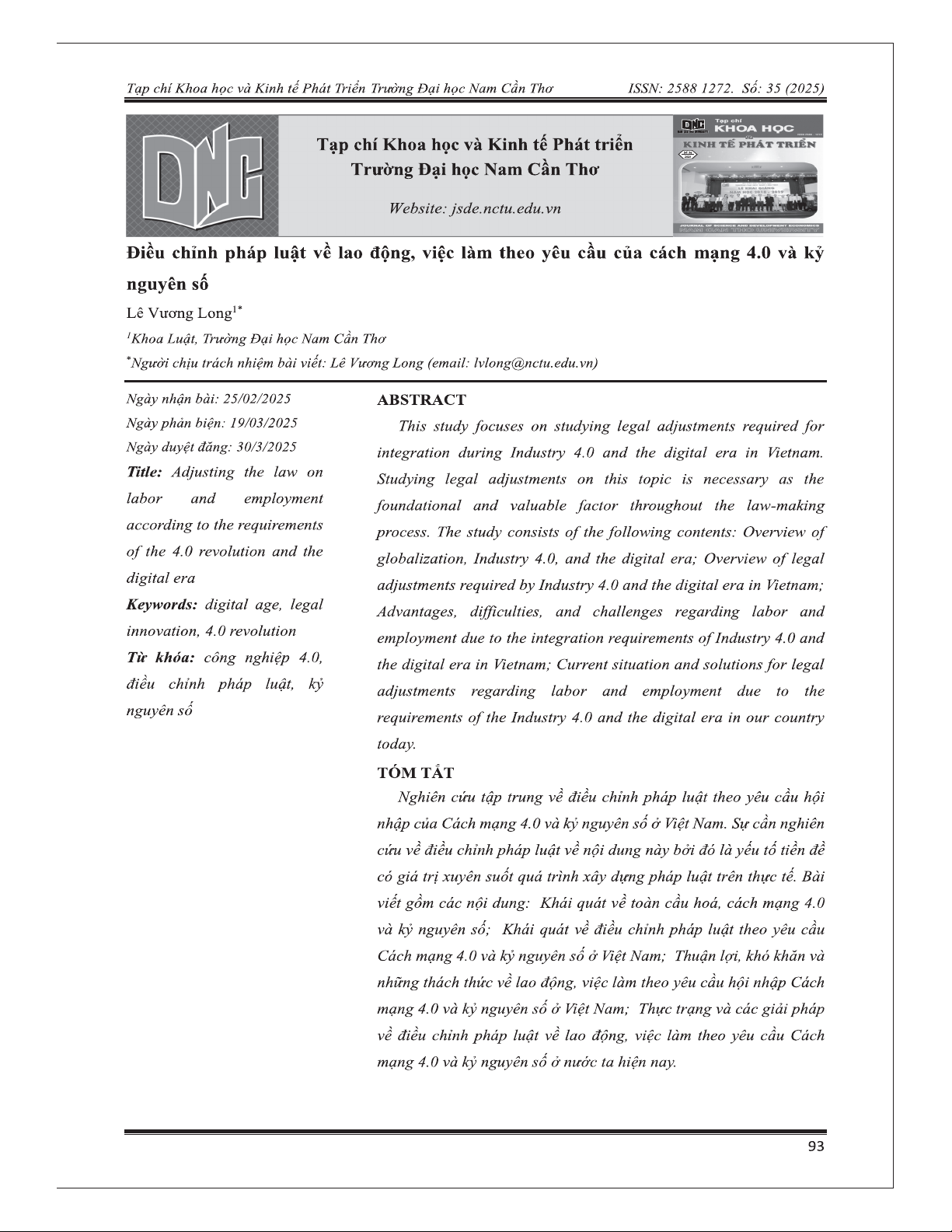 Nghiên cứu này tập trung phân tích sự cần thiết của việc điều chỉnh pháp luật về lao động và việc làm tại Việt Nam nhằm đáp ứng yêu cầu hội nhập trong bối cảnh Cách mạng công nghiệp 4.0 và kỷ nguyên số. Bài viết làm rõ tầm quan trọng của việc điều chỉnh pháp luật như một yếu tố nền tảng trong quá trình xây dựng và thực thi pháp luật. Nội dung nghiên cứu bao gồm tổng quan về toàn cầu hóa, Cách mạng công nghiệp 4.0 và kỷ nguyên số, đồng thời khái quát các yêu cầu điều chỉnh pháp luật trong giai đoạn này. Tác giả đi sâu phân tích những thuận lợi, khó khăn và thách thức mà lĩnh vực lao động, việc làm đang đối mặt do yêu cầu hội nhập, bao gồm cả những vấn đề như tư duy pháp luật lạc hậu, thiếu hụt cơ sở hạ tầng kỹ thuật số, tác động của AI đến việc làm, và tỷ lệ lao động phi chính thức cao. Từ đó, bài viết trình bày thực trạng điều chỉnh pháp luật về lao động, việc làm ở Việt Nam, chỉ ra những kết quả bước đầu đạt được và các hạn chế còn tồn tại. Cuối cùng, nghiên cứu đề xuất một loạt các giải pháp toàn diện nhằm hoàn thiện hệ thống pháp luật, bao gồm việc đổi mới tư duy lập pháp, phát triển thị trường lao động linh hoạt và hiệu quả, cải cách chính sách bảo hiểm thất nghiệp, đầu tư vào phát triển nguồn nhân lực chất lượng cao, tăng cường quản lý nhà nước, và bảo vệ quyền sở hữu trí tuệ trong môi trường số. Mục tiêu là xây dựng một khuôn khổ pháp lý vững chắc, thích ứng, góp phần giải phóng sức lao động và tạo việc làm bền vững trong nền kinh tế số.