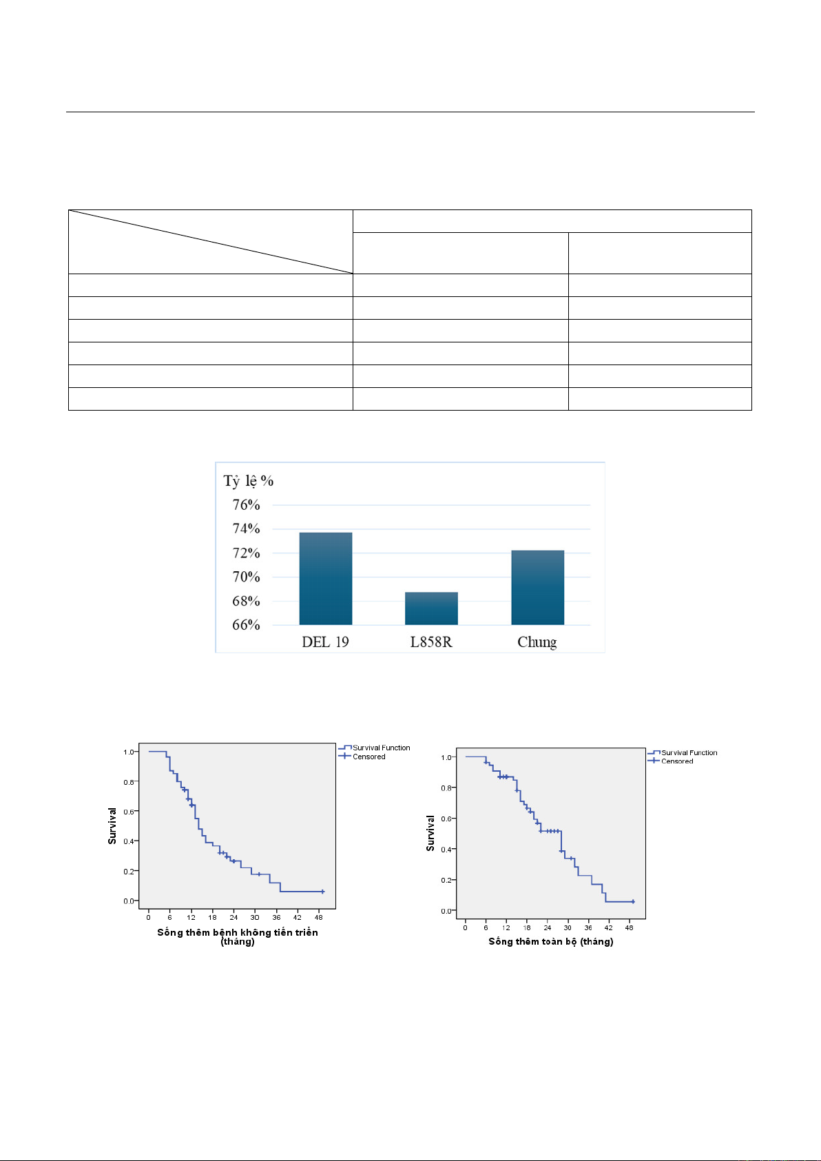trung vị OS là 28 tháng. Trung vị PFS của BN mang đột biến xóa đoạn exon 19 và L858R đều là 14 tháng.