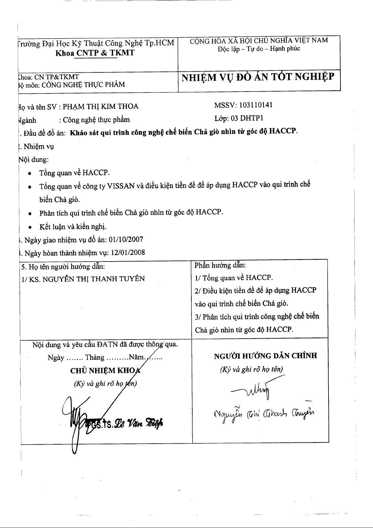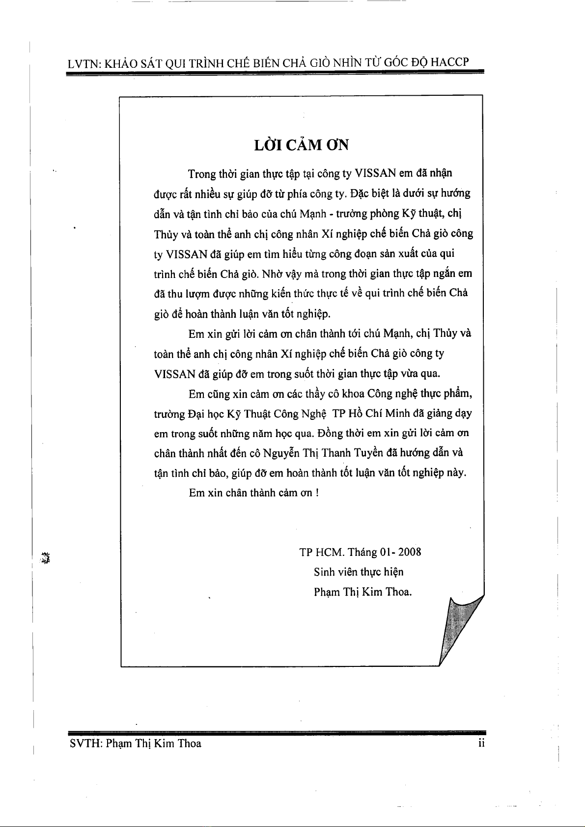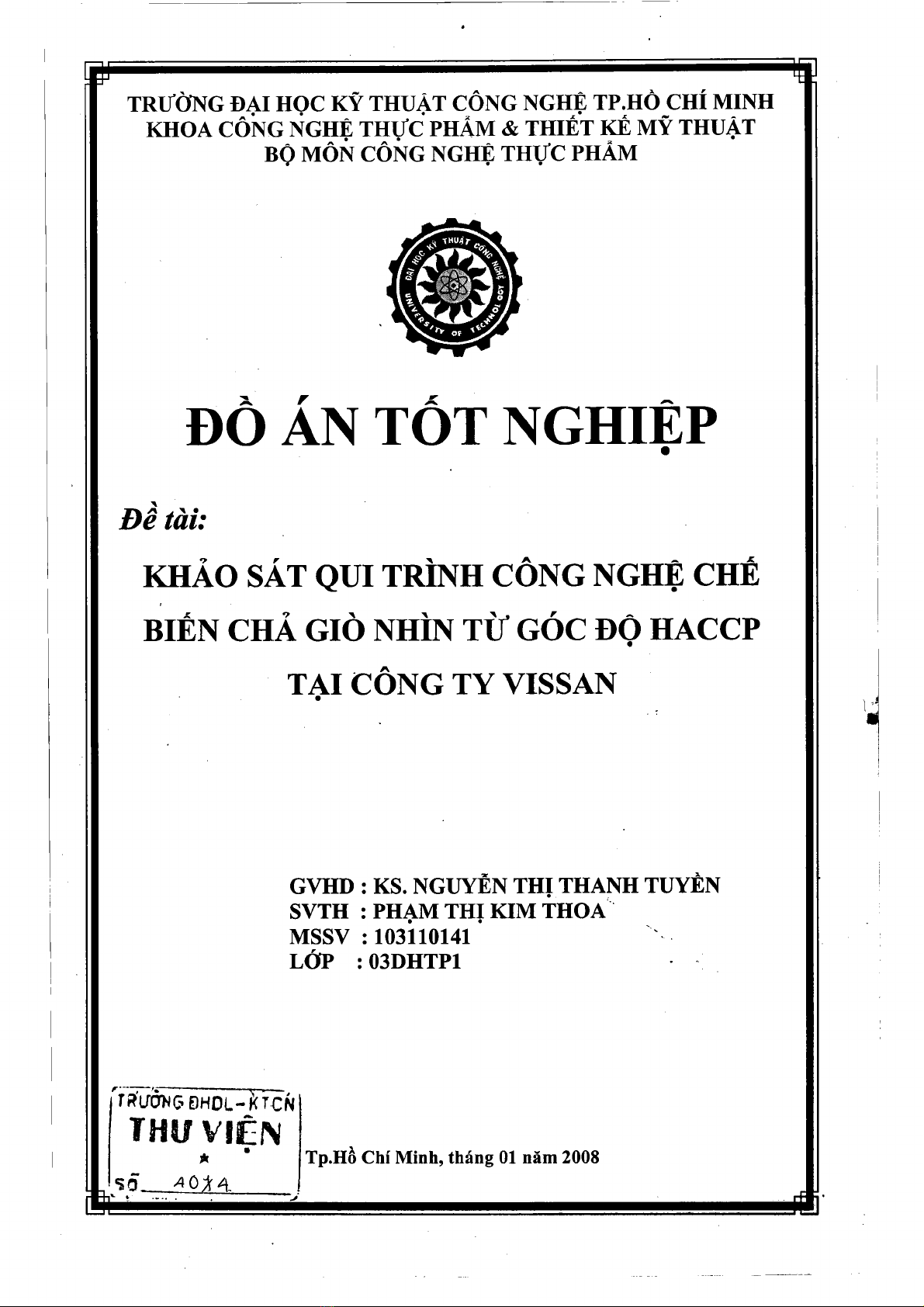 Luận văn tốt nghiệp này tập trung vào việc khảo sát quy trình công nghệ chế biến chả giò tại Công ty VISSAN dưới góc độ hệ thống HACCP, một công cụ quản lý chất lượng phòng ngừa được công nhận rộng rãi trên toàn thế giới. Nội dung luận văn được cấu trúc thành bốn chương chính. Chương 1 cung cấp tổng quan về HACCP, bao gồm lịch sử hình thành, những nguyên tắc cơ bản và lợi ích của việc áp dụng hệ thống này. Chương 2 đi sâu vào các điều kiện tiên quyết cần thiết để áp dụng HACCP vào quy trình chế biến chả giò, bao gồm giới thiệu tổng quan về Công ty VISSAN, phân tích thực trạng mặt bằng sản xuất và cơ sở hạ tầng theo tiêu chuẩn GMP, cũng như phân tích các quy phạm vệ sinh chuẩn (SSOP). Chương 3 là phần trọng tâm, phân tích chi tiết quy trình công nghệ chế biến chả giò từ góc độ HACCP. Chương này trình bày việc xây dựng hệ thống HACCP cho quy trình, thẩm định quy trình và nhận dạng các mối nguy, mô tả mối nguy và xác định các điểm kiểm soát tới hạn (CCP) dựa trên cây quyết định, tổng hợp và thẩm tra kế hoạch HACCP, thiết lập hệ thống tài liệu lưu trữ hồ sơ, và đánh giá chất lượng sản phẩm. Cuối cùng, Chương 4 đưa ra kết luận và các kiến nghị cụ thể dựa trên những phát hiện của quá trình khảo sát, nhằm cải thiện hơn nữa quy trình sản xuất và đảm bảo an toàn thực phẩm cho sản phẩm chả giò.
