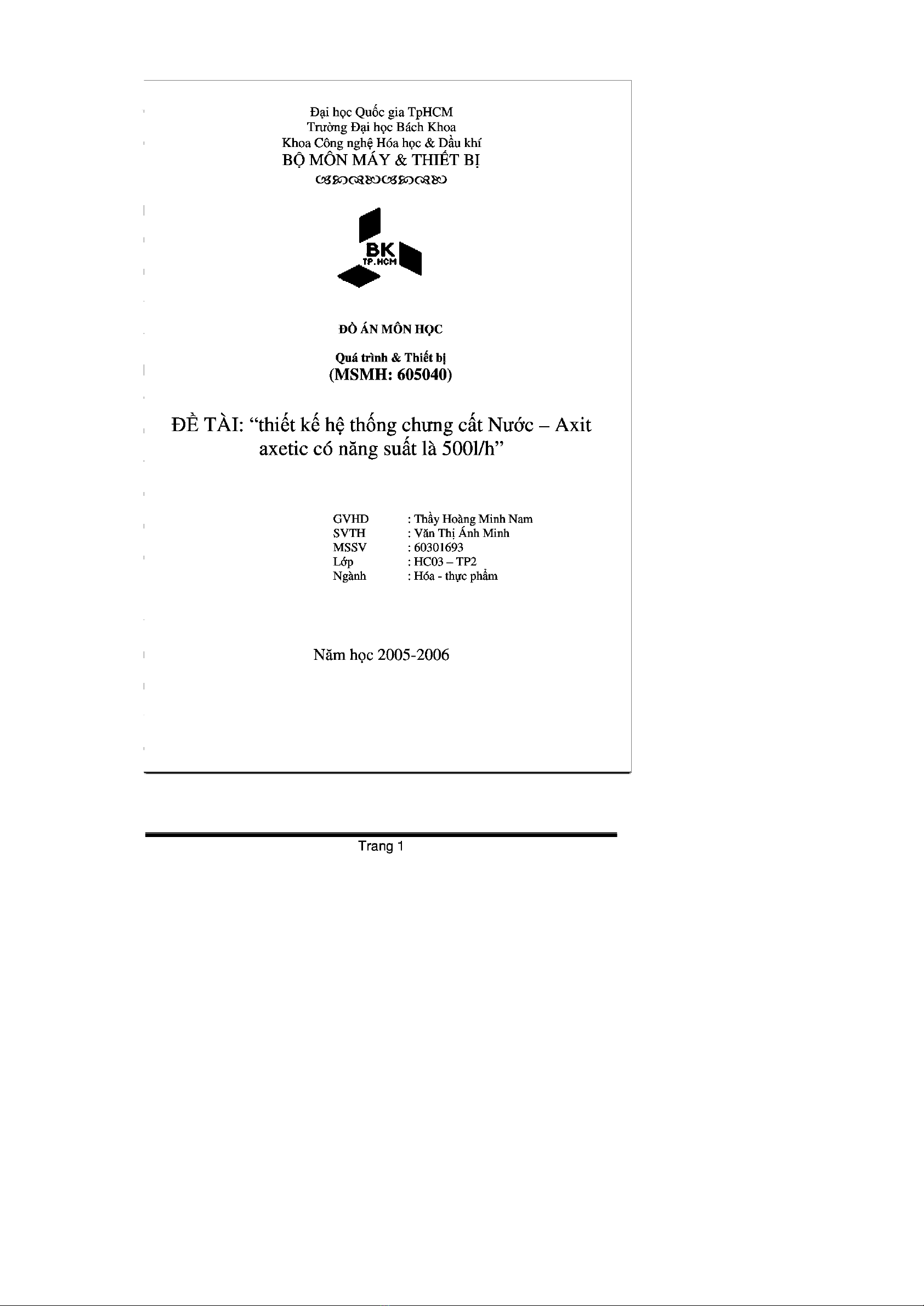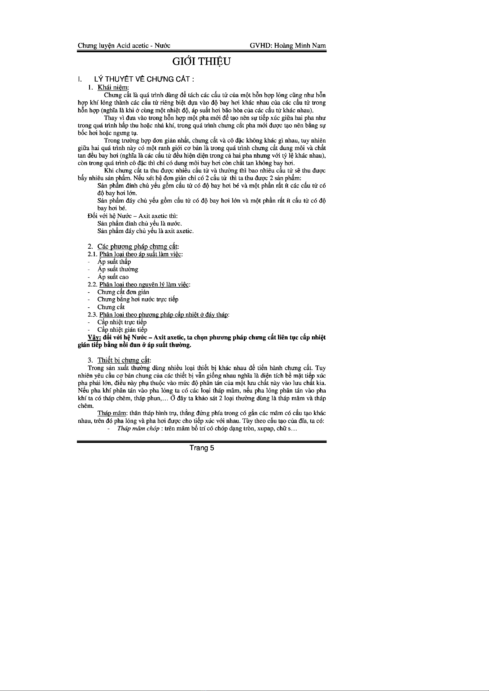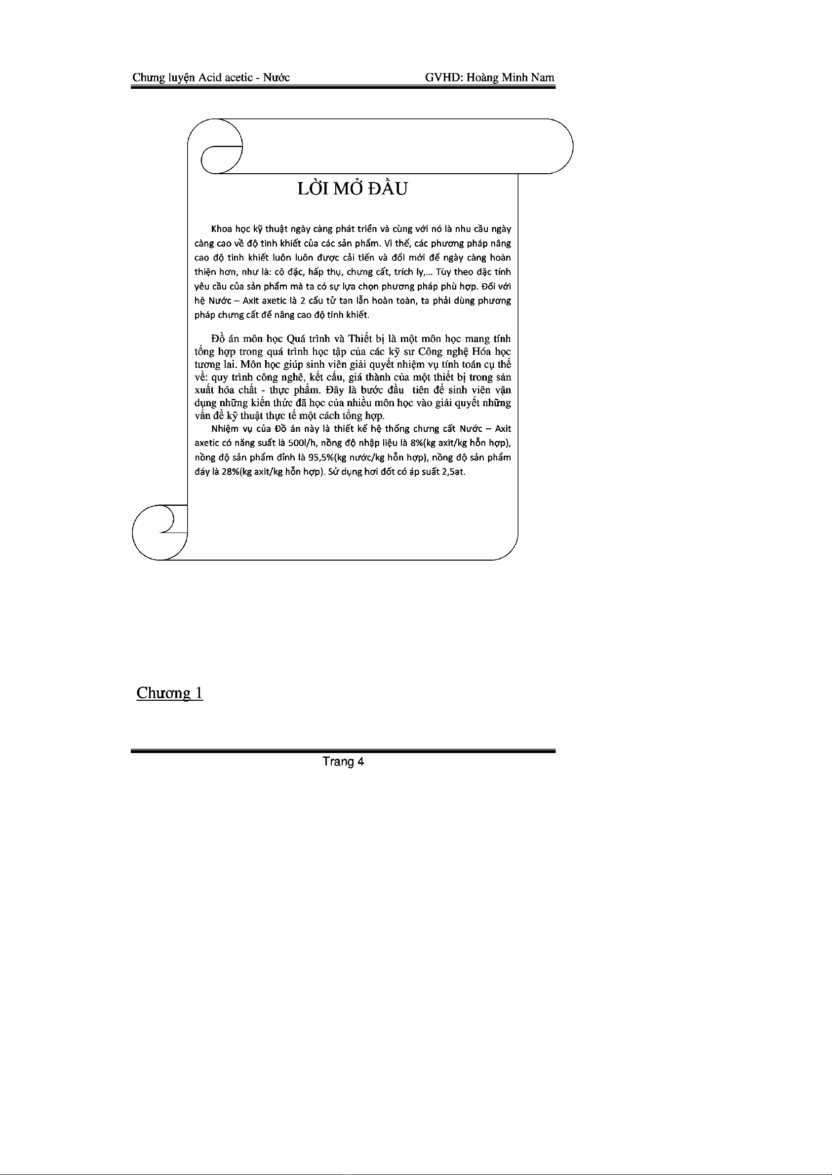 Nhiệm vụ của đồ án này là thiết kế hệ thống chưng cất nước-axetic có năng suất là 500l/h, nồng độ nhập liệu là 8%(kg axit/kg hỗn hợp), nồng độ sản phẩm ssinhr là 95,5% (kg nước/kg hỗn hợp), nồng độ sản phẩm đáy là 28% (kg axit/kg hỗn hợp). Sử dụng hơi đốt có áp suất 2,5at.