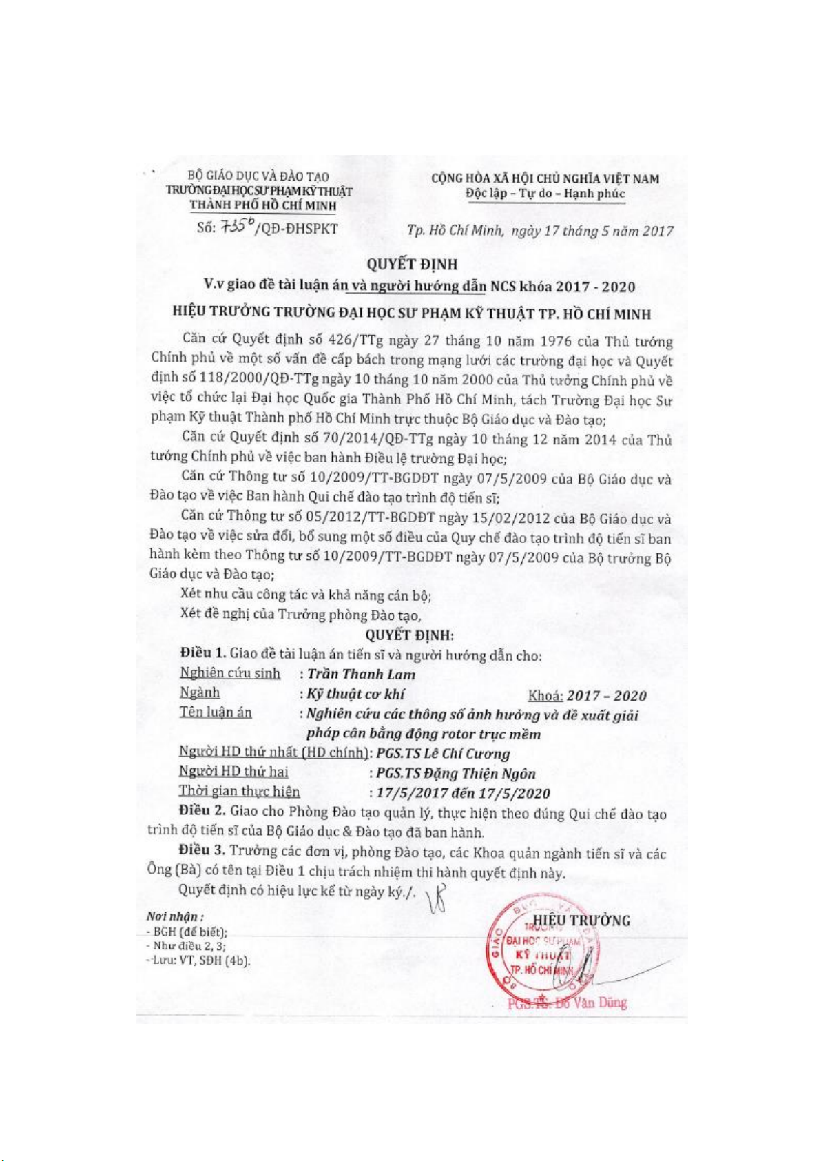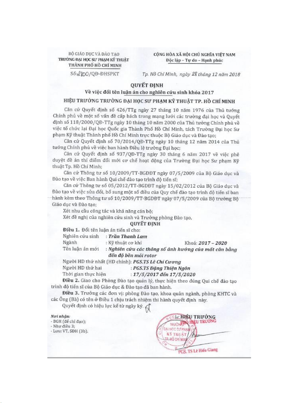 Luận án này tập trung nghiên cứu ảnh hưởng của mất cân bằng đến độ bền mỏi rotor trong các hệ thống truyền động quay. Nghiên cứu đã xác định các thông số kỹ thuật then chốt ảnh hưởng trực tiếp đến mất cân bằng động của trục quay, bao gồm tốc độ quay, khối lượng lệch tâm và vị trí khối lượng mất cân bằng. Các kết quả cho thấy rung động trở nên không ổn định và biên độ dịch chuyển tăng đáng kể khi tốc độ quay đạt đến tốc độ tới hạn. Đặc biệt, việc tăng lượng mất cân bằng lên đến cấp G40 làm tăng biên độ dịch chuyển, với trường hợp G41.3 ghi nhận biên độ dao động vượt qua cả tốc độ tới hạn 1, nhấn mạnh sự cần thiết phải tránh các biên độ này để đảm bảo rotor hoạt động ổn định, lâu dài. Hơn nữa, sự thay đổi góc pha ban đầu của khối lượng thử nghiệm có thể làm biến đổi pha rung động, dẫn đến tăng hoặc giảm ứng suất uốn và khả năng gây hỏng hóc trục quay. Về phương pháp, luận án chứng minh phương pháp Newmark-β là một cách tiếp cận đáng tin cậy để phân tích hành vi của hệ thống rotor, mang lại độ ổn định, hội tụ nhanh và độ chính xác cao với sai số dưới 6% so với thực nghiệm. Một máy thử nghiệm mỏi mới đã được phát triển để nghiên cứu tuổi thọ mỏi của trục truyền động không cân bằng ở tốc độ thử nghiệm lên đến 3000 vòng/phút. Các thử nghiệm mỏi chỉ ra rằng các yếu tố mất cân bằng như khối lượng thử, tốc độ vận hành và bán kính tải thử làm giảm giới hạn mỏi và độ bền mỏi của các mẫu so với trục uốn thuần túy. Từ đó, một đường cong mỏi S-N cho trục thép C45 dưới tải trọng không cân bằng đã được xây dựng. Biên độ dịch chuyển tăng theo chu kỳ tải trọng, có thể do sự hình thành và lan truyền của các vết nứt mỏi, làm khuếch đại ảnh hưởng của lực không cân bằng lên trục. Những phát hiện này cung cấp hiểu biết sâu sắc về thiết kế và vận hành an toàn các hệ thống rotor.