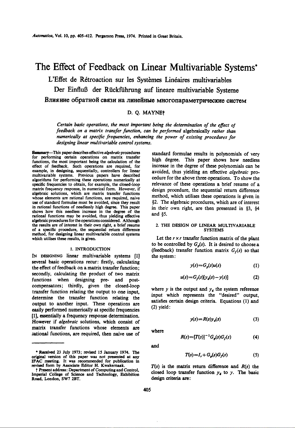 revised form by Associate Editor H. Kwakernaak.