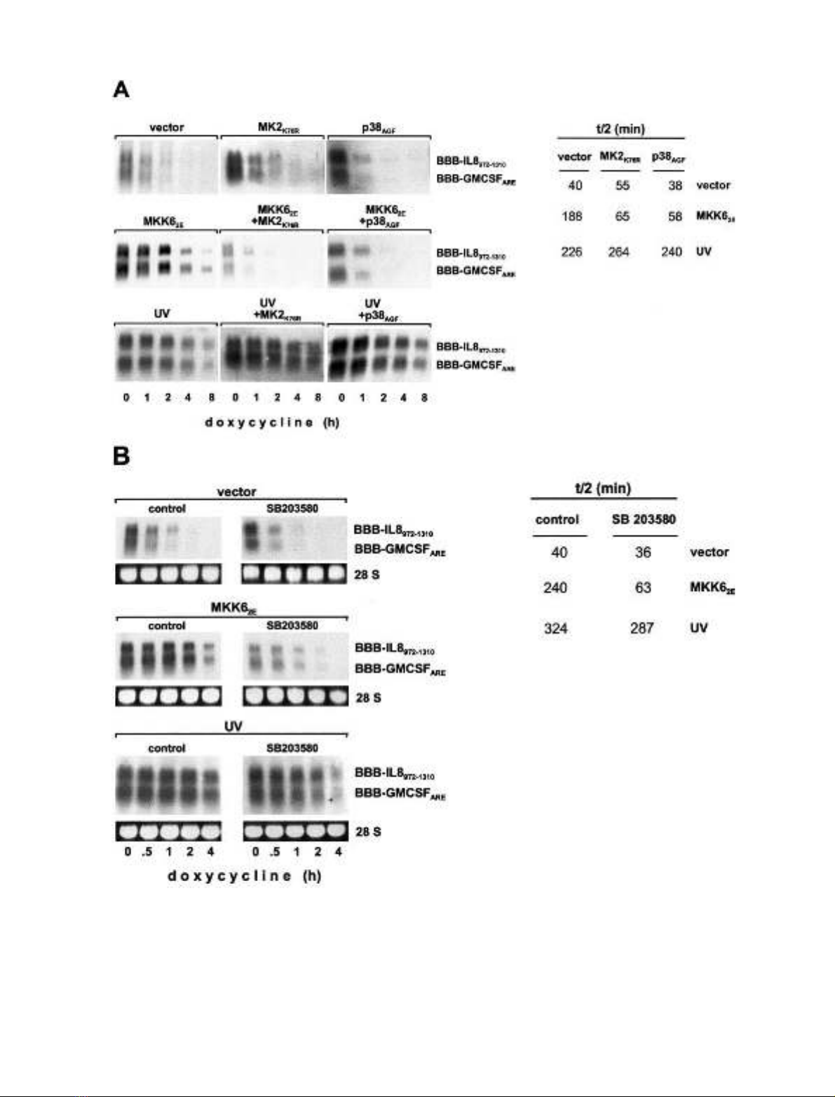 Fig. 2. mRNA stabilization by UV light is independent of the p38/MK2 pathway. Degradation of BBB-IL-8