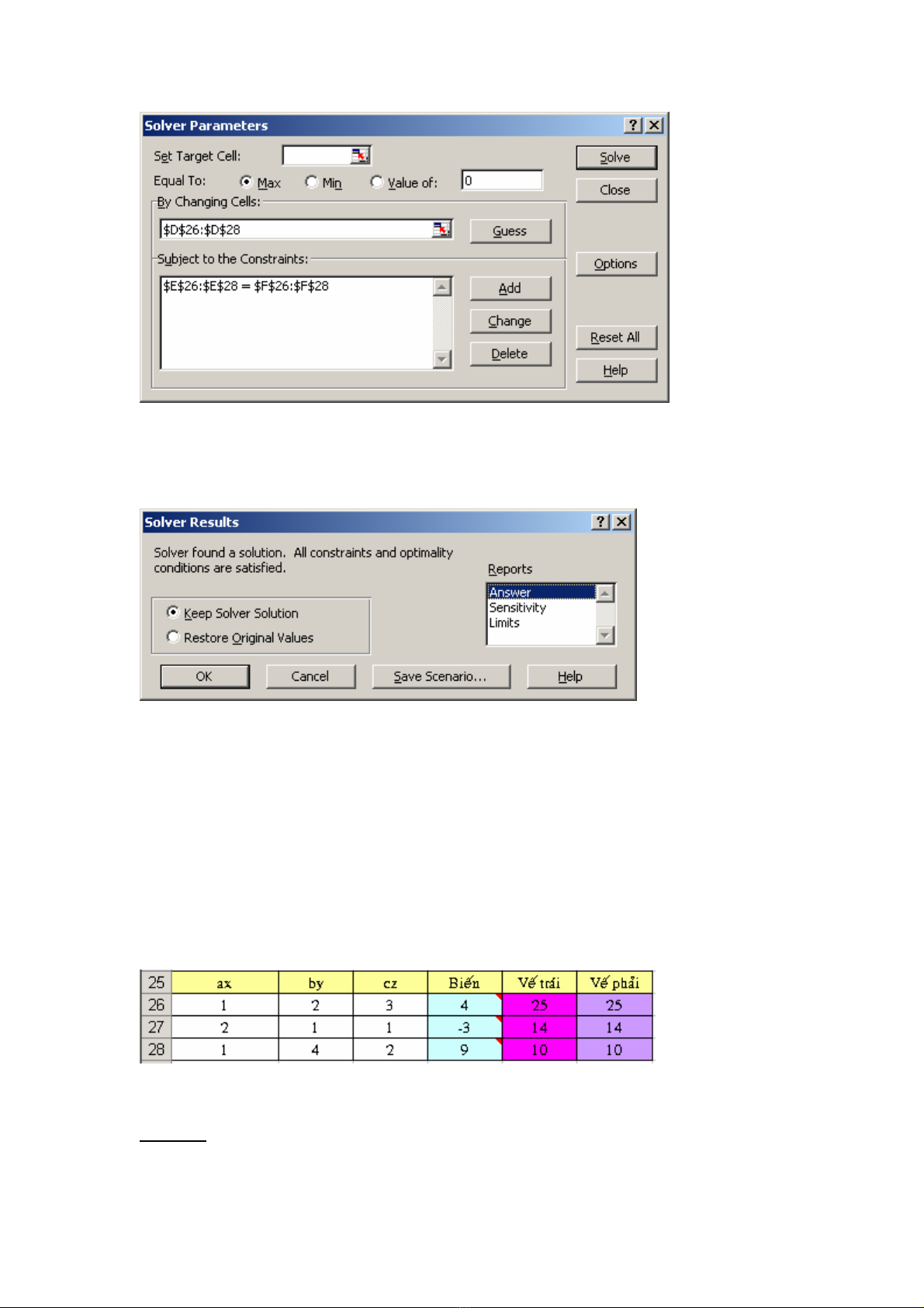 B4. Choïn Keep Solver Solution ñeå löu keát quaû treân baûng tính. Choïn Restore