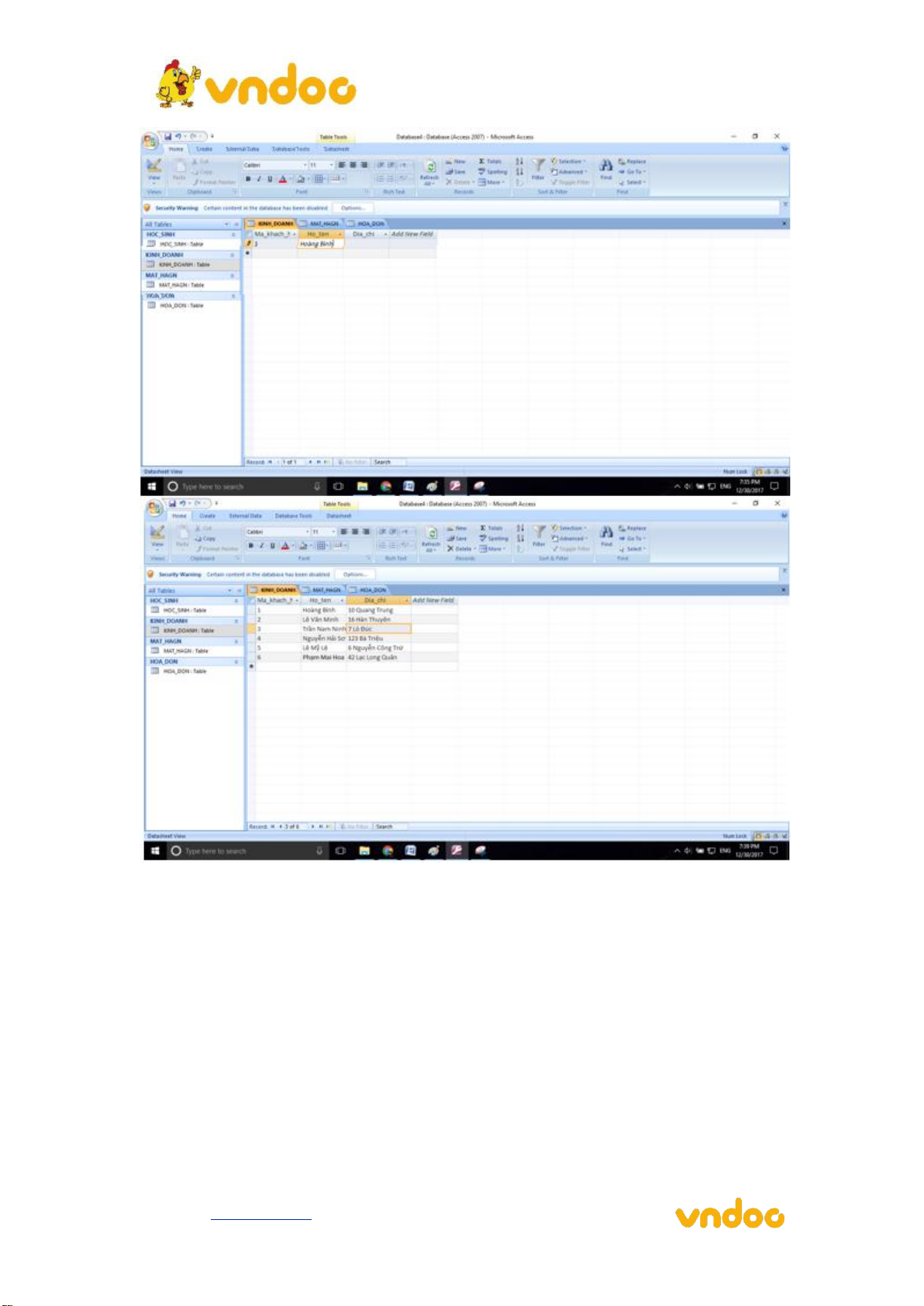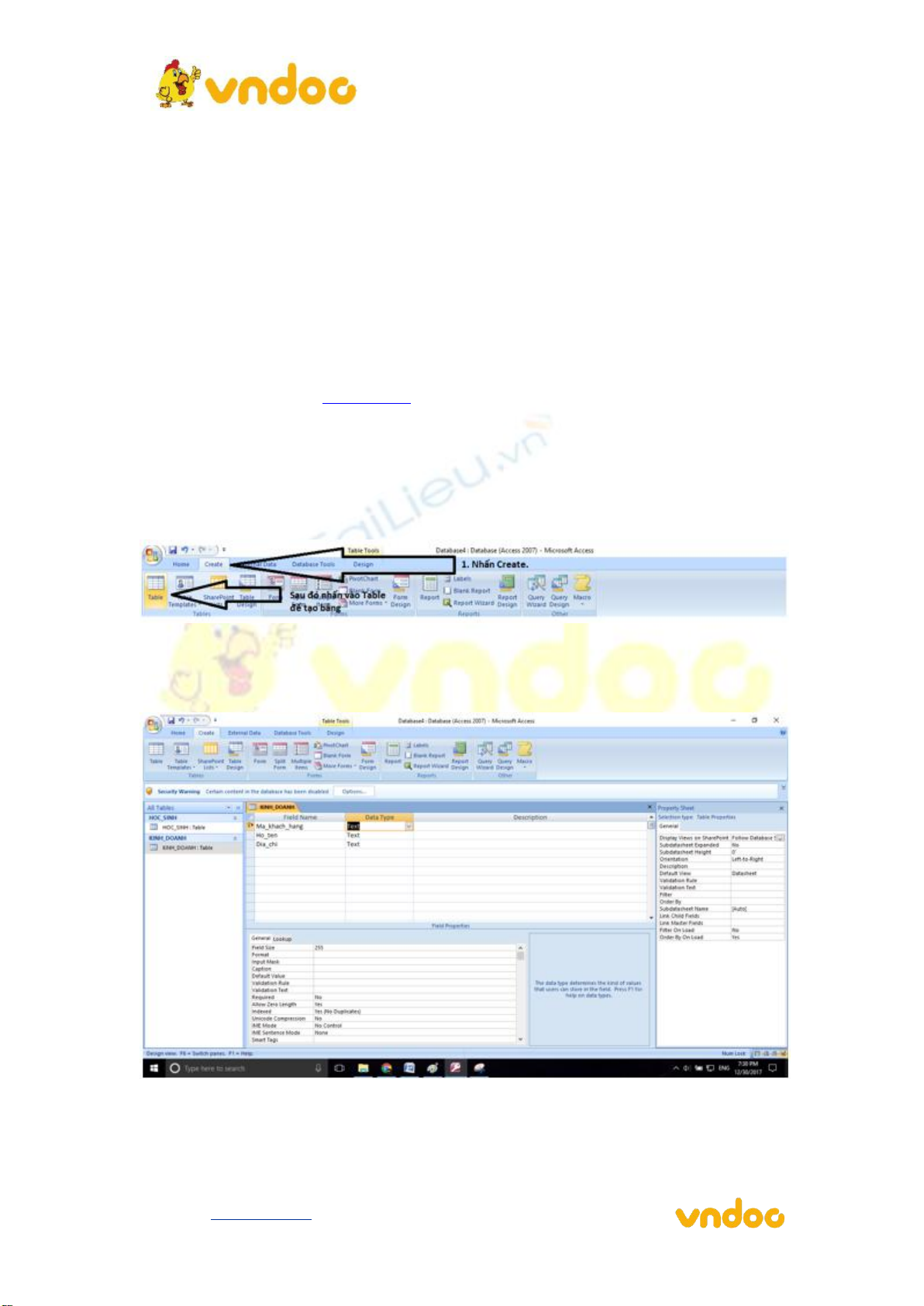 Câu 1: (sgk trang 61 Tin học 12): Tạo CSDL KINH_DOANH gồm ba bảng có