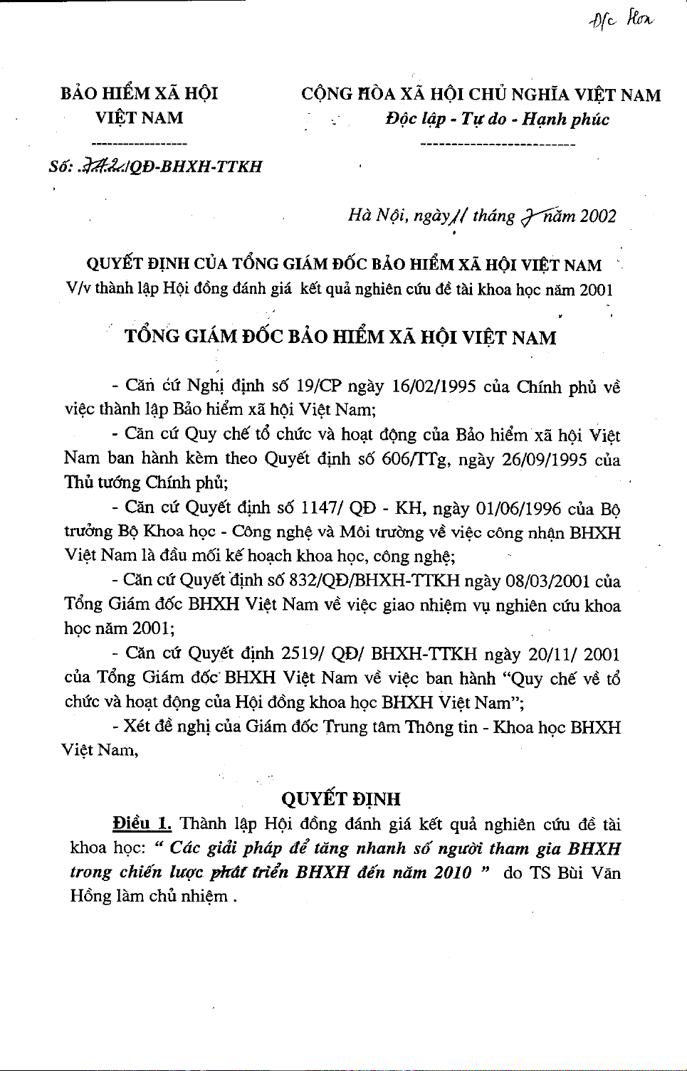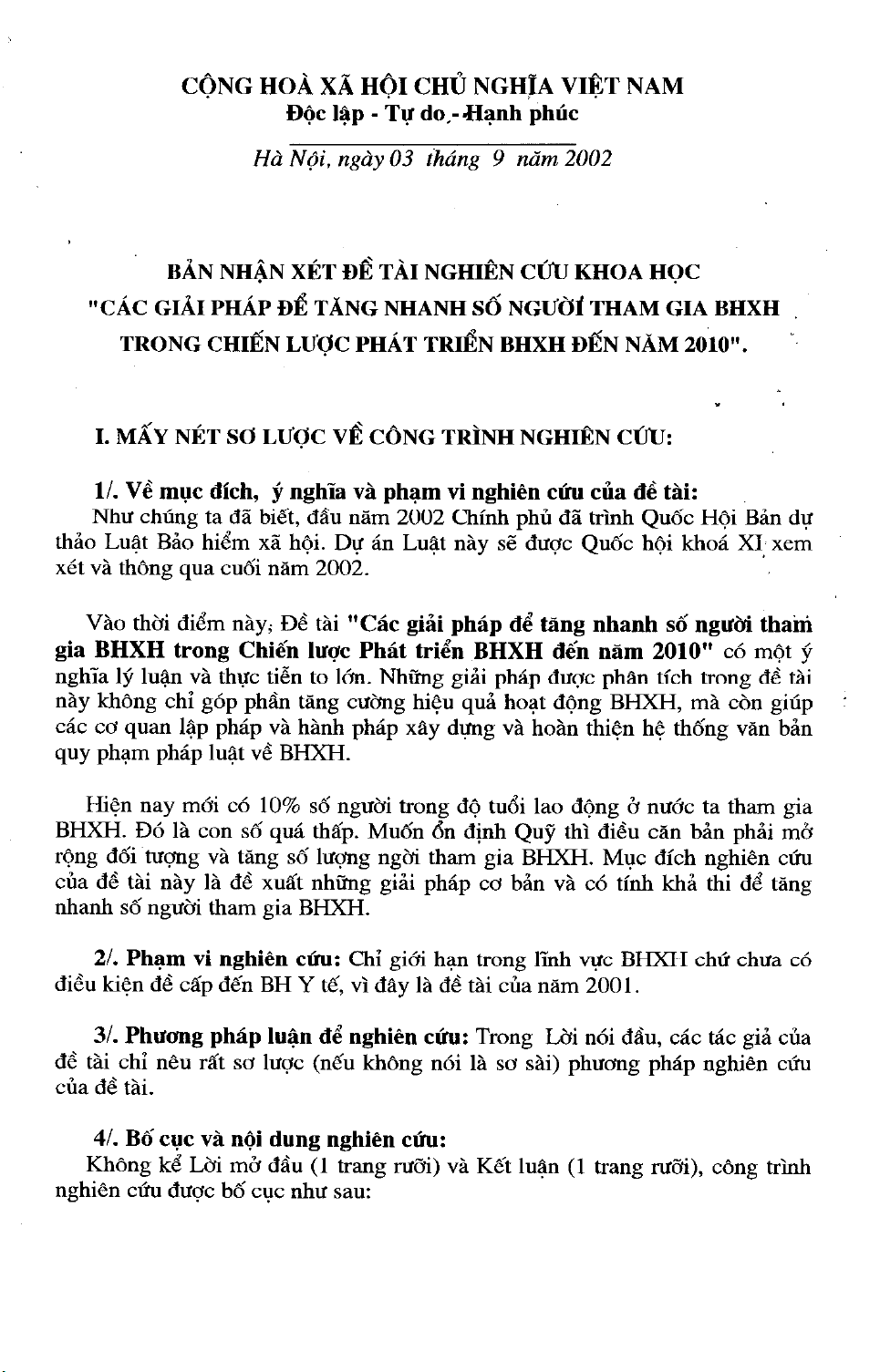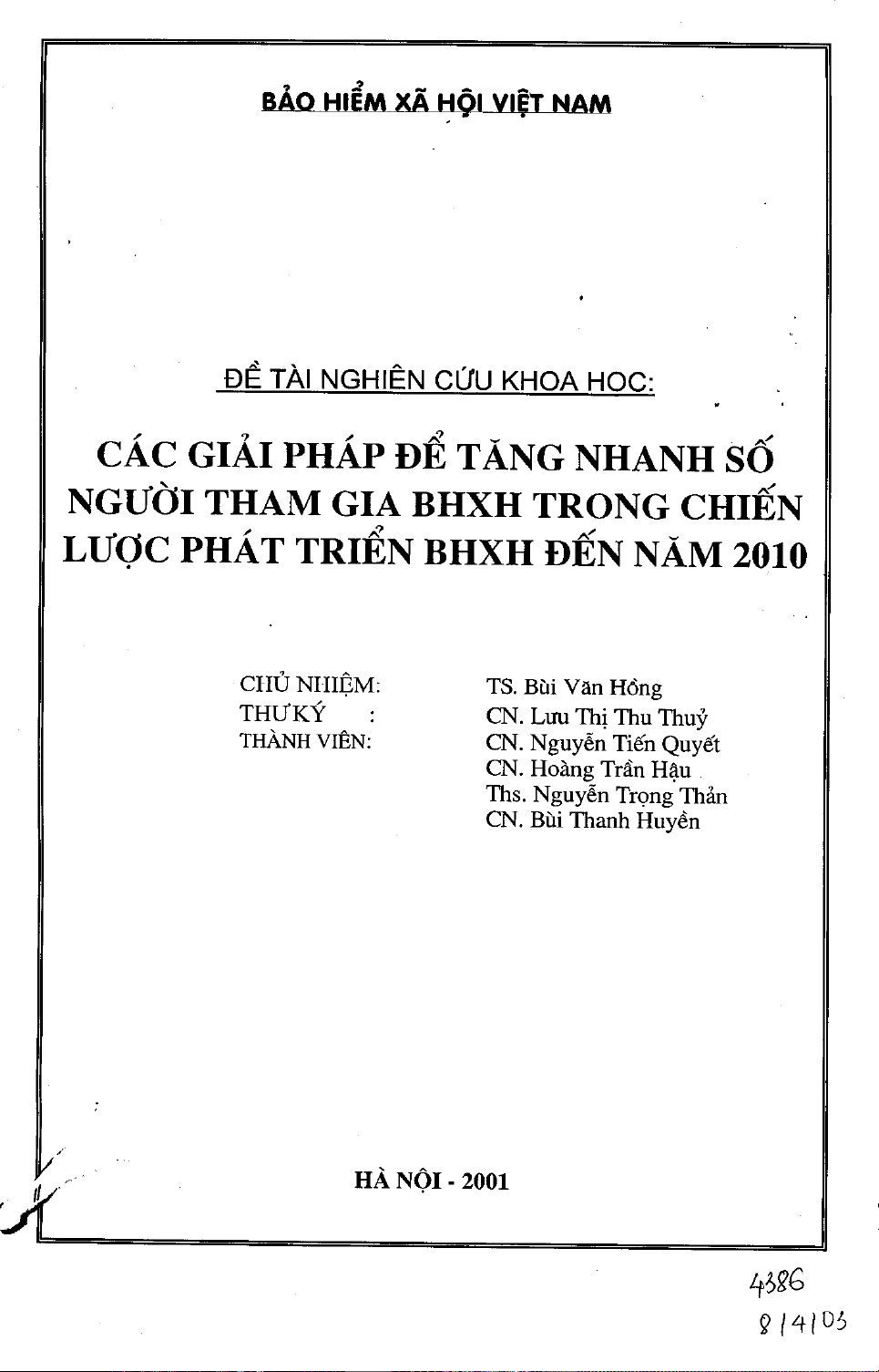 Đề tài nghiên cứu khoa học này tập trung vào việc phân tích và đề xuất các giải pháp nhằm tăng nhanh số lượng người tham gia Bảo hiểm xã hội (BHXH) tại Việt Nam, hướng tới mục tiêu phát triển BHXH đến năm 2010. Vào thời điểm nghiên cứu (năm 2001), tỷ lệ tham gia BHXH còn thấp, chỉ chiếm khoảng 10% lực lượng lao động trong độ tuổi, đặt ra thách thức lớn trong việc đảm bảo tính bền vững của quỹ BHXH và thực hiện các mục tiêu chiến lược của ngành.