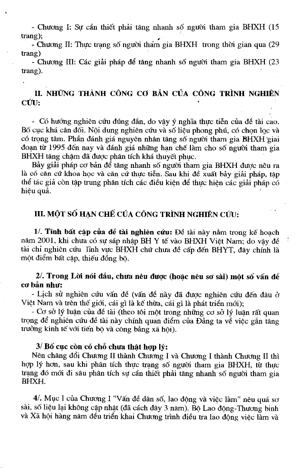 Nghiên cứu này là một đề tài khoa học có ý nghĩa quan trọng, được thực hiện trong bối cảnh Việt Nam đang đẩy mạnh cải cách chính sách BHXH và mở rộng đối tượng tham gia. Mục tiêu chính của đề tài là đánh giá thực trạng số lượng người tham gia BHXH, phân tích các nguyên nhân dẫn đến sự tăng trưởng chậm, và đề xuất các giải pháp khả thi nhằm đạt được mục tiêu chiến lược là tăng số người tham gia BHXH lên 12,5 triệu người vào năm 2010, tương đương khoảng 22% lực lượng lao động trong độ tuổi. Đề tài được cấu trúc thành ba chương chính. Chương I tập trung làm rõ sự cần thiết phải tăng nhanh số người tham gia BHXH, thông qua việc phân tích tiềm năng từ các yếu tố dân số, lao động, việc làm và thu nhập. Đồng thời, chương này nhấn mạnh vai trò của quy luật 'lấy số đông bù số ít' trong việc đảm bảo cân đối quỹ BHXH và thảo luận về sự phù hợp của mô hình cân đối quỹ dài hạn đối với Việt Nam. Chương II trình bày thực trạng số người tham gia BHXH qua các thời kỳ, từ giai đoạn trước năm 1995 (chủ yếu áp dụng cho công chức, viên chức) đến giai đoạn từ năm 1995 trở đi (mở rộng sang khu vực ngoài quốc doanh). Dù số người tham gia đã tăng đáng kể từ 2,8 triệu (năm 1996) lên 4,4 triệu (năm 2001), tỷ lệ này vẫn còn thấp so với tổng lực lượng lao động. Chương này cũng phân tích các nguyên nhân thúc đẩy tăng trưởng (như cải cách chính sách, hoàn thiện văn bản pháp luật, tăng cường công tác quản lý thu, đẩy mạnh thông tin tuyên truyền) và những hạn chế còn tồn tại (bao gồm các vướng mắc trong quy định pháp lý, sự phối hợp chưa đồng bộ, chế tài xử phạt chưa hiệu quả, và thu nhập của người lao động còn thấp). Chương III đề xuất các giải pháp cụ thể nhằm tăng nhanh số người tham gia BHXH, bao gồm việc mở rộng đối tượng tham gia (như lao động trong hợp tác xã, doanh nghiệp dưới 10 lao động), đề xuất chính sách BHXH tự nguyện, tăng cường công tác thông tin tuyên truyền, và hoàn thiện cơ chế chính sách. Các giải pháp này được xây dựng dựa trên việc tham khảo kinh nghiệm quốc tế và đánh giá điều kiện thực tiễn của Việt Nam. Mặc dù đề tài còn một số hạn chế như chưa đề cập đến Bảo hiểm y tế (do giới hạn thời gian nghiên cứu năm 2001), phương pháp luận và cơ sở lý luận được trình bày còn sơ sài, và bố cục có thể được tối ưu hóa hơn, nghiên cứu này vẫn được đánh giá cao về ý nghĩa lý luận và thực tiễn. Nó cung cấp một cái nhìn toàn diện về tình hình BHXH tại Việt Nam và đưa ra những khuyến nghị quan trọng, góp phần vào việc phát triển bền vững hệ thống an sinh xã hội quốc gia.