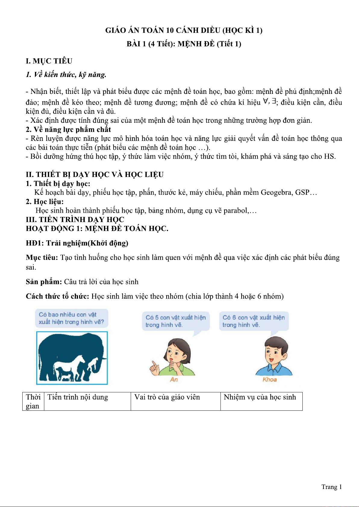 Tài liệu này là một giáo án chi tiết dành cho môn Toán lớp 10, học kỳ 1, tập trung vào Bài 1: Mệnh đề (Tiết 1 và Tiết 2). Giáo án được thiết kế nhằm giúp học sinh nhận biết, thiết lập và phát biểu các loại mệnh đề toán học cơ bản, đồng thời rèn luyện khả năng xác định tính đúng sai của chúng.