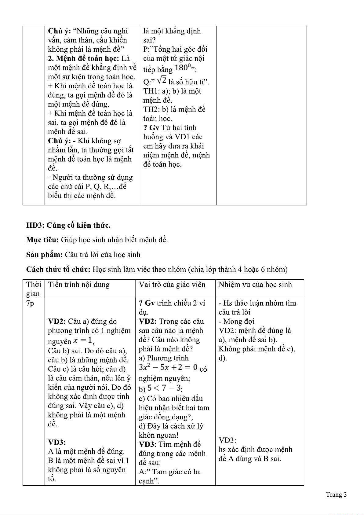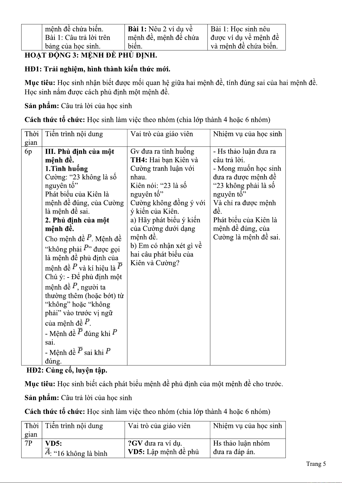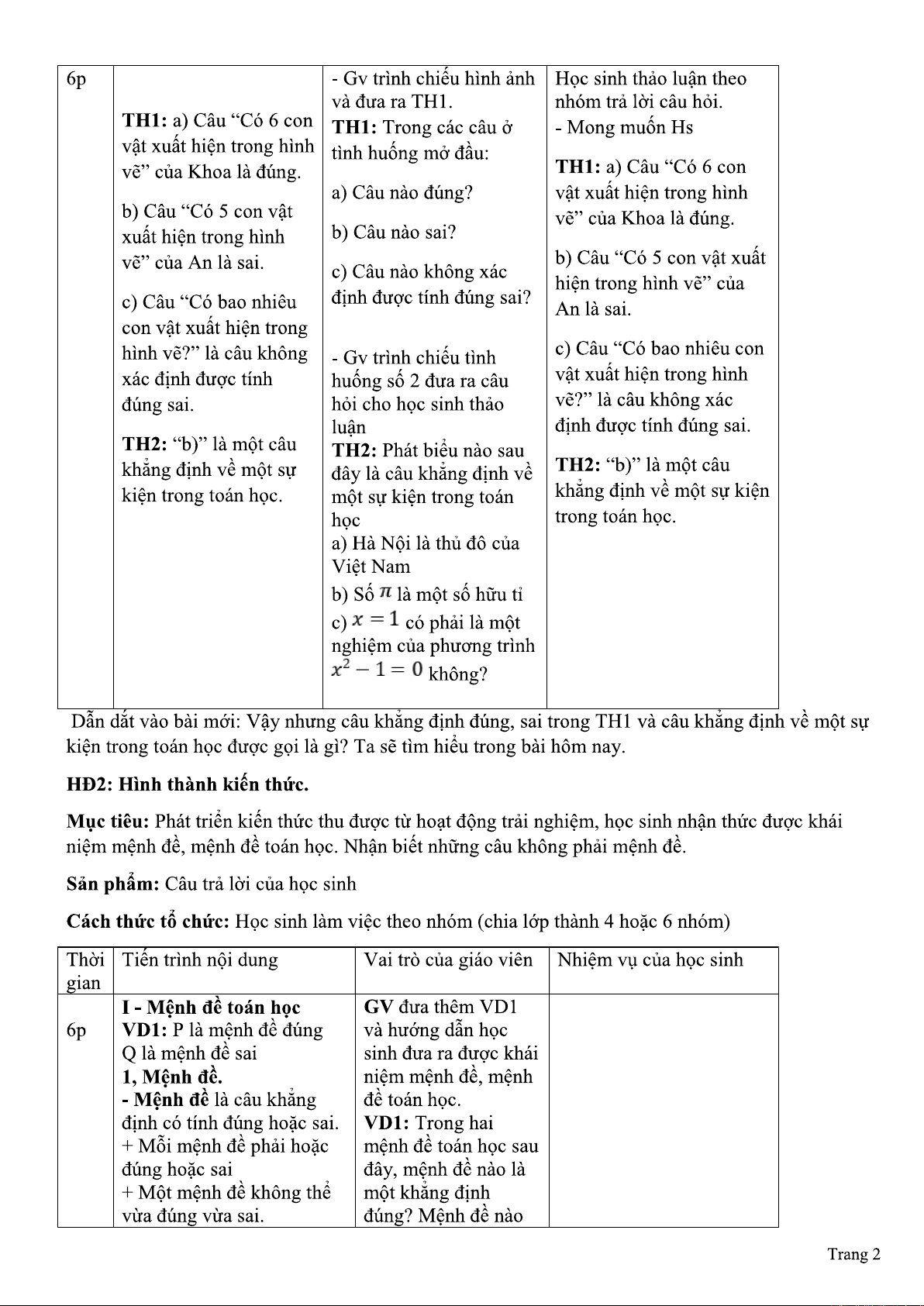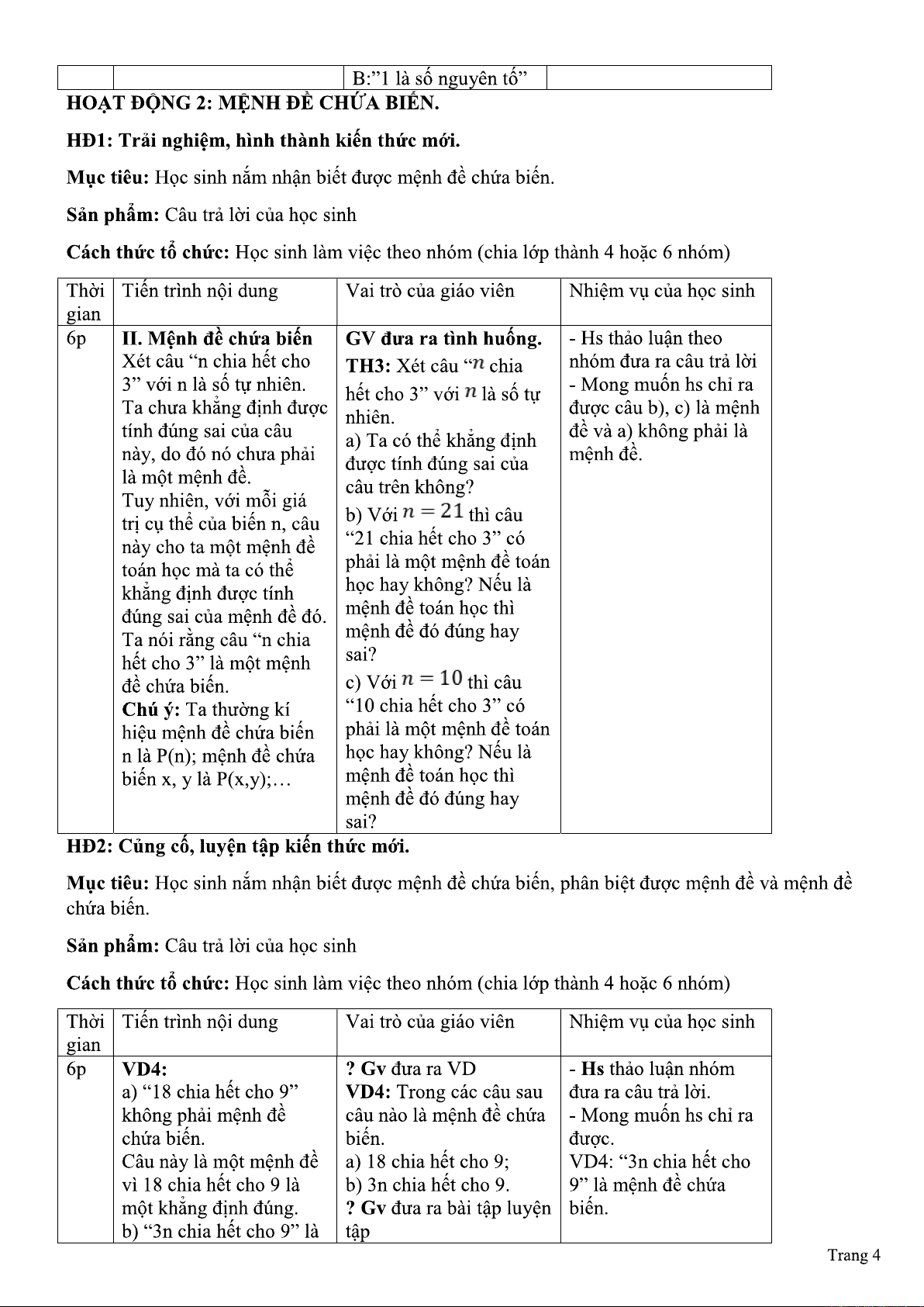 Giáo án này trình bày chi tiết nội dung và phương pháp giảng dạy bài 'Mệnh đề' trong chương trình Toán lớp 10, bao gồm các tiết học đầu tiên. Tài liệu được cấu trúc theo các hoạt động chính: Trải nghiệm (khởi động), Hình thành kiến thức và Củng cố kiến thức, với mục tiêu phát triển kiến thức và năng lực phẩm chất cho học sinh. Cụ thể, giáo án hướng dẫn học sinh nhận biết và định nghĩa mệnh đề, mệnh đề toán học, phân biệt chúng với các câu không phải mệnh đề. Tiếp theo, học sinh sẽ làm quen với khái niệm mệnh đề chứa biến và cách xác định tính đúng sai của chúng khi biến được gán giá trị cụ thể. Phần quan trọng khác là việc hình thành và củng cố kiến thức về mệnh đề phủ định, bao gồm cách phát biểu và mối quan hệ về tính đúng sai với mệnh đề gốc. Giáo án cũng đi sâu vào mệnh đề kéo theo (P => Q), giải thích các thành phần giả thiết và kết luận, cùng với khái niệm điều kiện cần và điều kiện đủ. Cuối cùng, tài liệu giới thiệu mệnh đề đảo (Q => P) và khái niệm hai mệnh đề tương đương (P <=> Q), nhấn mạnh các cách phát biểu khác nhau của mệnh đề tương đương và cách xác định tính đúng sai của chúng. Các hoạt động đều được tổ chức theo nhóm, khuyến khích học sinh thảo luận, tìm tòi và khám phá.
