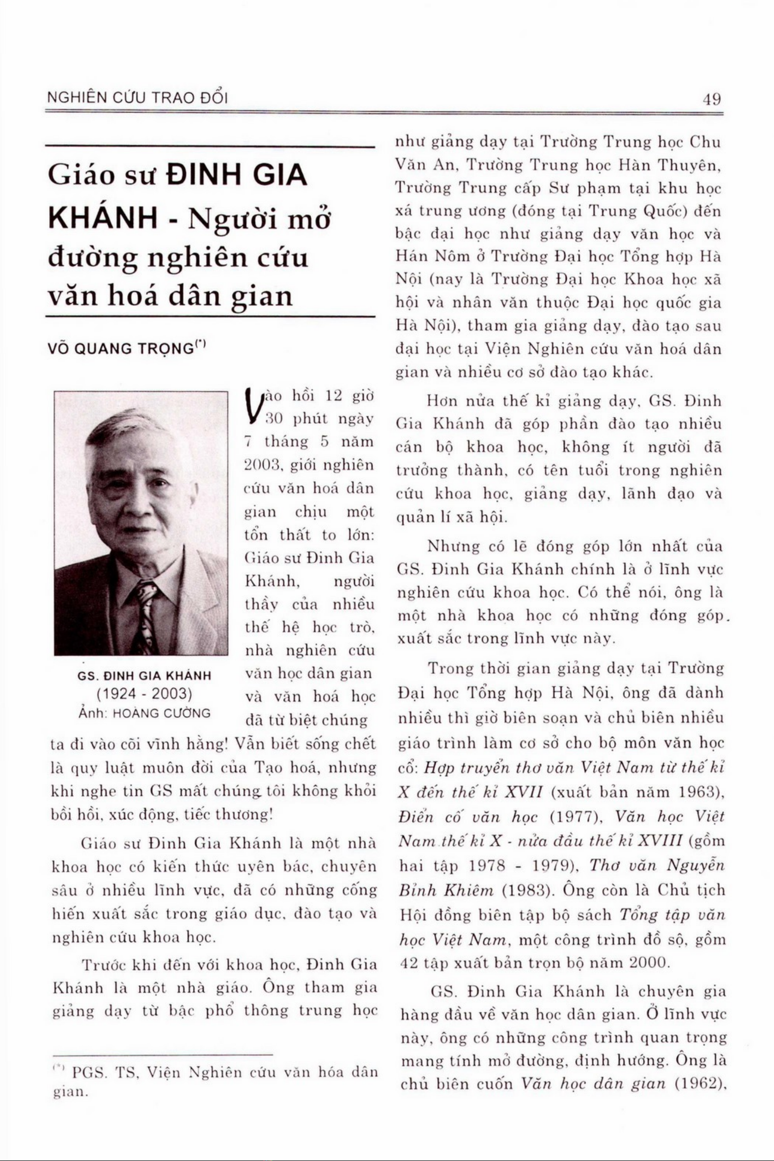 Giáo sư Đinh Gia Khánh là một nhân vật tiêu biểu trong lĩnh vực nghiên cứu văn hóa dân gian Việt Nam, có ảnh hưởng lớn đến việc bảo tồn và phát huy giá trị văn hóa truyền thống. Ông không chỉ là một nhà nghiên cứu uyên thâm mà còn là người tiên phong trong việc áp dụng các phương pháp khoa học hiện đại vào nghiên cứu văn hóa dân gian. Bài viết sẽ điểm qua quá trình hình thành tư duy nghiên cứu và những công trình nổi bật của giáo sứ Đinh Gia Khánh.