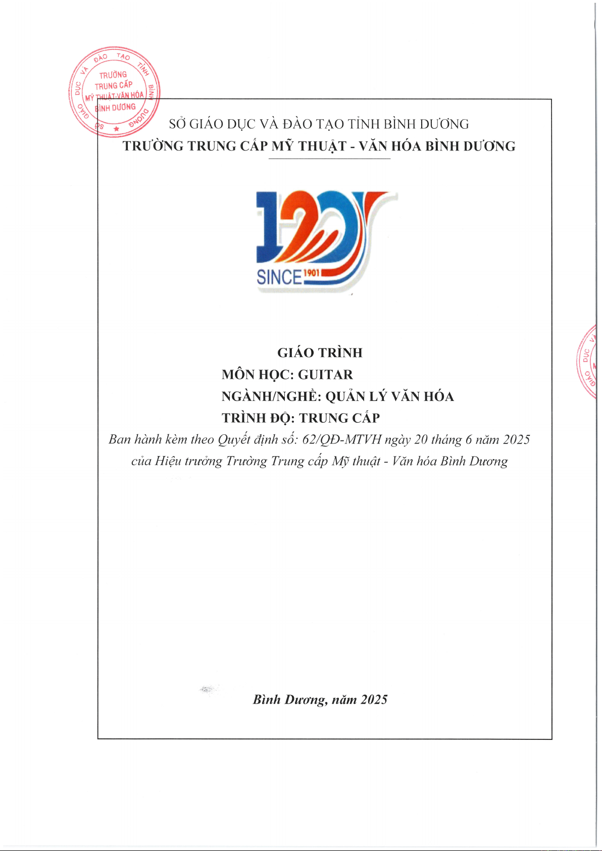 Giáo trình “Guitar” là tài liệu học tập toàn diện được thiết kế đặc biệt cho sinh viên ngành Quản lý Văn hóa trình độ trung cấp, đồng thời phù hợp với những người yêu âm nhạc và tự học guitar. Nội dung giáo trình được cấu trúc một cách logic, bắt đầu bằng việc giới thiệu chi tiết về cấu tạo và chức năng của cây đàn guitar, bao gồm các bộ phận chính như thùng đàn, cần đàn, dây đàn và phím đàn, cùng với hướng dẫn về tư thế cầm đàn và cách điều chỉnh dây đàn chính xác. Tiếp theo, tài liệu tập trung vào các kiến thức nhạc lý cơ bản, làm nền tảng để người học hiểu về nhịp điệu, nốt nhạc và các hợp âm cơ bản. Phần thực hành là trọng tâm với việc hướng dẫn các điệu đàn phổ biến trong âm nhạc như Rumba, Slowrock, Boston, Ballad và Disco, giúp người học phát triển kỹ năng biểu diễn độc tấu, hòa tấu và đệm hát. Giáo trình không chỉ truyền đạt kiến thức và kỹ năng mà còn khơi gợi niềm yêu thích, đam mê với âm nhạc, trang bị cho người học sự tự tin trong giao tiếp và thể hiện bản thân qua cây đàn guitar, góp phần vào sự phát triển cá nhân và chuyên môn trong lĩnh vực văn hóa.