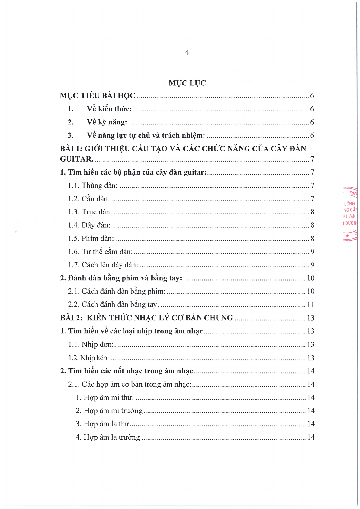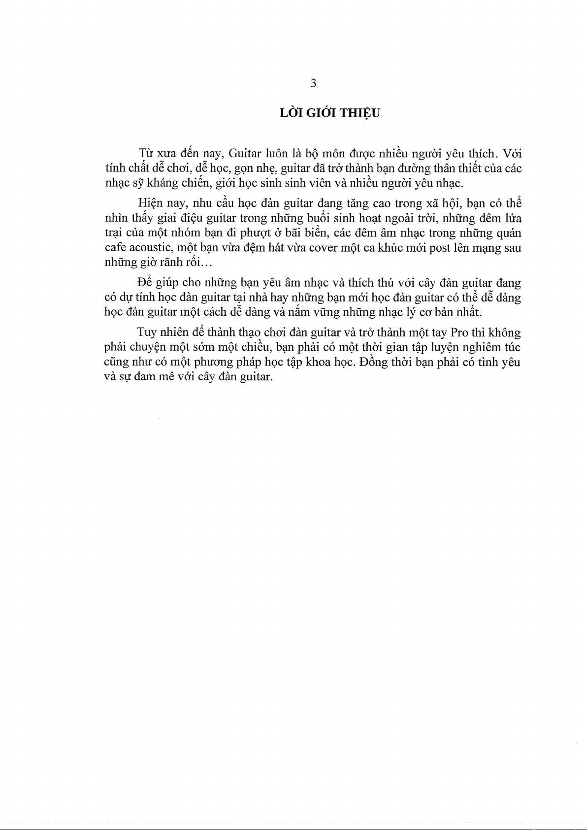 Đàn guitar từ lâu đã là một nhạc cụ được yêu thích rộng rãi bởi tính linh hoạt và khả năng tiếp cận dễ dàng, trở thành người bạn đồng hành quen thuộc của giới học sinh, sinh viên và những người yêu âm nhạc. Trong bối cảnh văn hóa hiện đại, nhu cầu học và chơi guitar ngày càng tăng cao, thể hiện qua sự hiện diện của nó trong nhiều hoạt động từ sinh hoạt cộng đồng đến các không gian âm nhạc acoustic chuyên nghiệp. Nhận thấy sự quan tâm sâu rộng này, giáo trình được biên soạn nhằm cung cấp một lộ trình học tập khoa học và bài bản, giúp người học dễ dàng tiếp cận những kiến thức nhạc lý cơ bản và kỹ thuật chơi đàn guitar ban đầu một cách tự tin, xây dựng nền tảng vững chắc cho hành trình âm nhạc của mình.