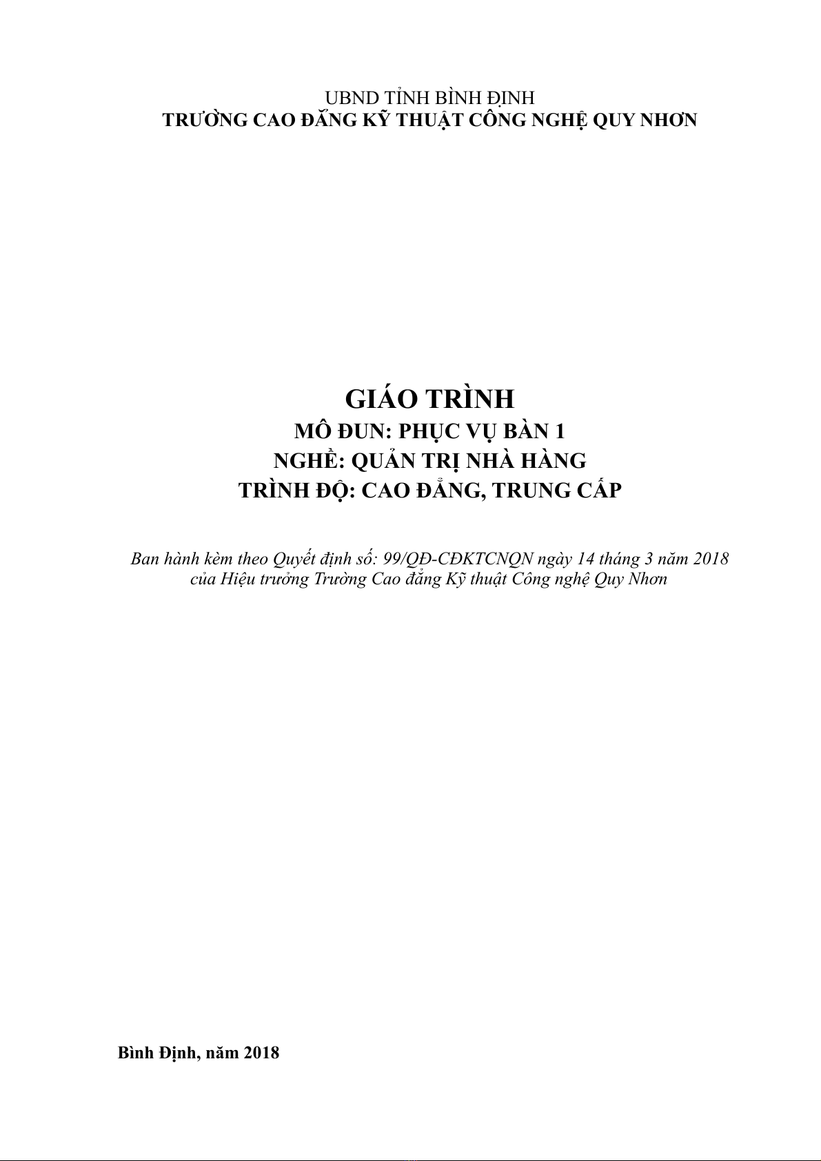 Giáo trình Phục vụ bàn 1 được biên soạn theo yêu cầu của chương trình đào tạo
