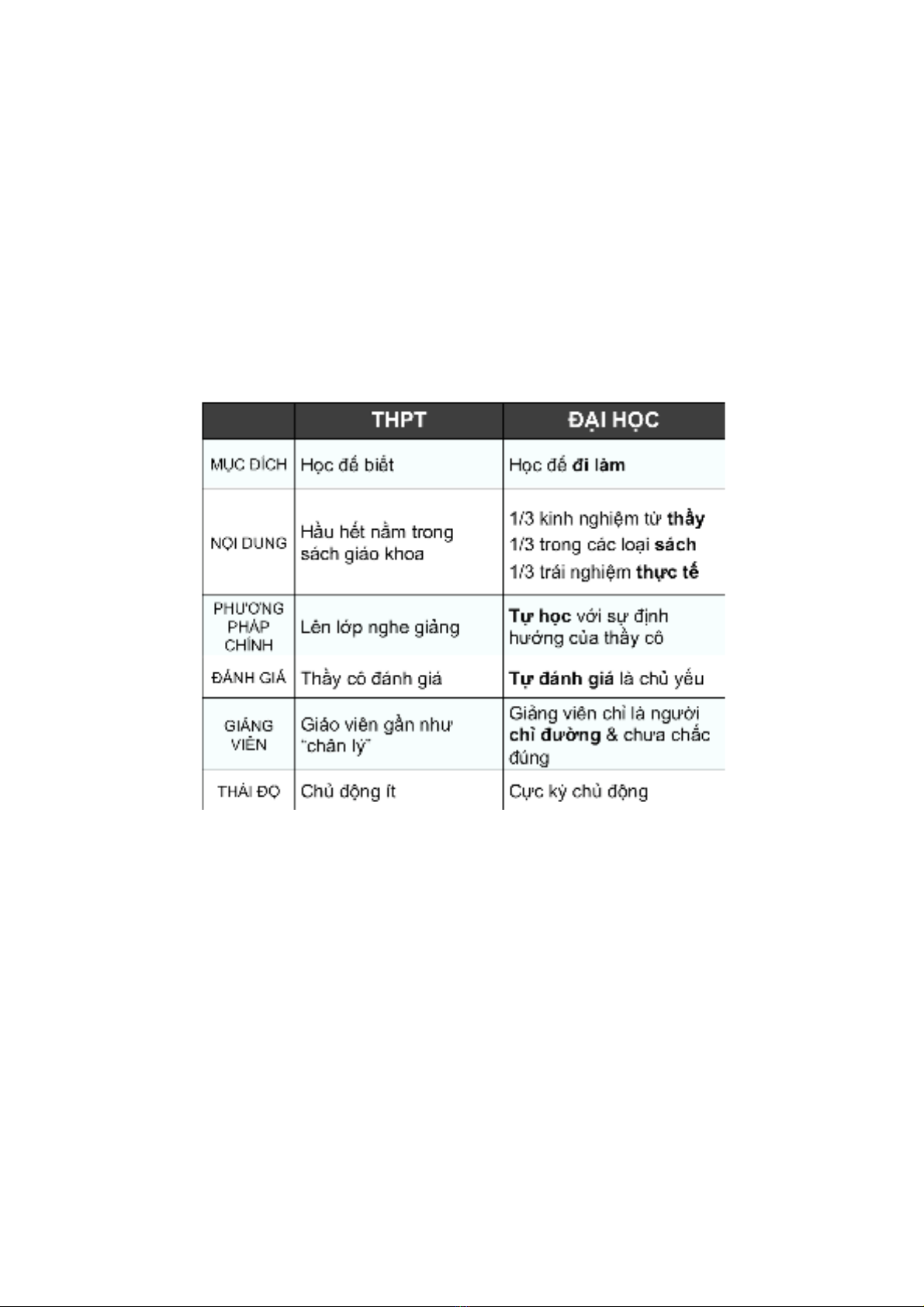 - Ở THPT, học là để biết, để phát triển trí tuệ. Còn ở đại học, học là để