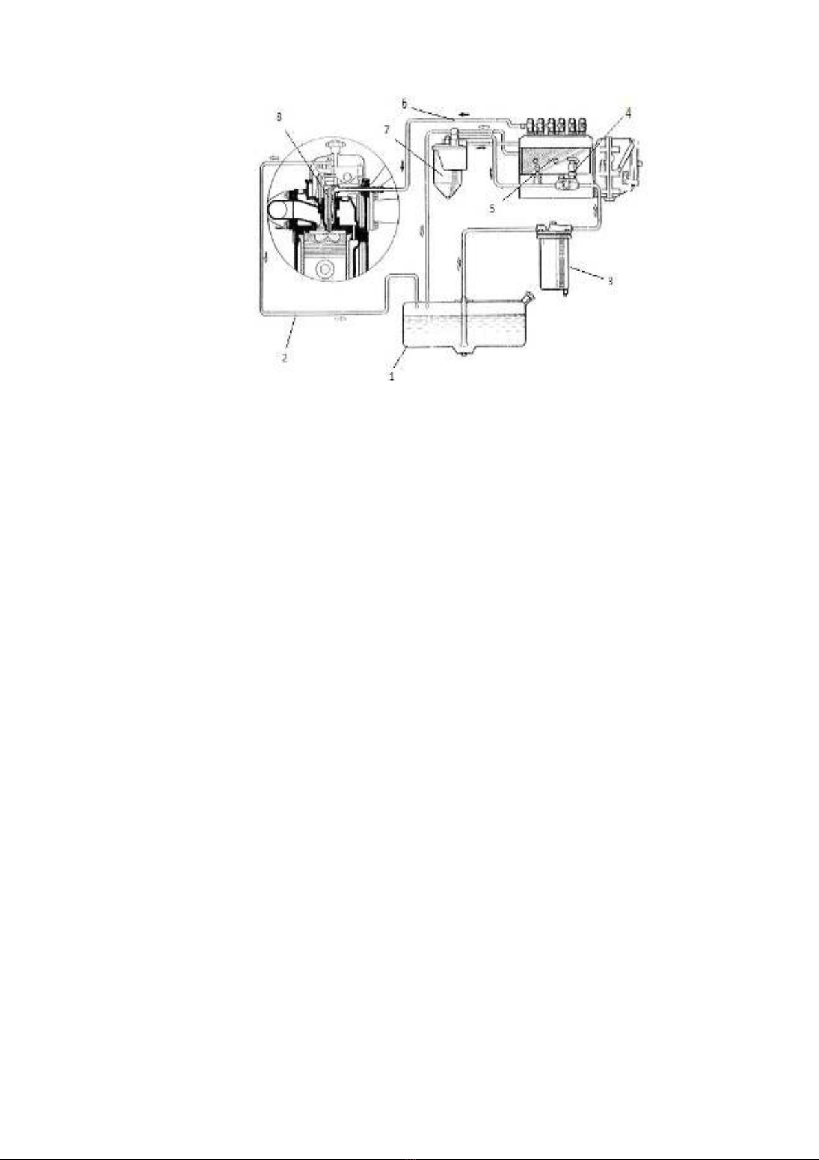 1, Thùng nhiên liệu. 2, ống dẫn nhiên liệu hồi. 3, Bầu lọc thô. 4, Bơm thấp áp
