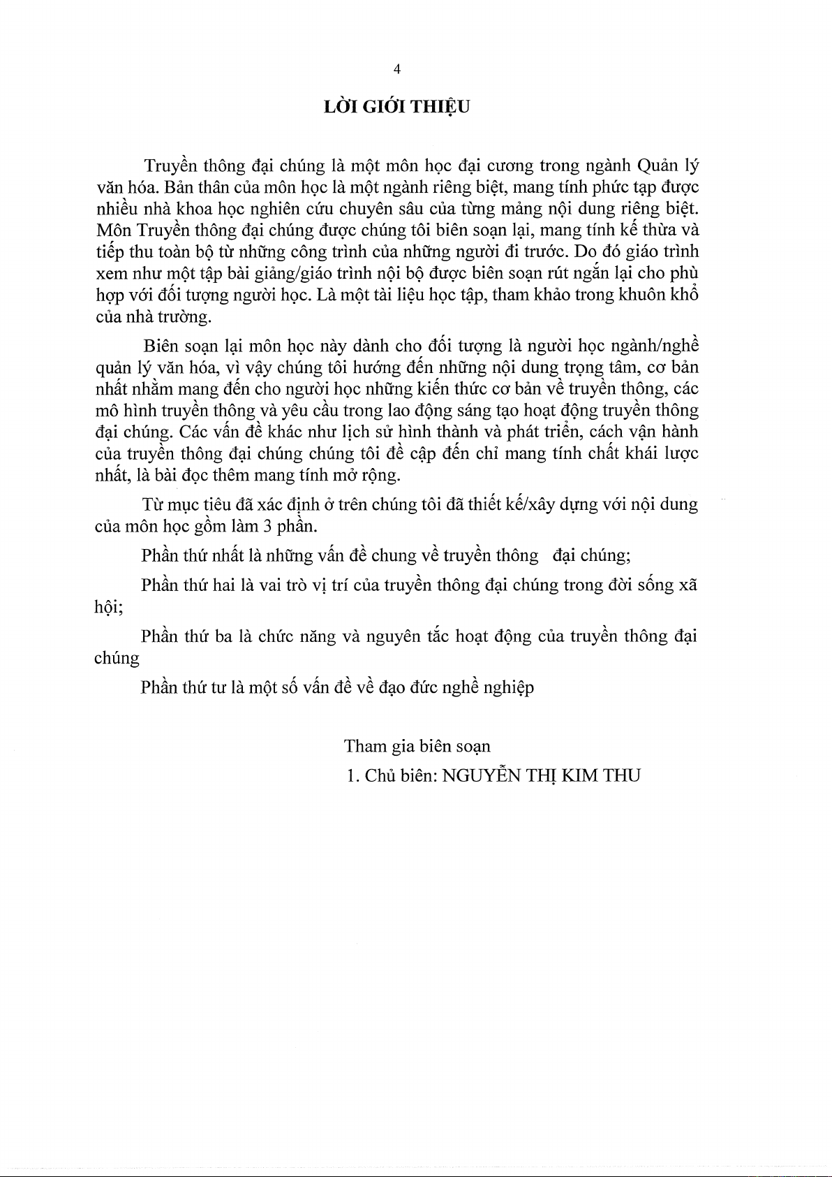 Trong bối cảnh xã hội hiện đại, truyền thông đại chúng đóng vai trò thiết yếu trong việc định hình nhận thức, lan tỏa tri thức và thúc đẩy phát triển xã hội. Là một môn học cơ sở quan trọng trong ngành Quản lý văn hóa, giáo trình này nhằm trang bị cho sinh viên những kiến thức nền tảng về truyền thông đại chúng. Từ việc hiểu các khái niệm cơ bản, mô hình truyền thông đến vai trò, chức năng và nguyên tắc hoạt động của truyền thông trong đời sống xã hội, tài liệu này nhấn mạnh tầm quan trọng của việc tiếp cận thông tin có trách nhiệm và phát triển tư duy phản biện. Mục tiêu là giúp người học có thể vận dụng hiệu quả các kiến thức này vào thực tiễn quản lý văn hóa và góp phần xây dựng một xã hội thông tin lành mạnh.