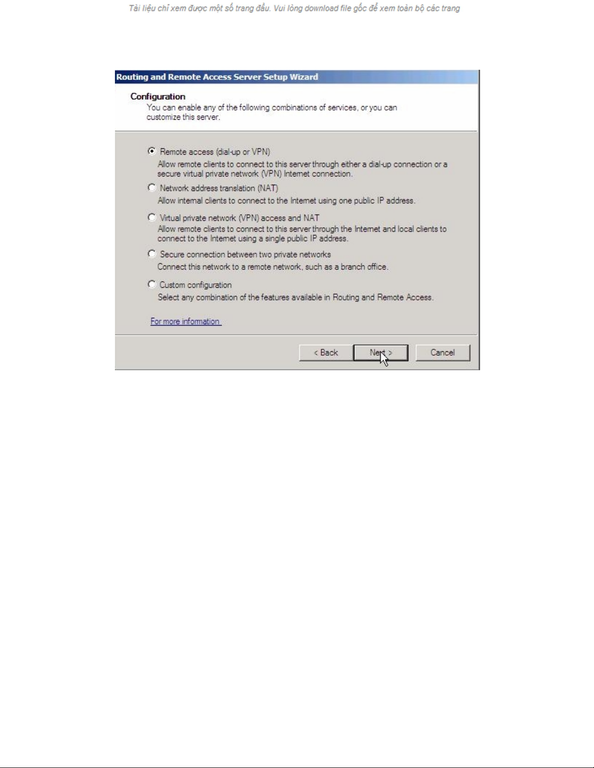 cấu hình nào bạn muốn sử dụng. Chọn tùy chọn Remote Access (dial-up hoặc