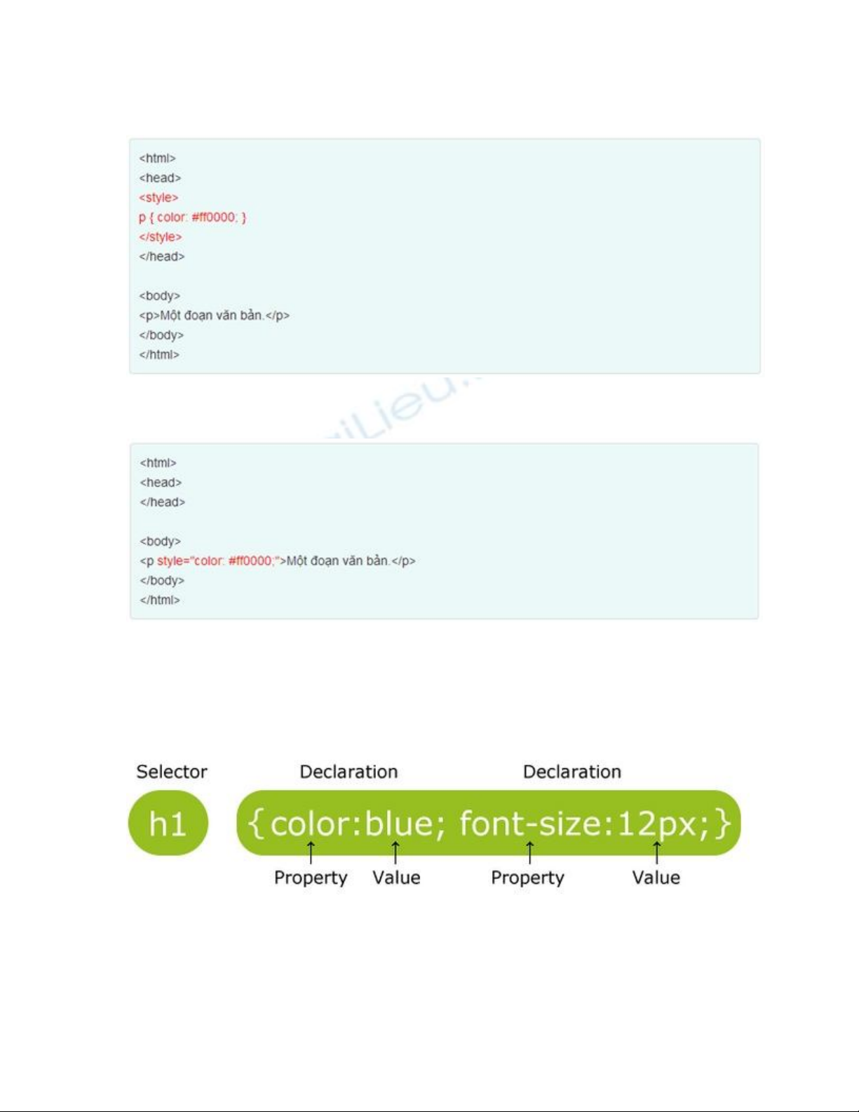 Mỗi declaration bao gồm property và value, cách nhau bởi dấu":"(hai
